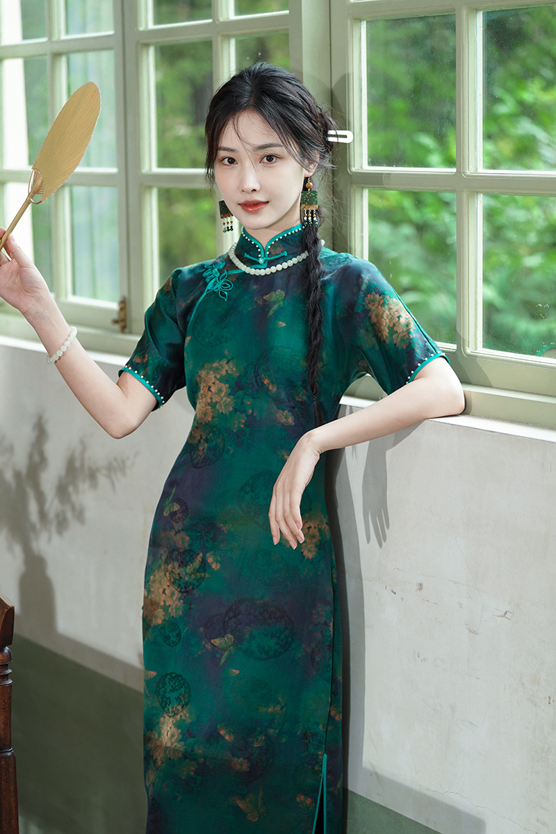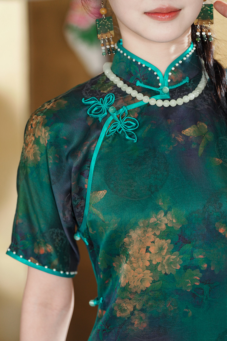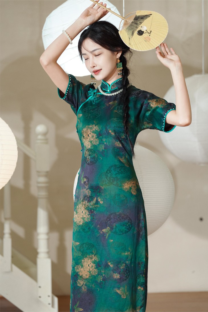 🍃“翠色连荒草,绿意入衣裳。”这件石绿色旗袍,宛如从古典山水画中走出,带着一抹清新脱俗的冷清气质。它的颜色,是远山含翠,是碧水涟漪,是大自然最温柔的馈赠~