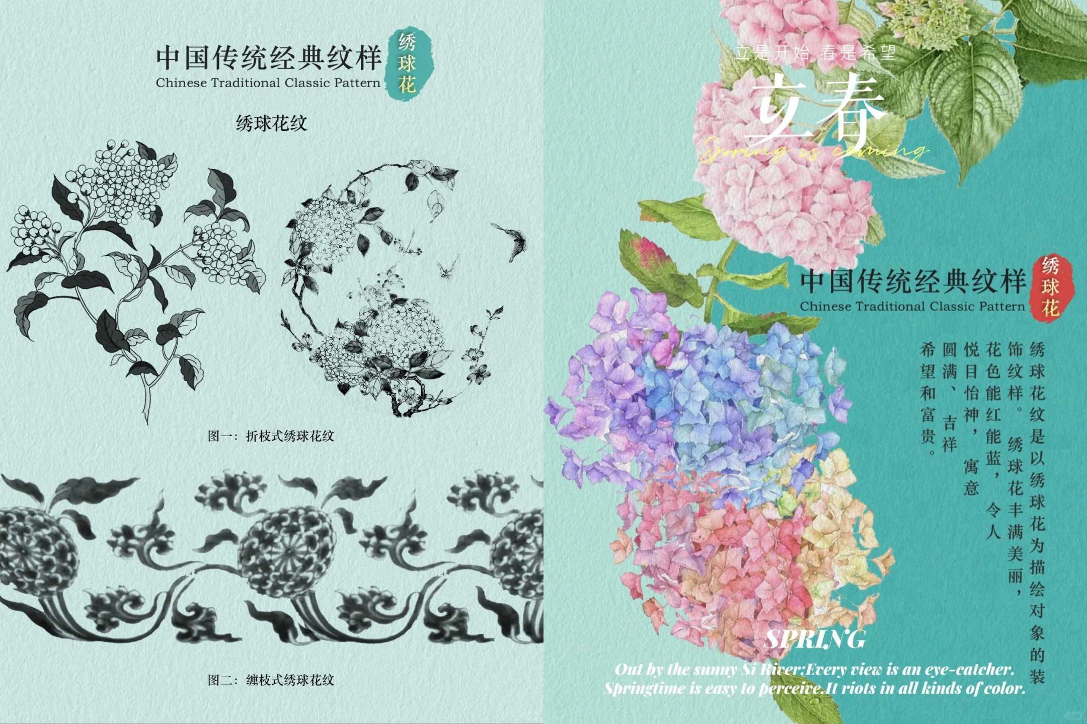 绣球花多和其它花卉组合出现,如与梅花组合寓意坚毅吉祥,富贵美满等。绣球花常以盛放花朵状出现,多呈折枝式或缠枝式,也有希望和丰盛的寓意。