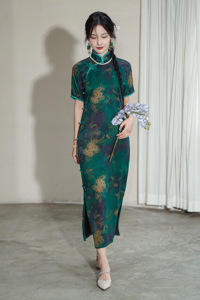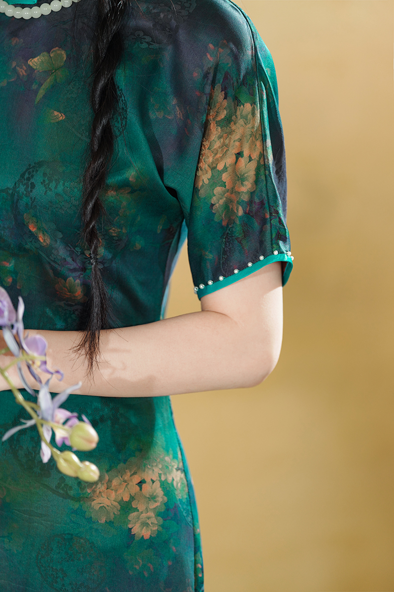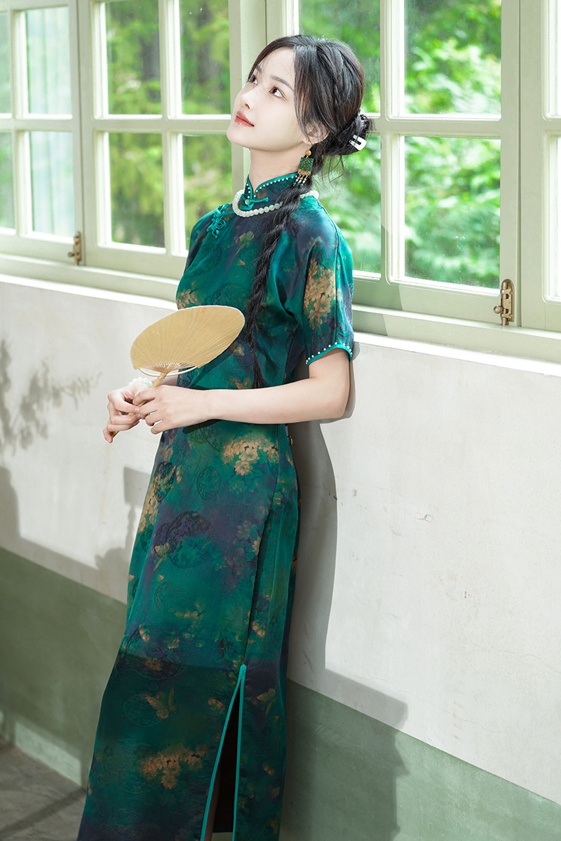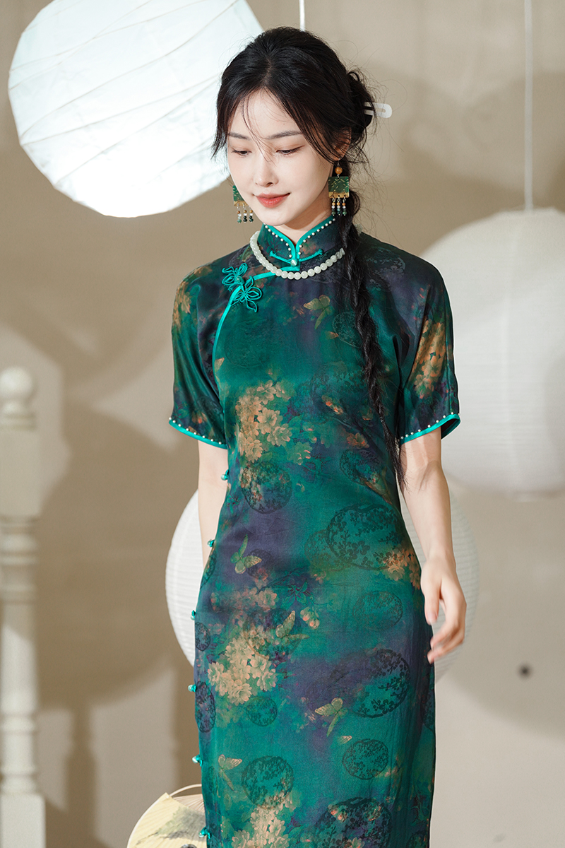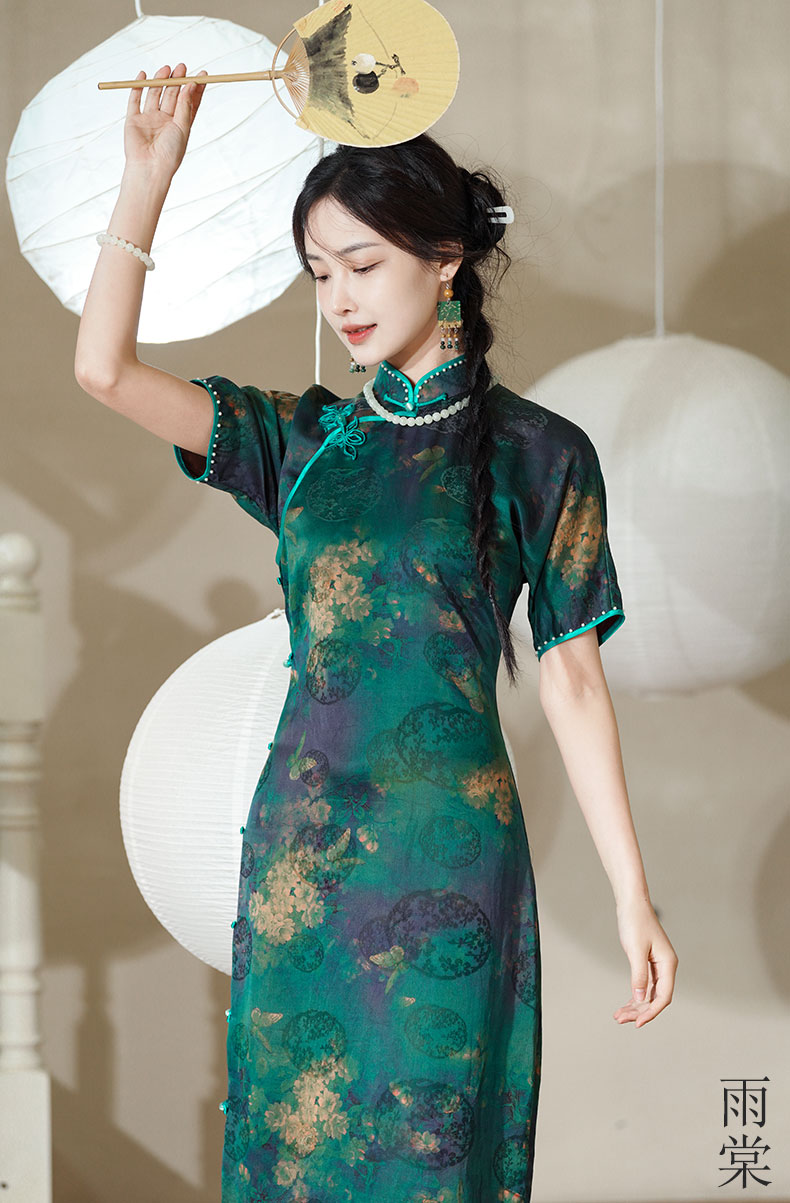 逸红颜明月优选 #『雨棠』重磅限量款!!纯手工高定钉珠红云纱旗袍,清新石绿蝶恋花,高贵典雅
