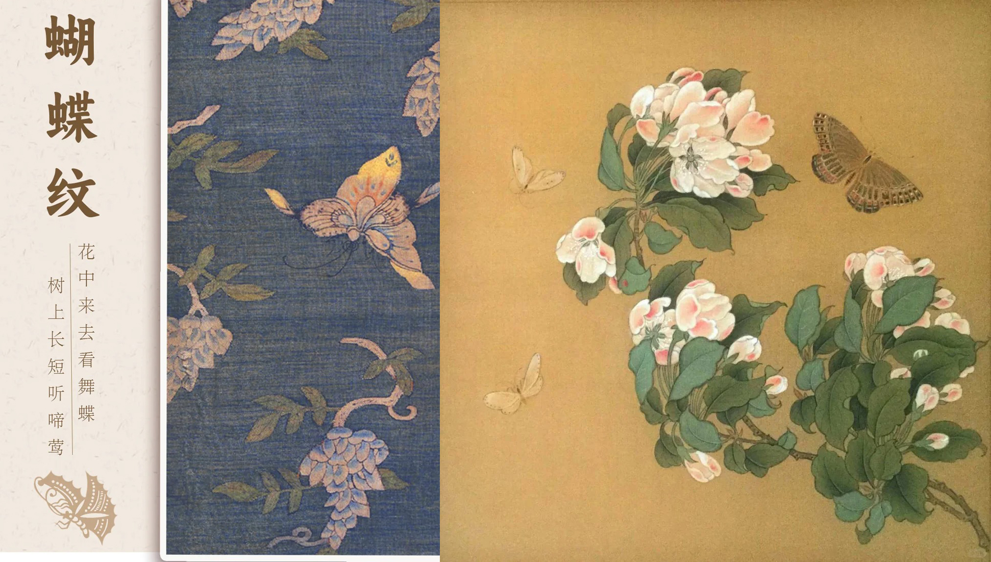 “蝶恋花”纹样为花间飞舞嬉戏的蝴蝶,以各种花卉与蝴蝶搭配来寄托对美满幸福的爱情的追求