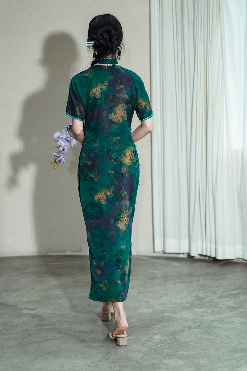 梅花/绣球/蝴蝶,在裙身上构成一幅花香蝶梦图,衣着夏雨般青绿色调红云纱,将华贵典雅隐入自然之气韵,作为浪漫的新·东方女性,我们有着属于自我的文化底蕴。