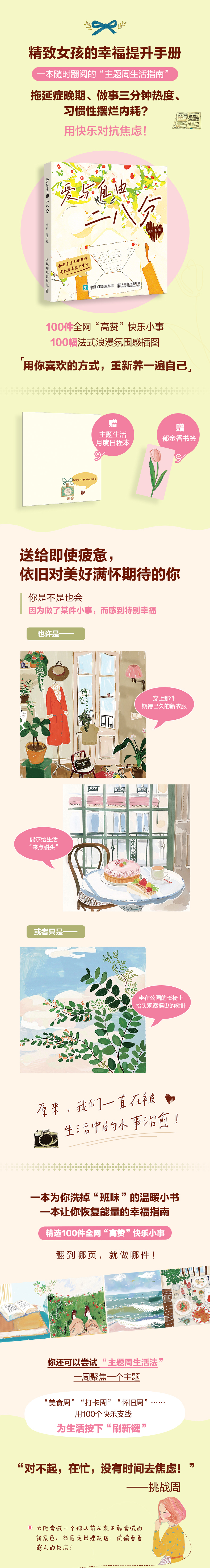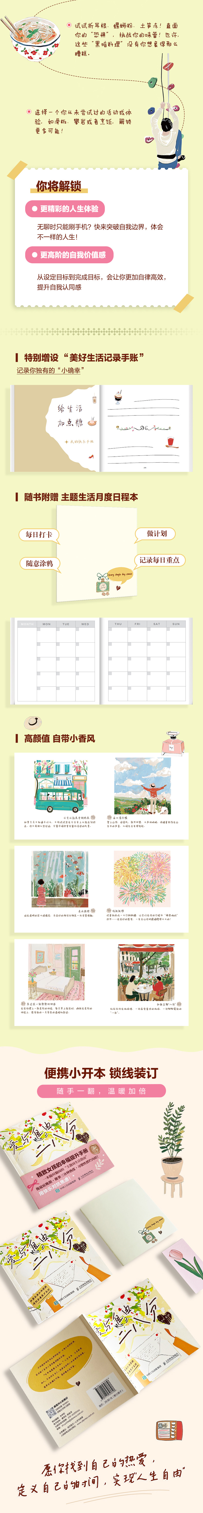 不知道你有没有这样的经历:心情不好的时候,因为做了某件小事而感到特别幸福。 当你感到沮丧、内耗时,与其自怨自艾,不如做一些轻松、简单的小事,为自己快速充电、改善情绪。 本书分为两大部分:*部分精心筛选了100件*小事,比如做一顿精致的早餐、迎着夕阳骑行、观察树叶的形状等,这些小事贯穿在日常生活中,也会在不知不觉中*自己……配合书中100幅清新唯美的插图,相信它能为你带来*的好心情!如果你有更好的想法和体验,*部分则是专为你定制的“美好生活记录手账”,你可以把自己独有的“小确幸”记录上去,或者写一写感恩日记,一定会让你收获满满的幸福感。 “生命唯愿爱与自由。”人生匆匆,与其取悦他人,不如快乐自己。愿你找到自己的热爱,定义自己的时间,实现“人生自由”。