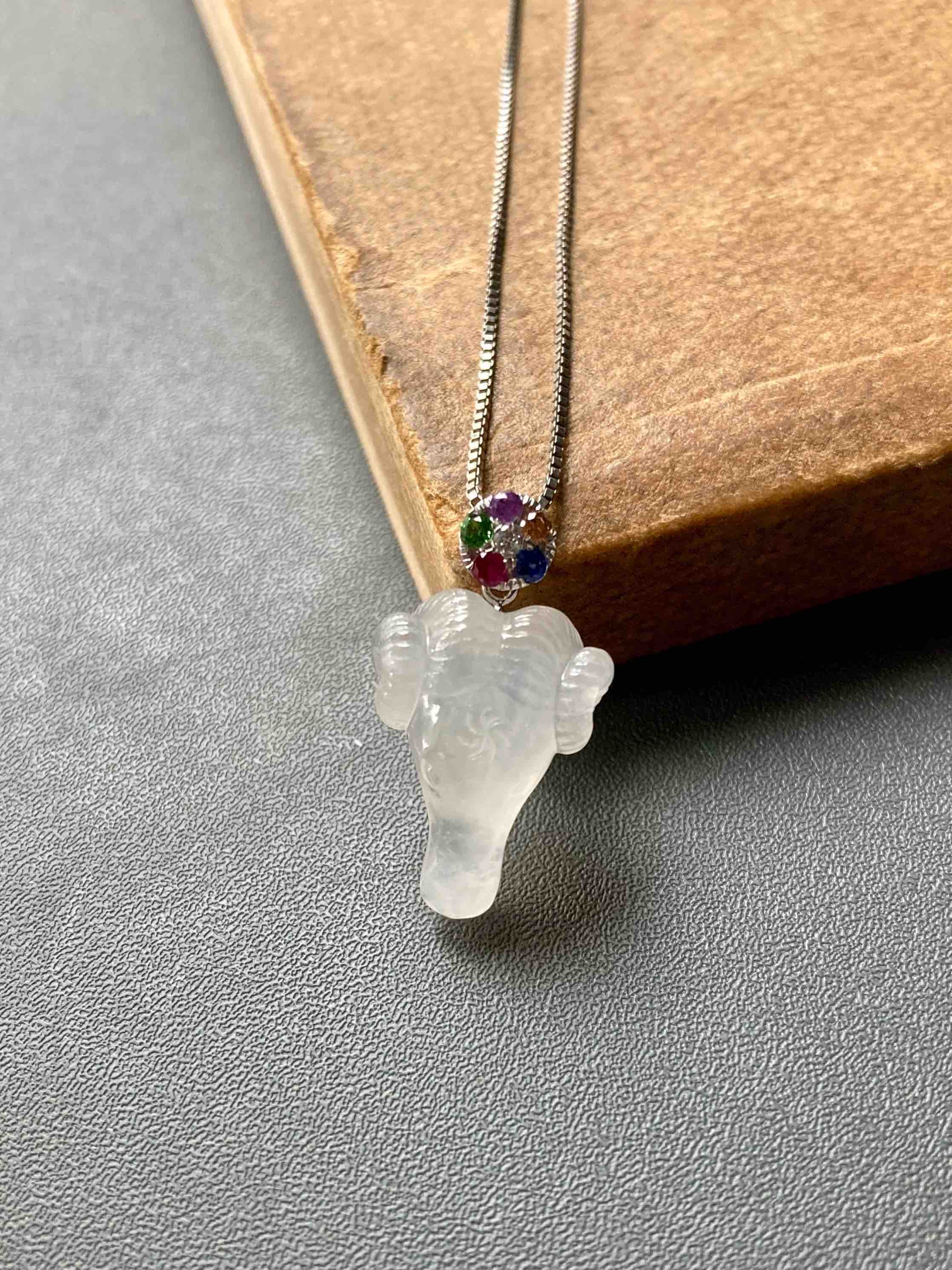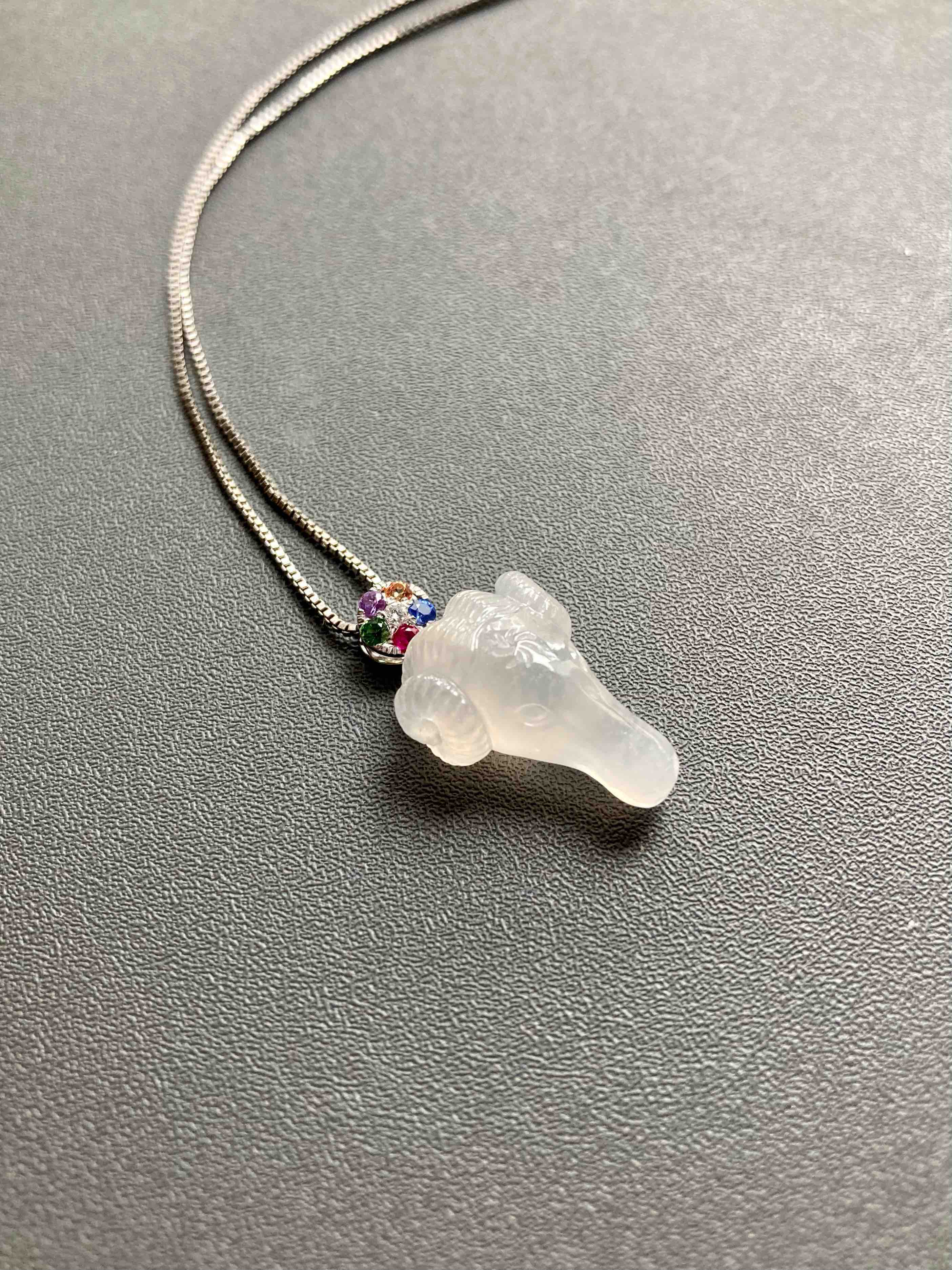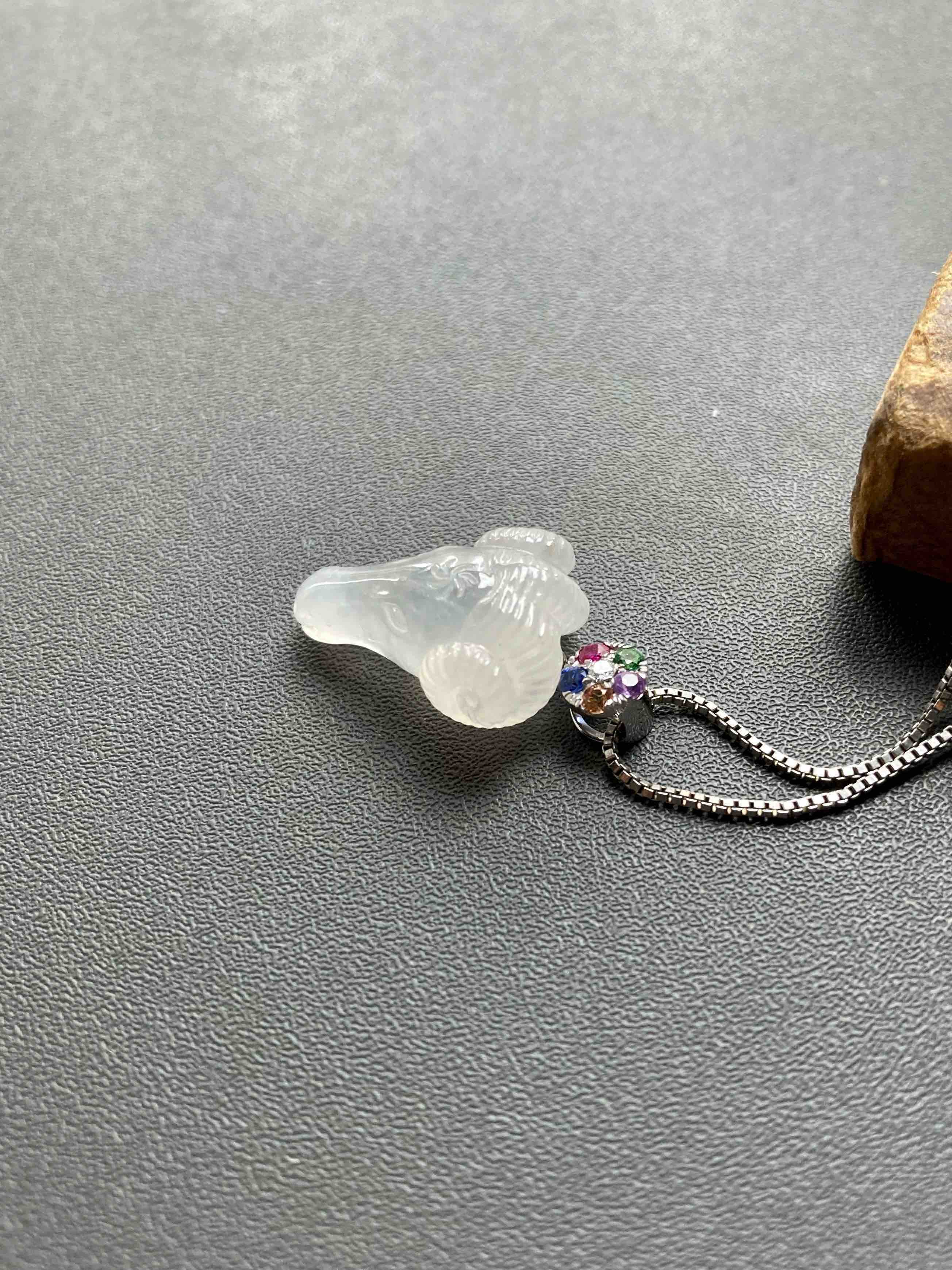 属羊的小伙伴也有专属特别宝贝了,冰种精雕翡翠羊🐏,种水晶莹剔透,尺寸饱满立体,看这雕工有多精美,18k白金钻石五色宝石镶嵌扣头,美极了,保平安之物推荐,裸石19.3×13.8×8.4mm,镶嵌后25×13.8×8.4mm