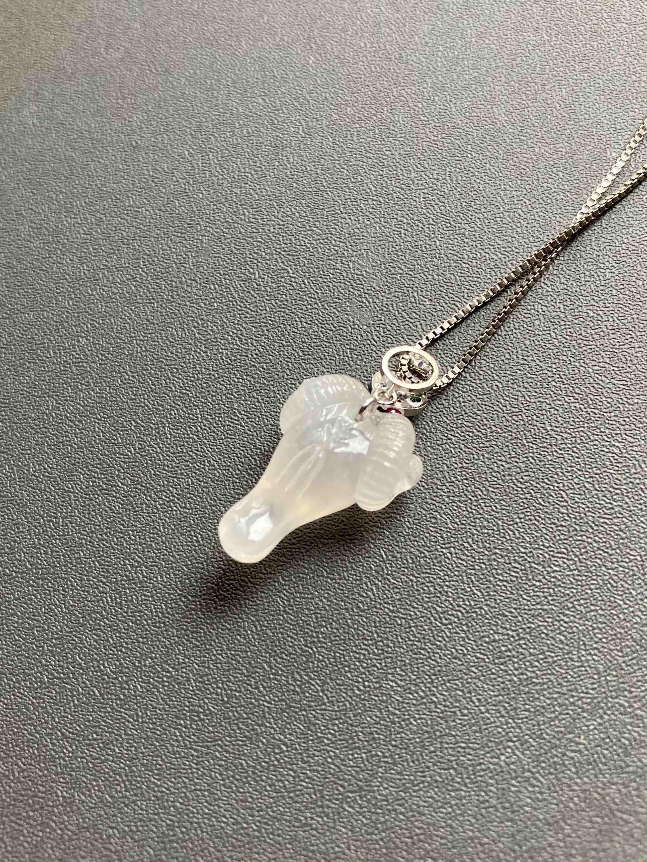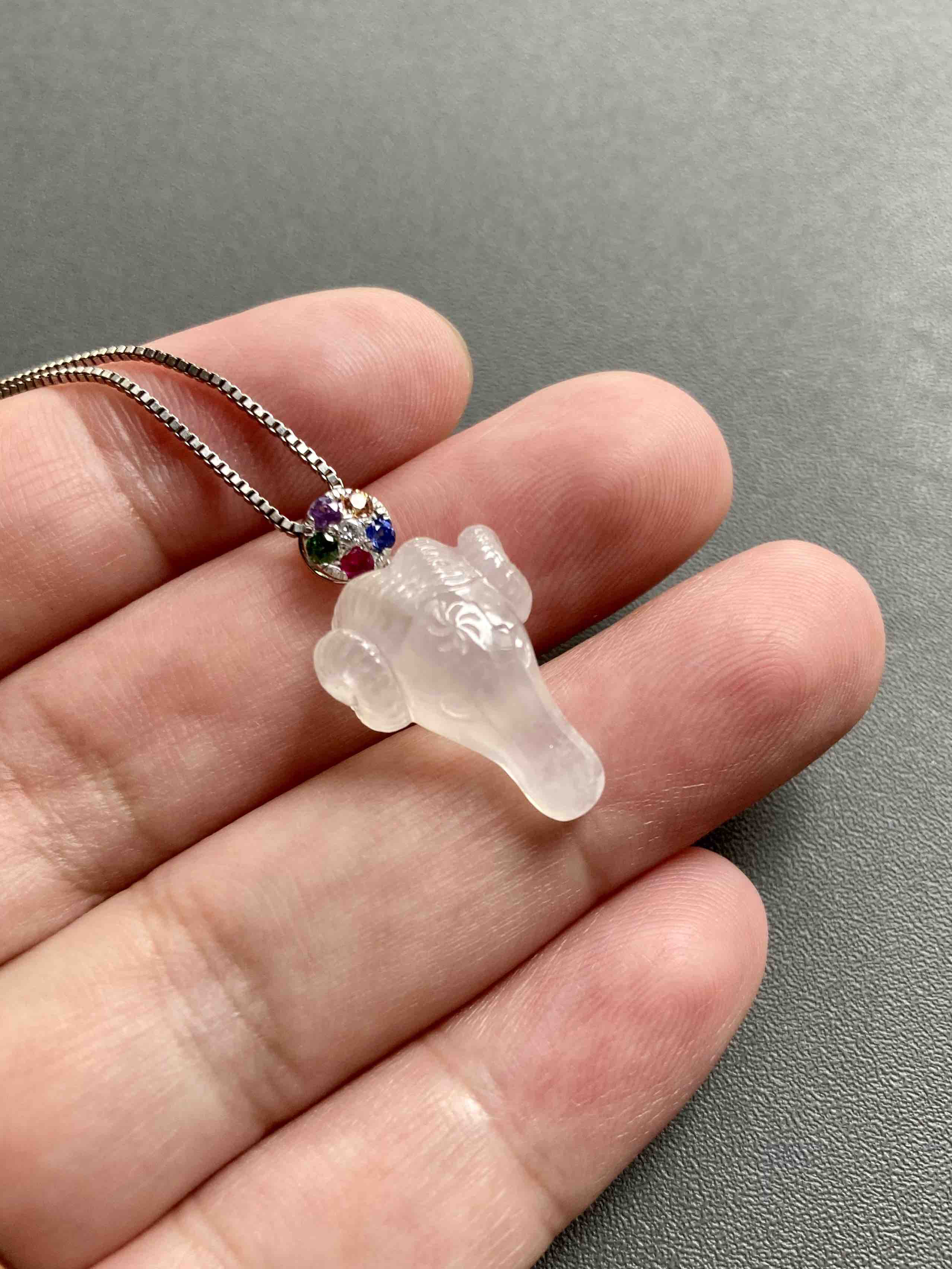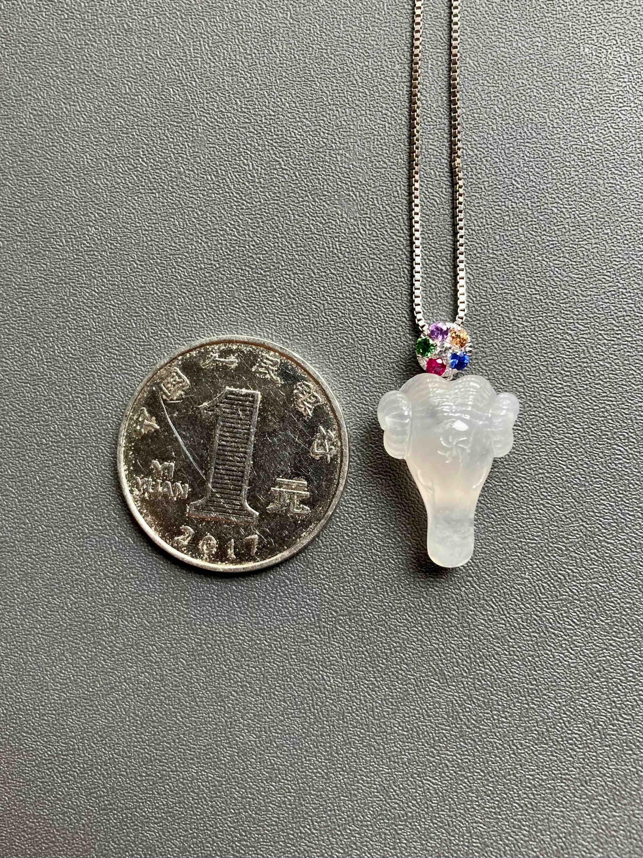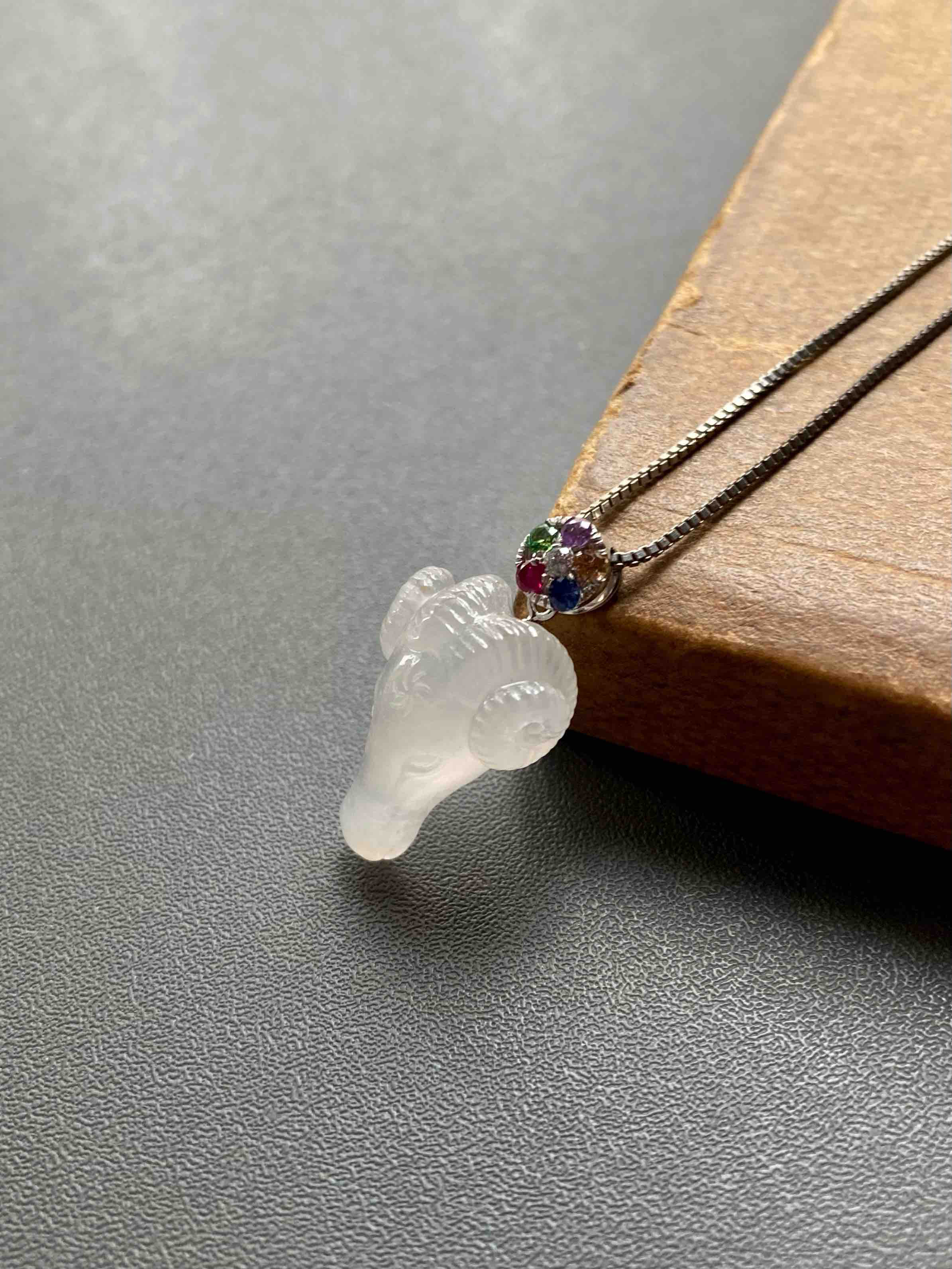 属羊的小伙伴也有专属特别宝贝了,冰种精雕翡翠羊🐏,种水晶莹剔透,尺寸饱满立体,看这雕工有多精美,18k白金钻石五色宝石镶嵌扣头,美极了,保平安之物推荐,裸石19.3×13.8×8.4mm,镶嵌后25×13.8×8.4mm