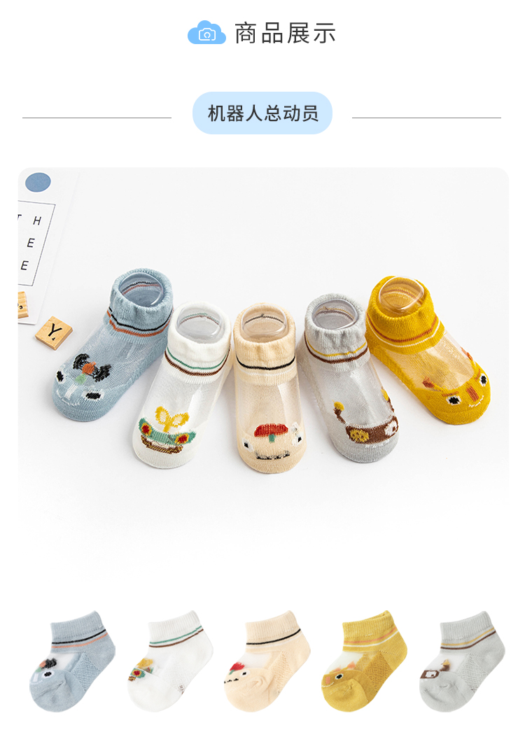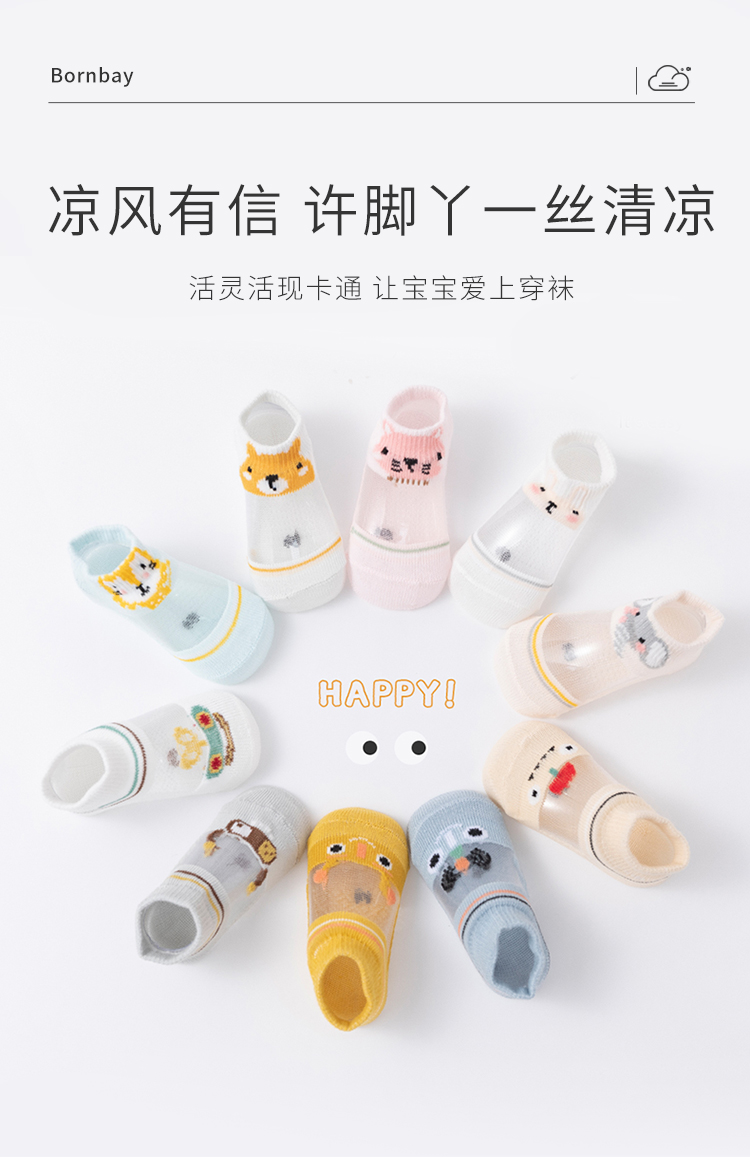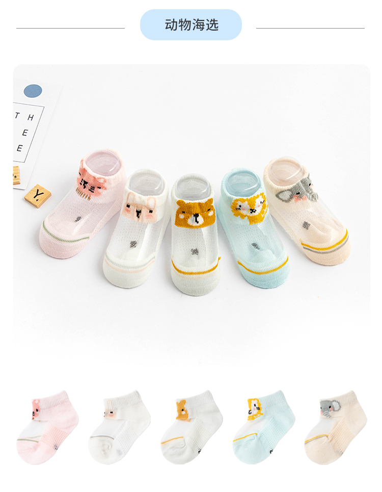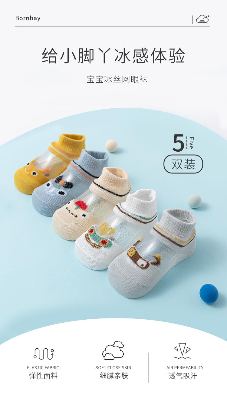 贝贝怡男女宝宝夏季透气冰丝网眼袜子婴幼儿地板短袜5双装