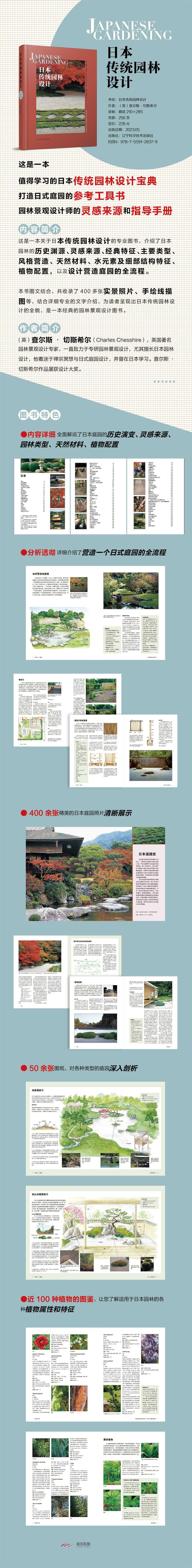 这是一本关于日本传统园林设计的专业图书,介绍了日本园林的历史渊源、灵感来源、经典特征、主要类型、风格营造、天然材料、水元素及细部结构特征、植物配置,以及设计营造庭园的全流程。