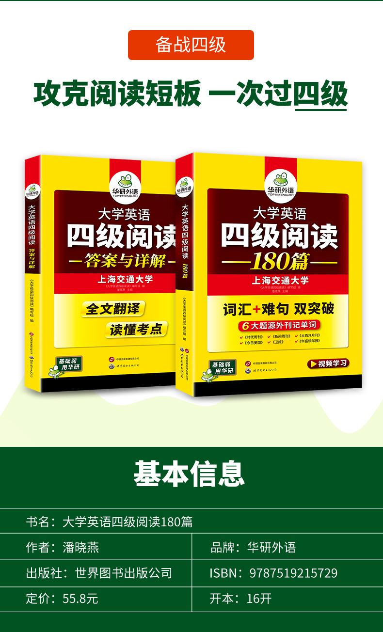 1.大学英语四级阅读180篇,两册装,解析单独成册,方便对照学习;