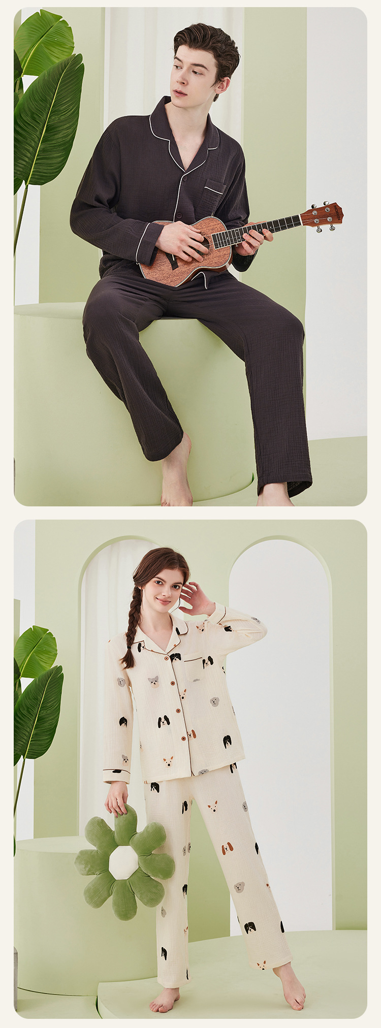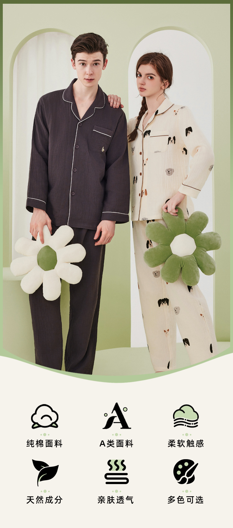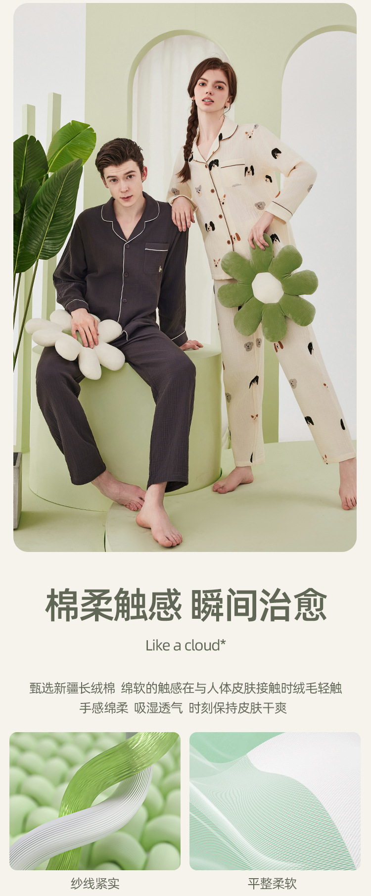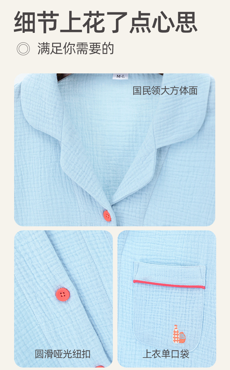 A类双层纱绉布 100%长绒棉纯棉面料睡衣套装 可外穿情侣睡衣 纯棉女士家居服套装