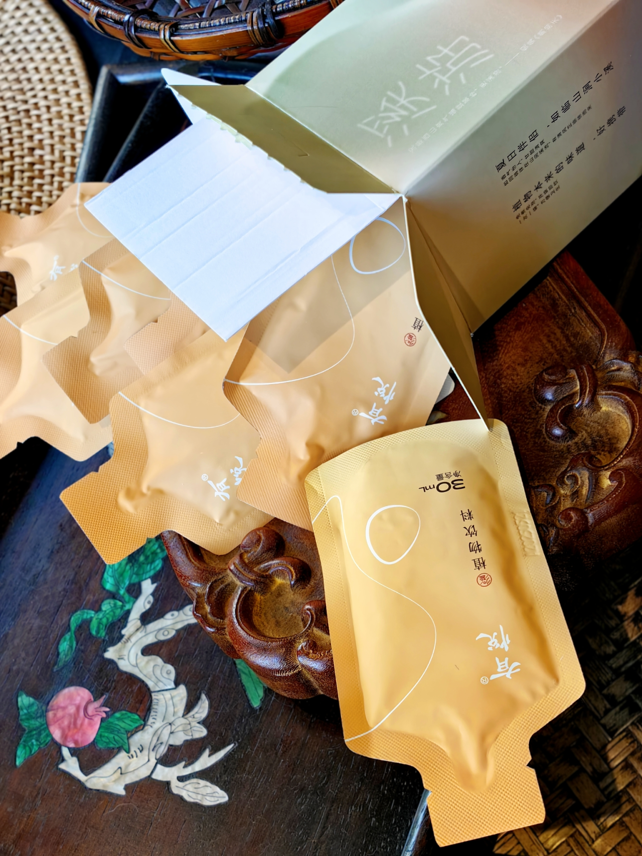 五指毛桃藿香饮是清新的绿盒,里面有7小袋。随手撕开就能品尝到酸甜的口感,一口下去,虽然甜甜的,但糖分仅相当于1/8个苹果,还可以加水哦,就更淡一些些。。。控卡人也可以放心喝,远离让人困顿的湿气!