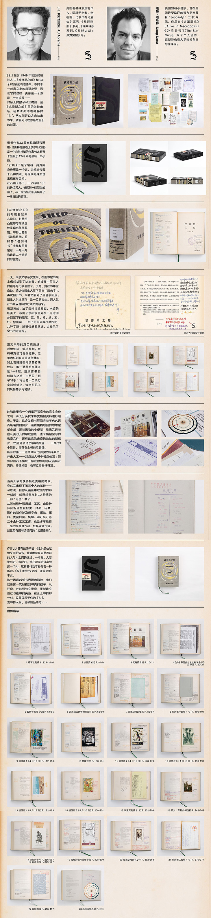《S.》包含精装古书《忒修斯之船》和23个材质各异的附件,这是两人穿越时空留下的手资料,也是你参与这一趟冒险的重要线索,你将成为悬疑事件的一分子,和两人一同揭开文坛危险的秘密。