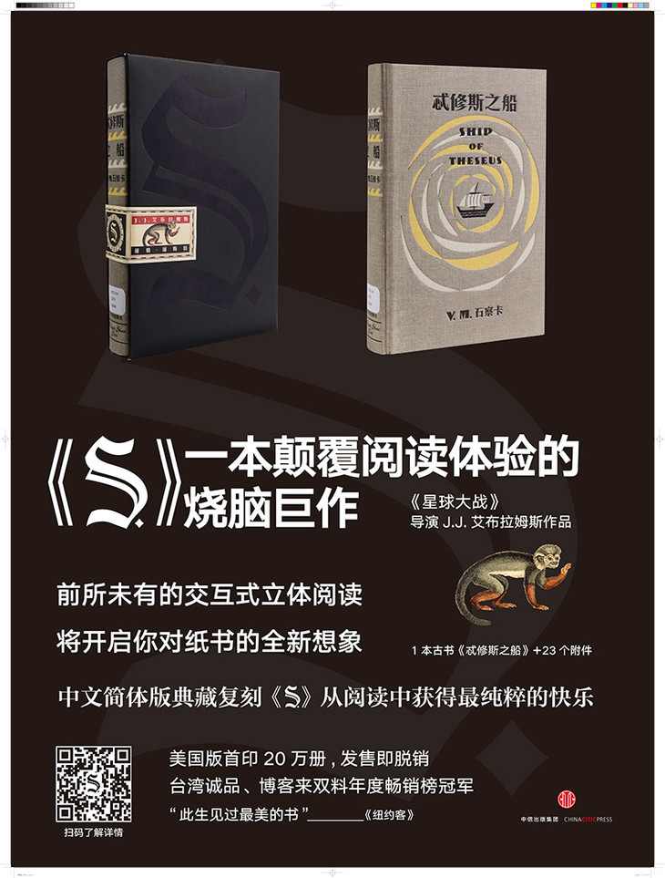 《S.》美国版一经推出,20万册首印,上市即断货;台湾版则占据当年诚品书店、博客来全年畅销榜总;全世界纸书爱好者、悬疑推理小说爱好者为之疯狂,纷纷将《S.》视为想要收藏的一本书;网友们为它建立网站,掀起一股解谜狂潮……J.J.非常肯定,这场前所未见的纸本书阅读之旅,将是其他传播媒介永远无法复制的美好体验。