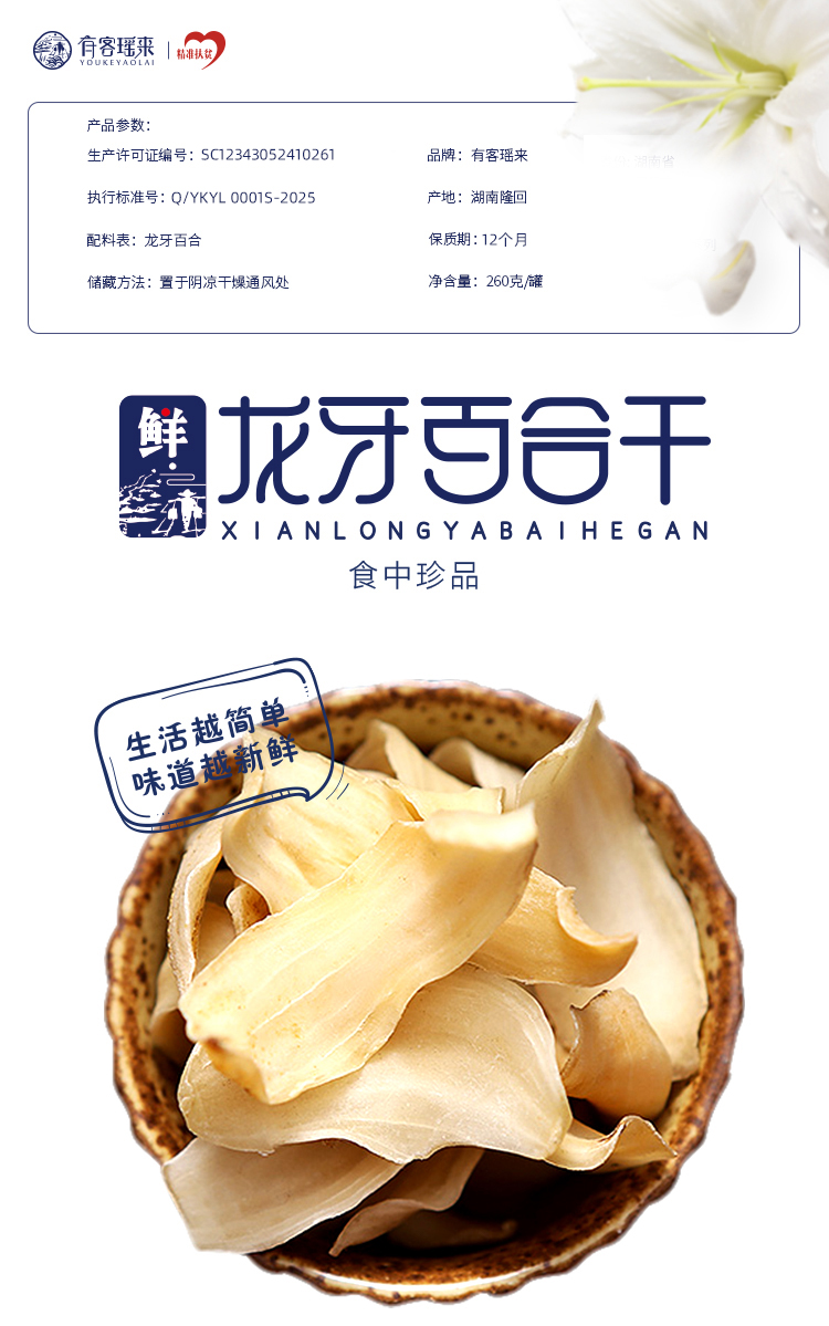 百合干的保质期,通常是半年甚至一年,但是如果防潮防虫措施没做好,提前坏掉的几率会很高。所以每隔一周或者两周,有好太阳就把百合干拿出来晾晒几个小时,干燥度差不多的时候,再把它们收到密封罐里即可,平时可以放在阴凉、干燥、通风的地方,如果天气湿热,则考虑放在冰箱冷藏。