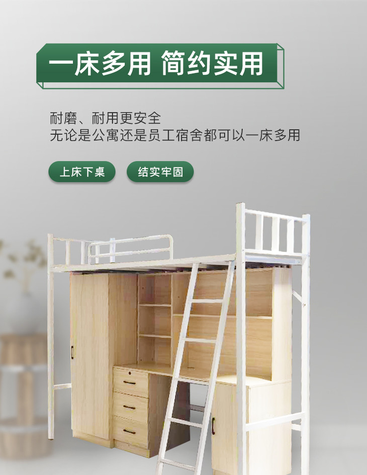 床架采用高强度镀锌管制作,为品质金属,经久耐用;表面细腻打磨,圆润光滑,做烤漆处理,质感光亮,美观大气,不易掉漆;加长加高护栏,睡觉更加安心,可以有效的保护我们的安全;柜子分层储物,可摆放书本,饰品,电脑等物件,桌面整洁有序;设有三个抽屉,方便客户收纳物品,将物品合理分类收集,利于寻找;抽屉上设有锁具,保障了私人重要物品的存放。