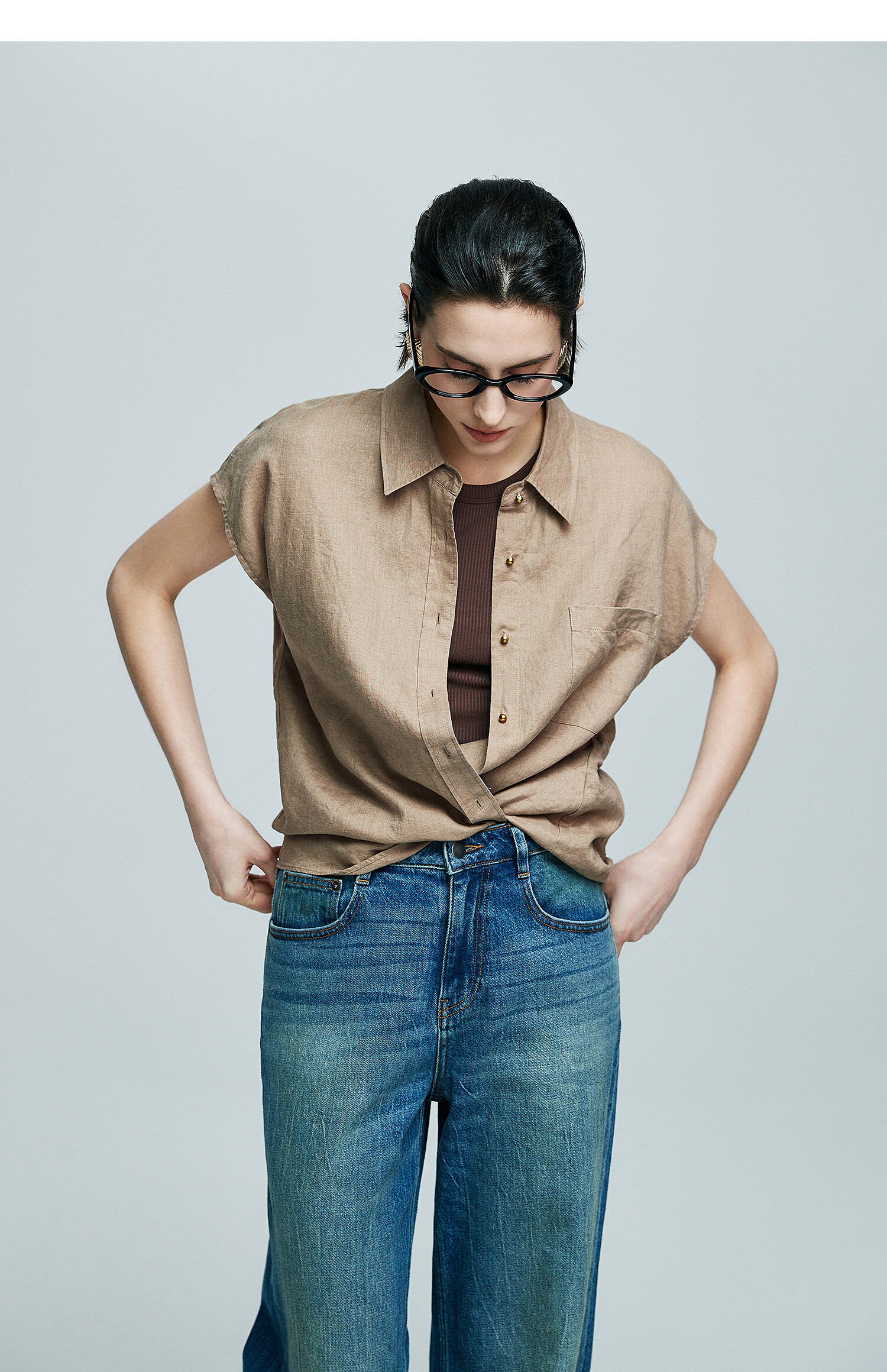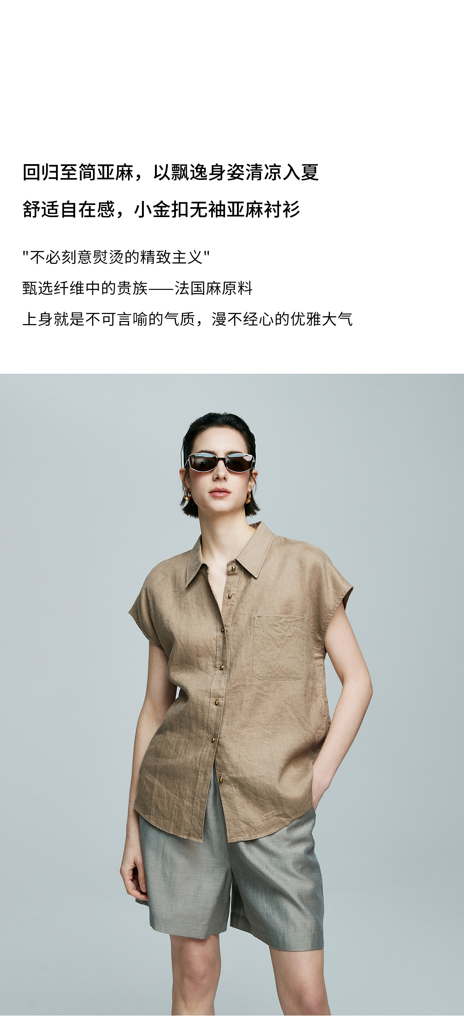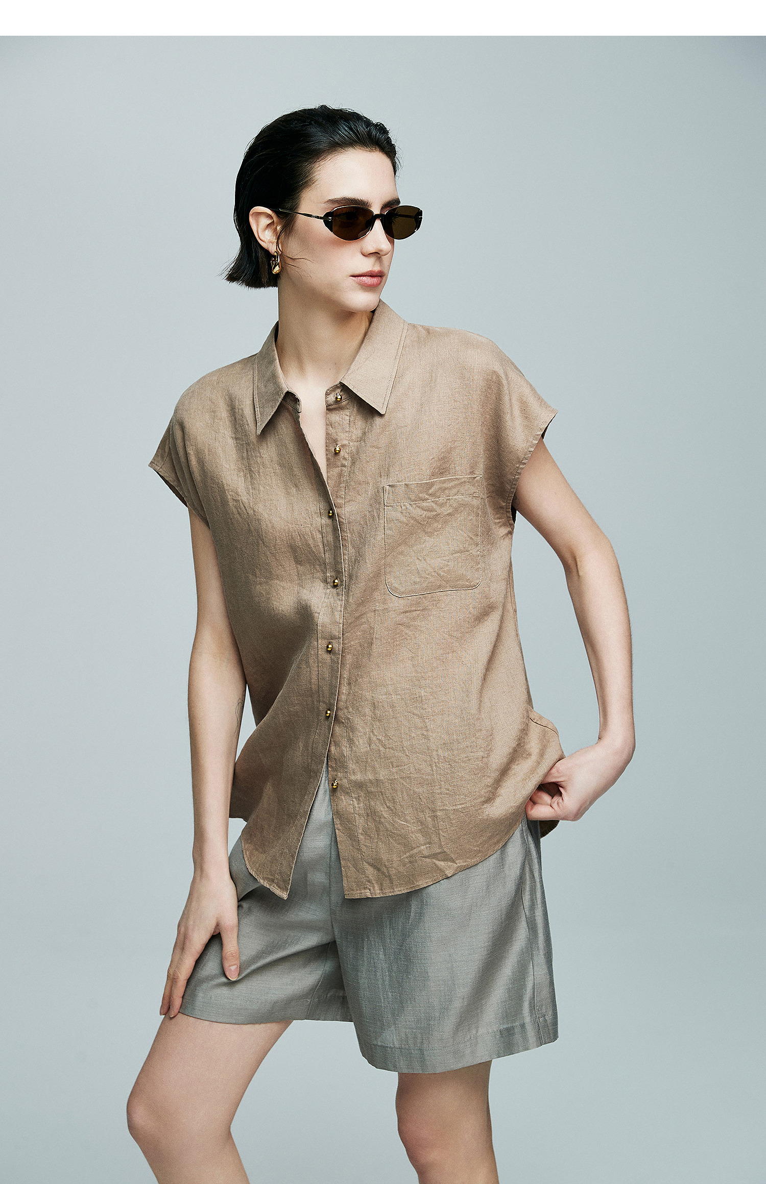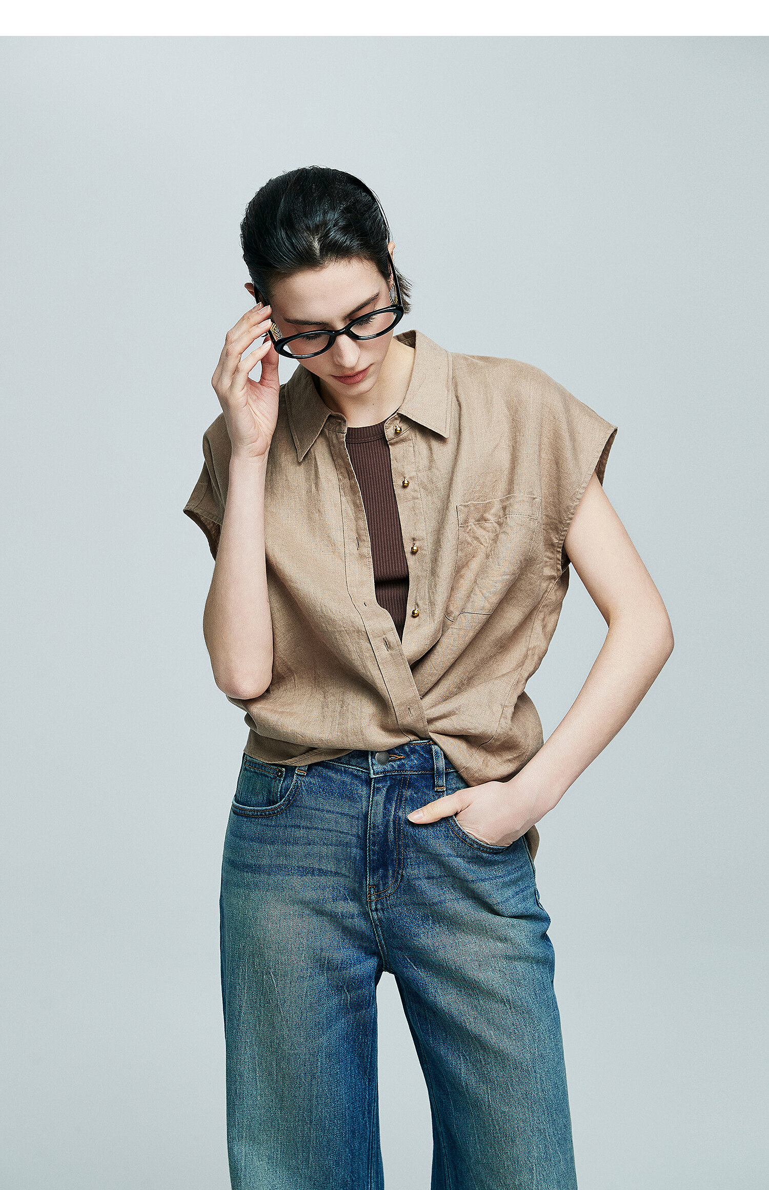 棉仓363604012-初棉无袖口袋小金扣宽松版亚麻衬衫