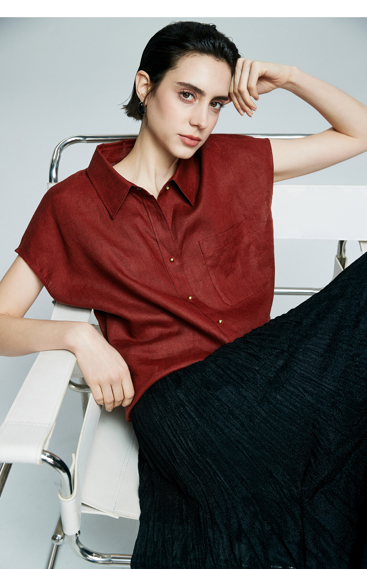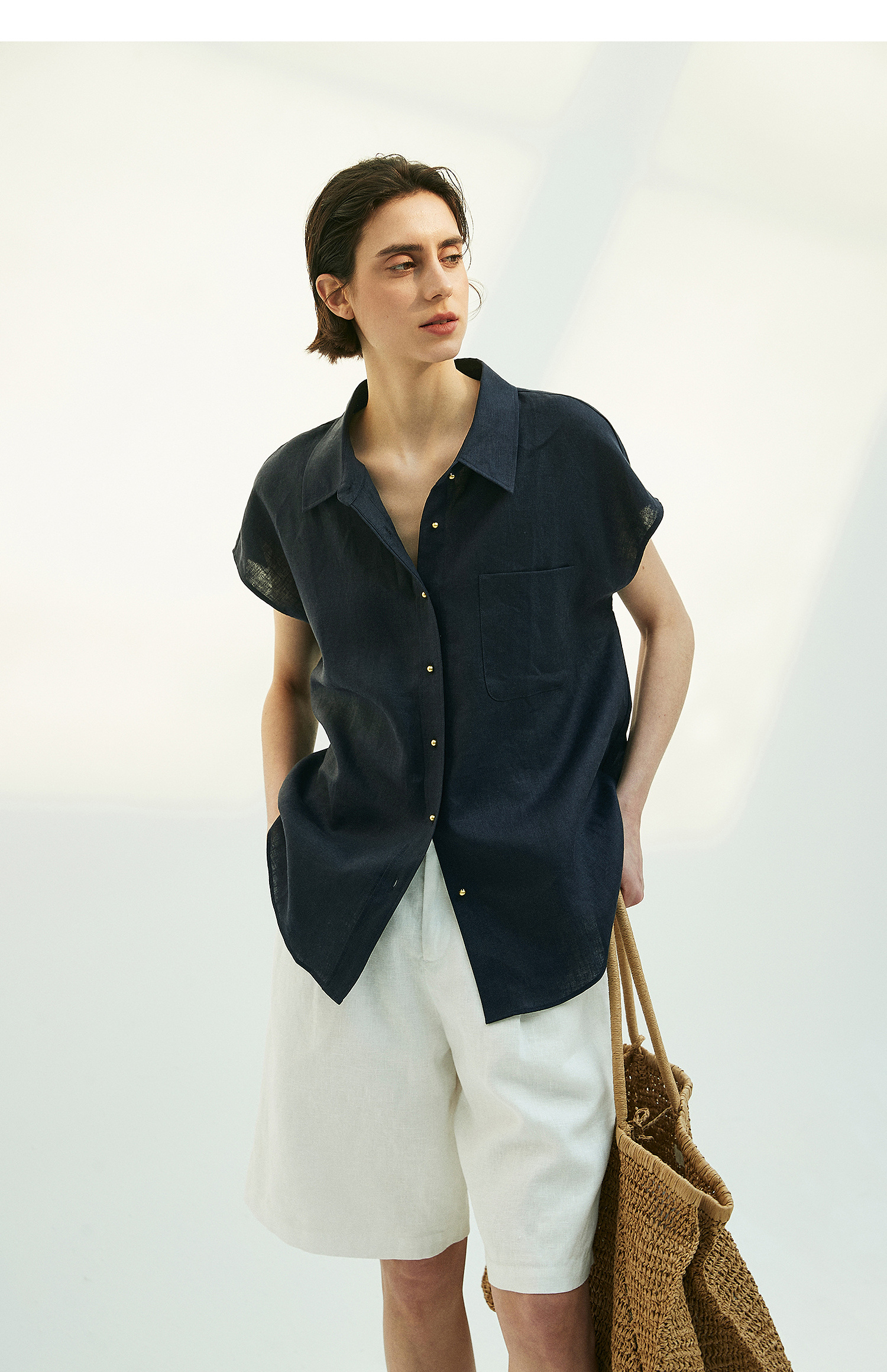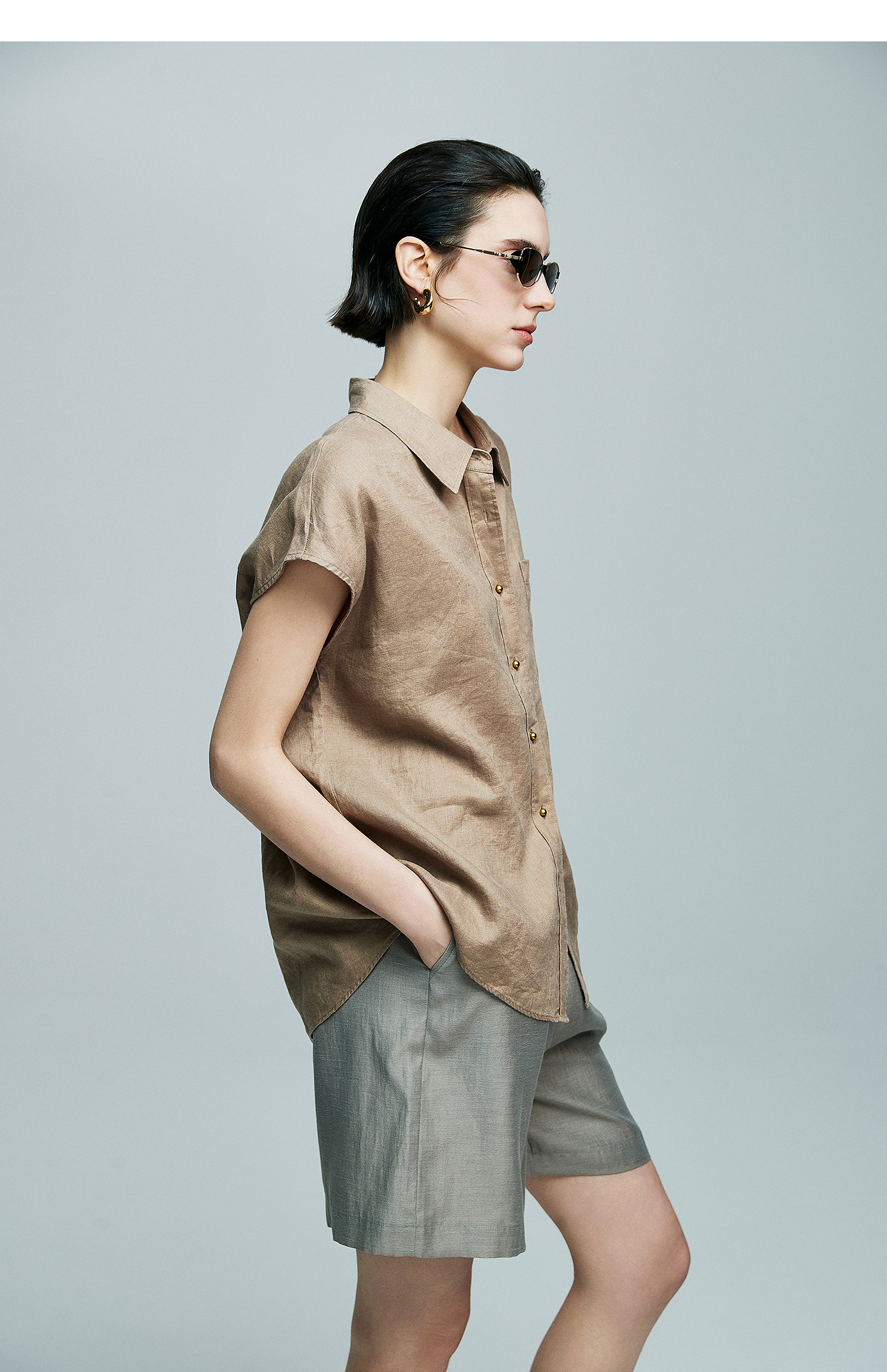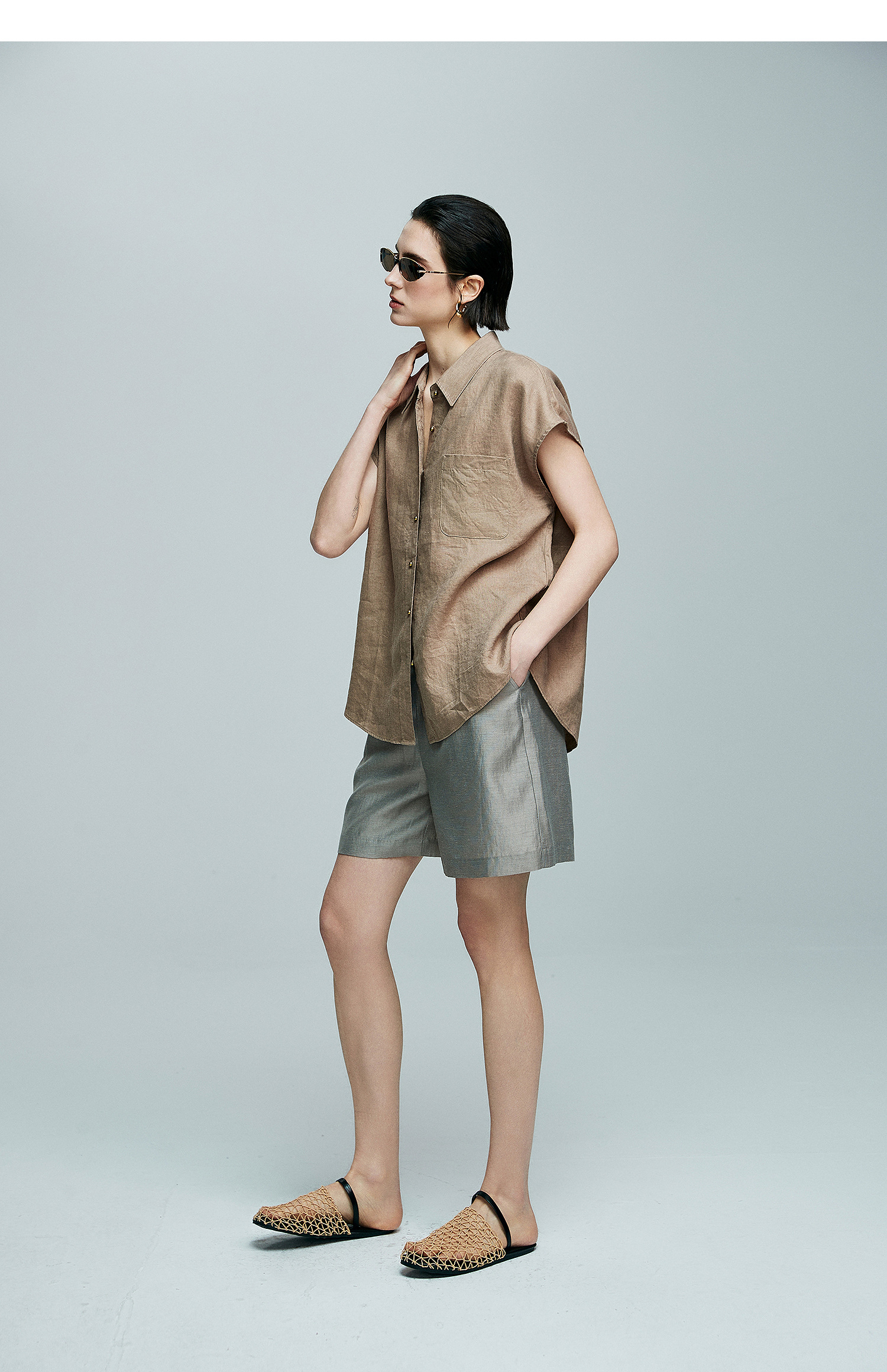 棉仓363604012-初棉无袖口袋小金扣宽松版亚麻衬衫