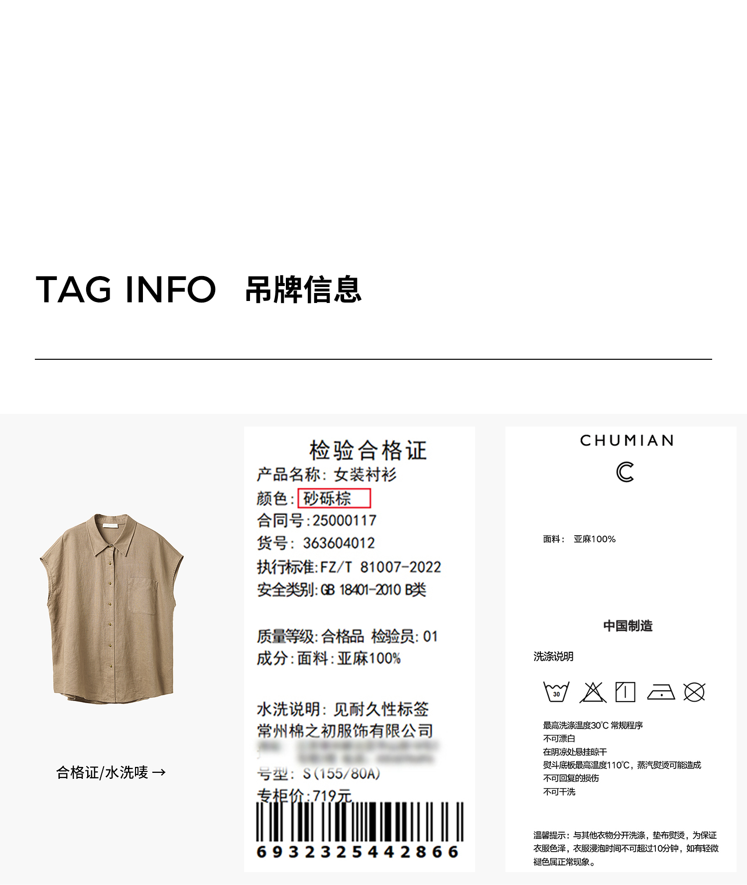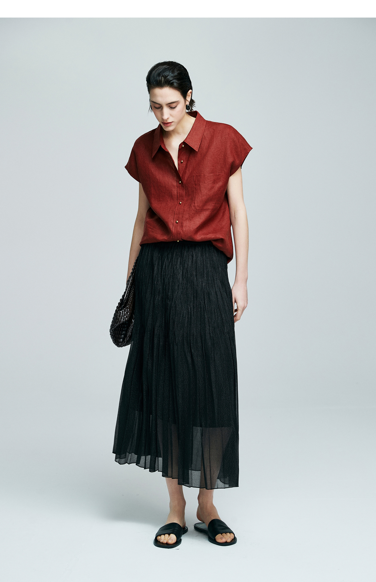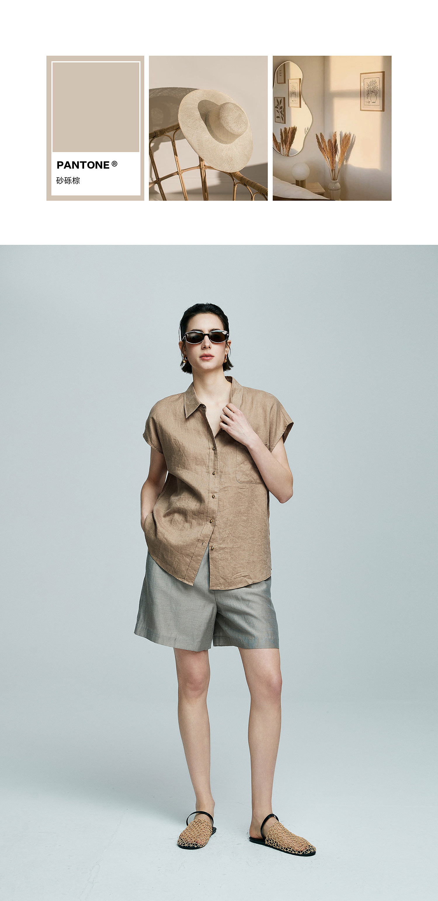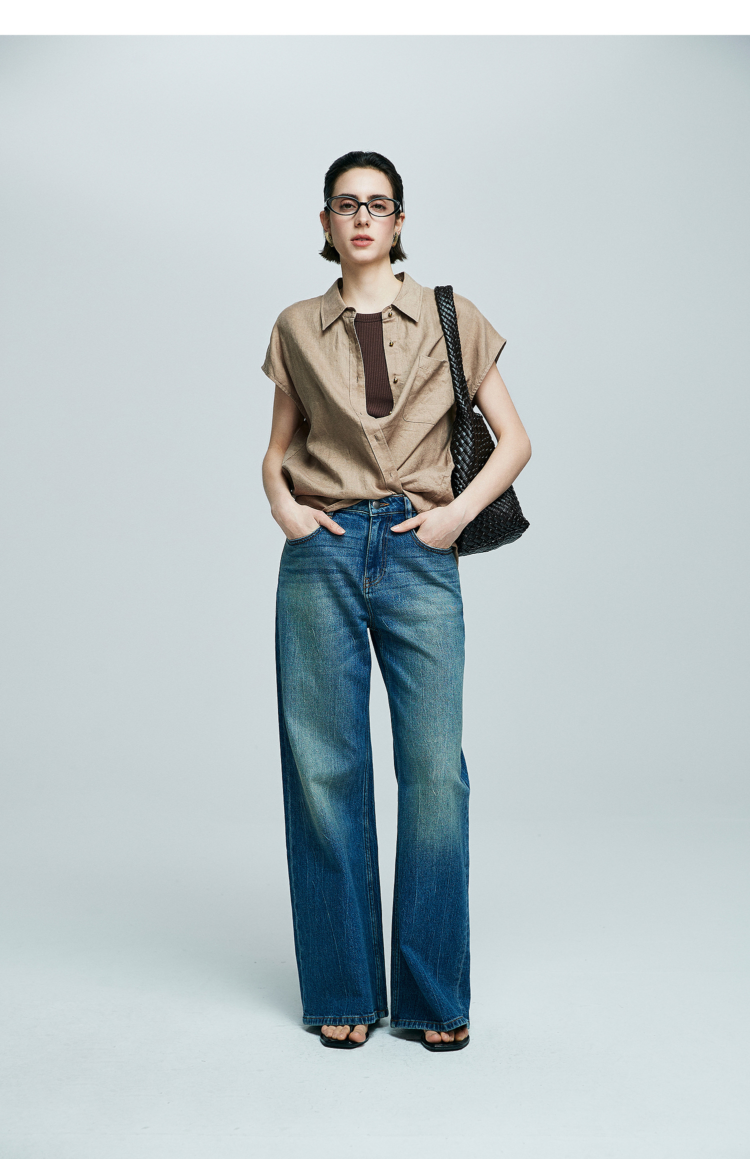 棉仓363604012-初棉无袖口袋小金扣宽松版亚麻衬衫