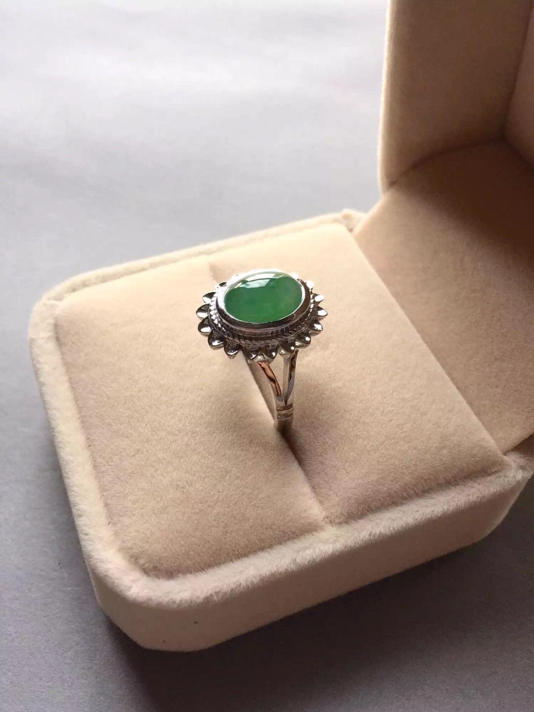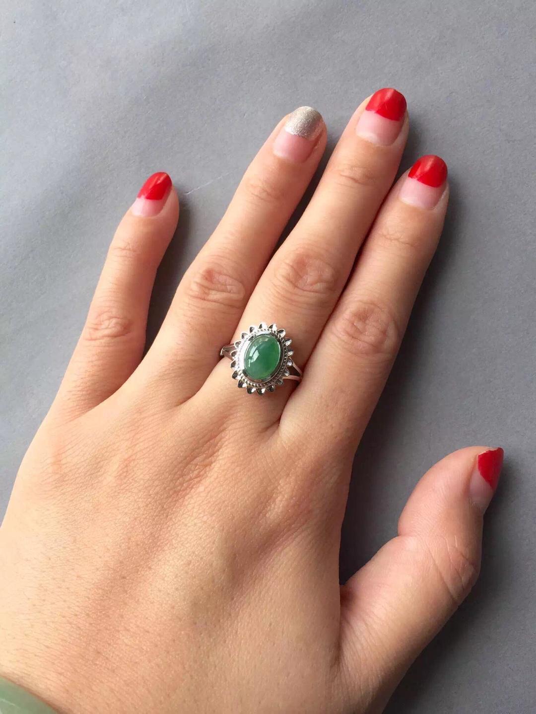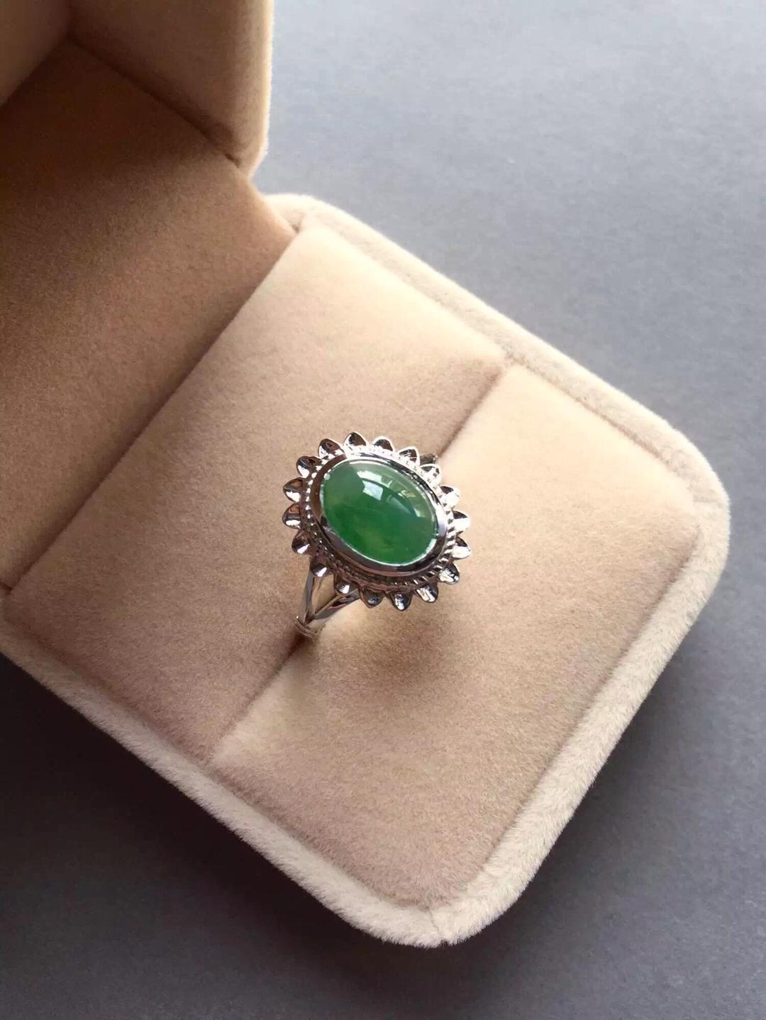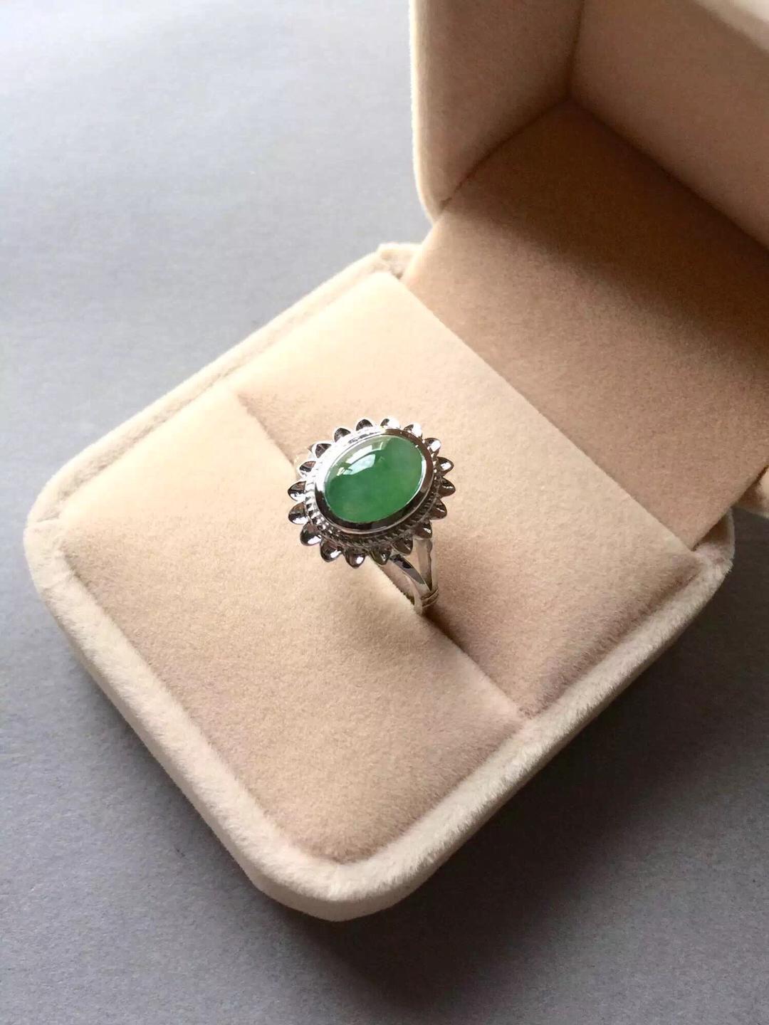 翡翠冰种阳绿蛋面戒指,浓郁复古情怀,18k白金镶嵌,灵感来自于欧洲古董首饰,太阳花款式,古典,端庄,绿蛋面10*8.3*4mm,尺寸大气,种水好,飘阳绿,整个泛绿底,晶莹剔透,圈口13可免费改