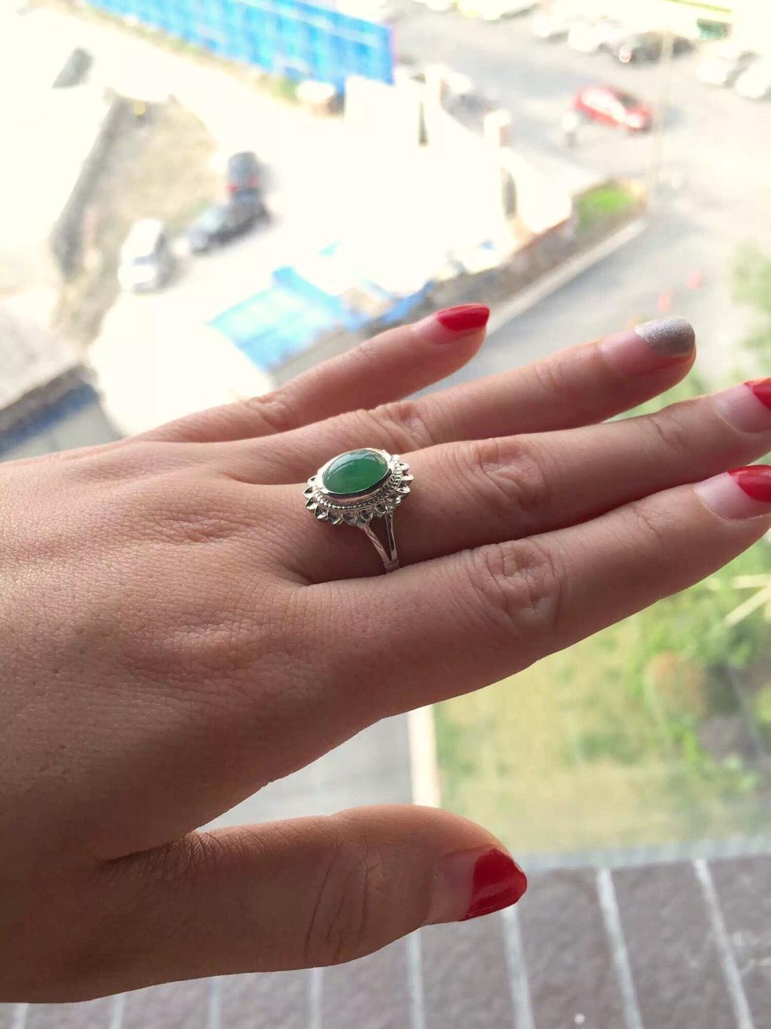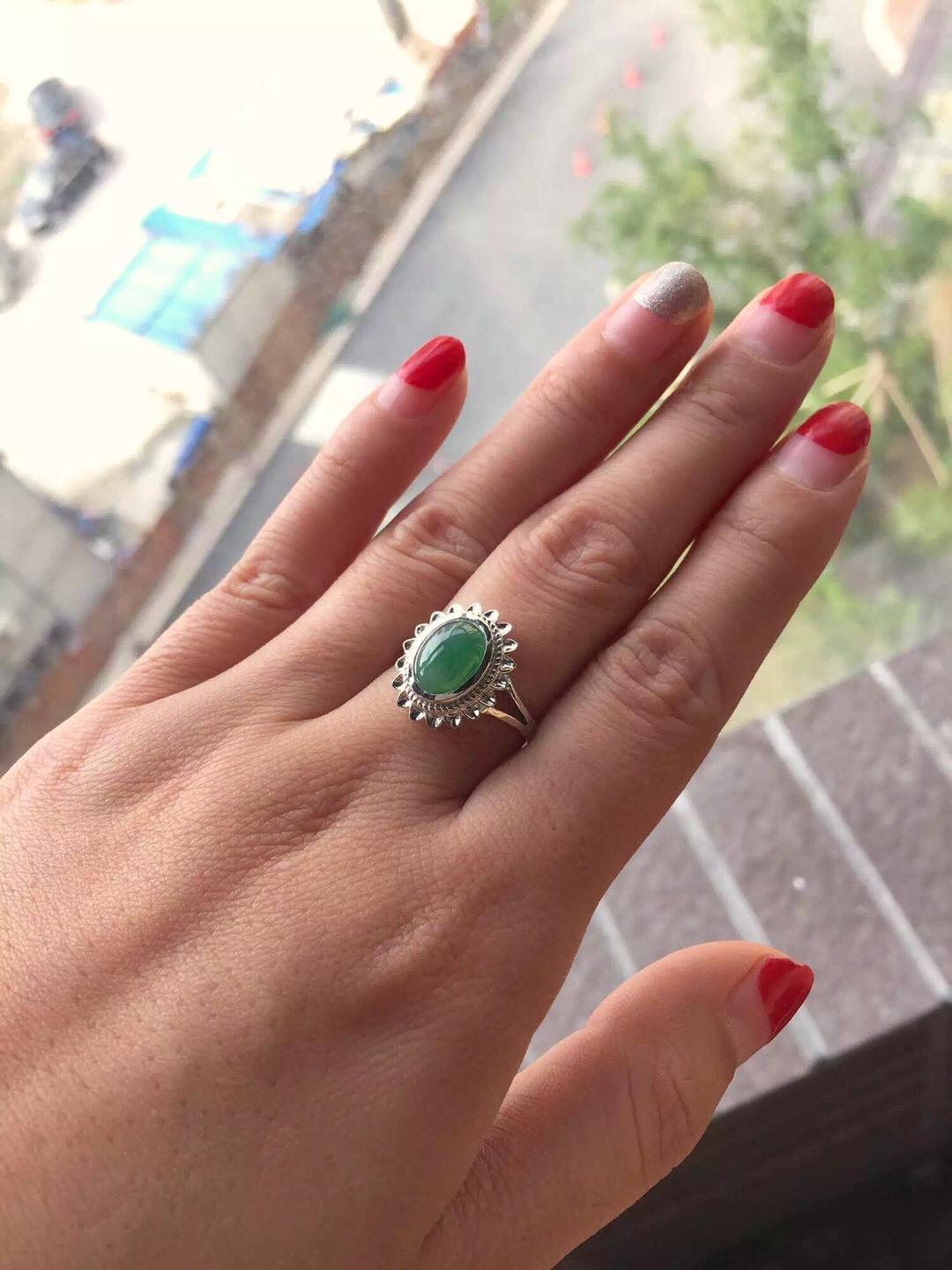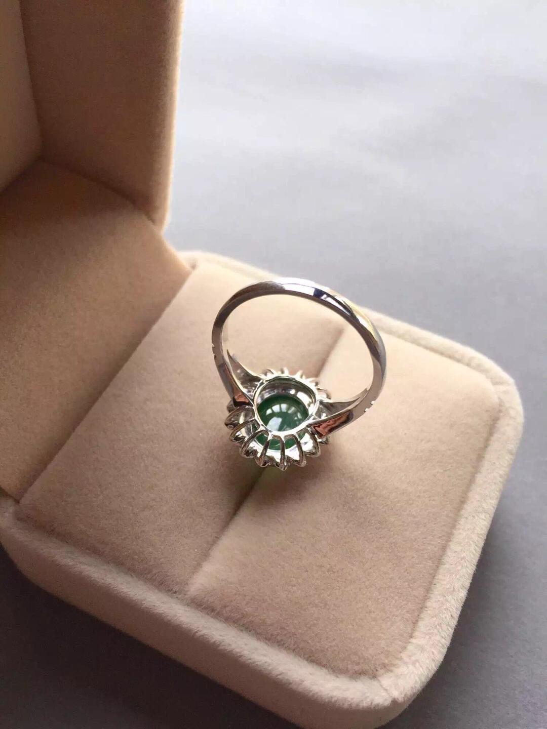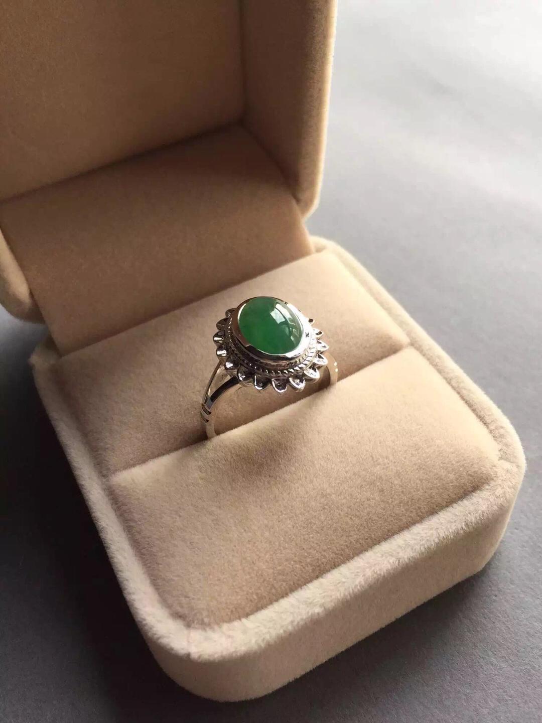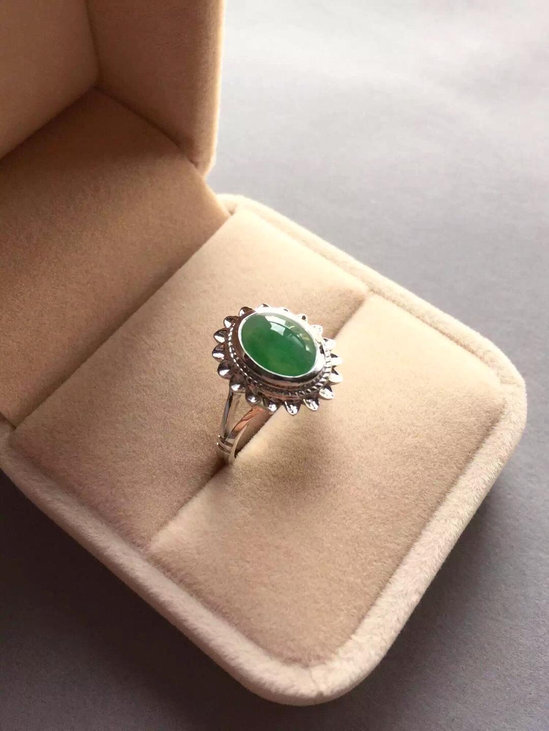 翡翠冰种阳绿蛋面戒指,浓郁复古情怀,18k白金镶嵌,灵感来自于欧洲古董首饰,太阳花款式,古典,端庄,绿蛋面10*8.3*4mm,尺寸大气,种水好,飘阳绿,整个泛绿底,晶莹剔透,圈口13可免费改