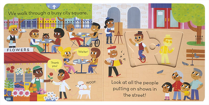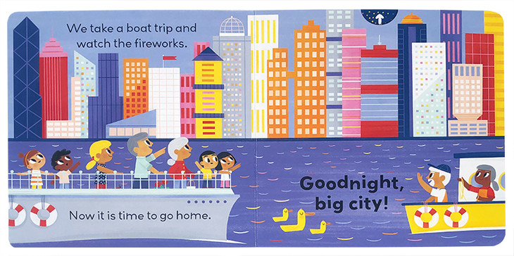 你知道热闹的城市裡有些什么吗?让我们来一趟城市巡游吧!走在熙熙攘攘的街道上,路边有人踩着单车,还可以看到许多高耸入云的摩天大楼,坐上船来到河面上,抬头往天空一看,哗!夜空中有漂亮的烟火呢!展开拉页,烟火在天空越飞越高,漂亮极了!