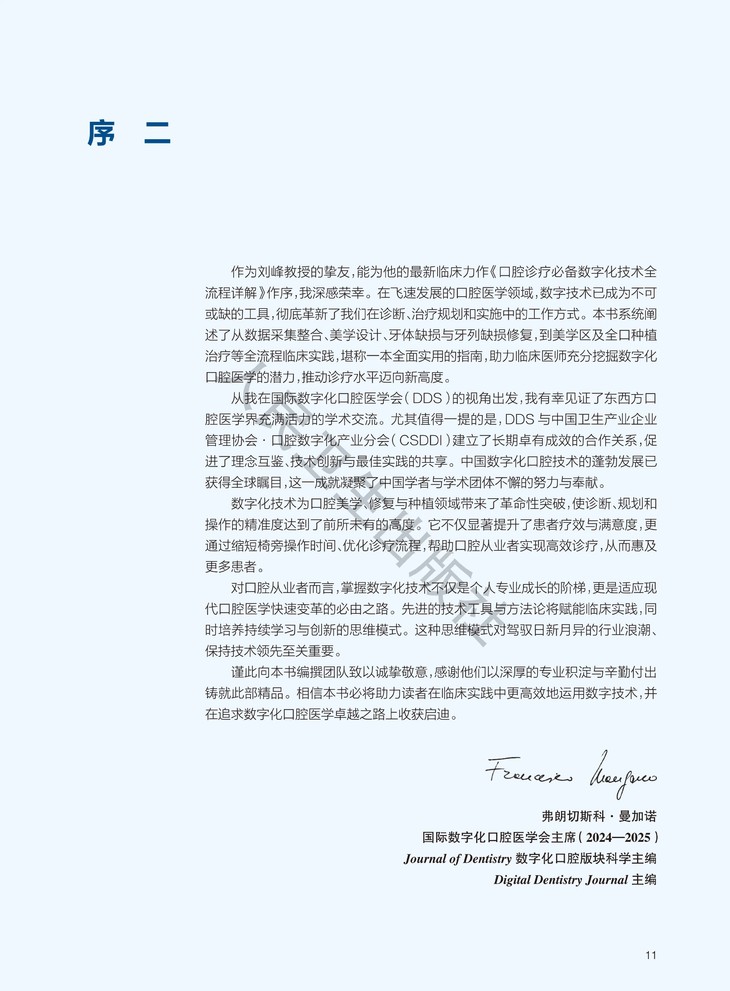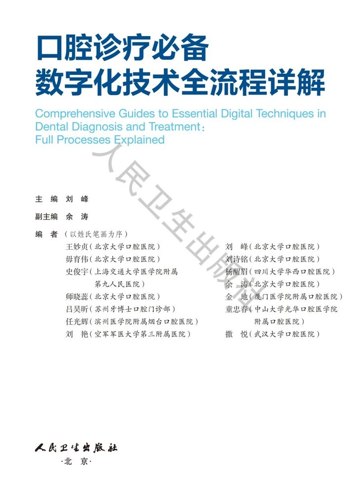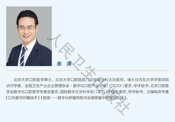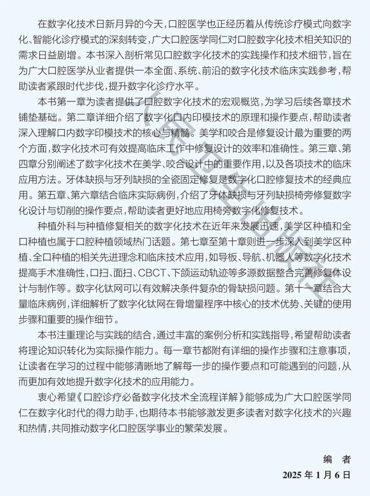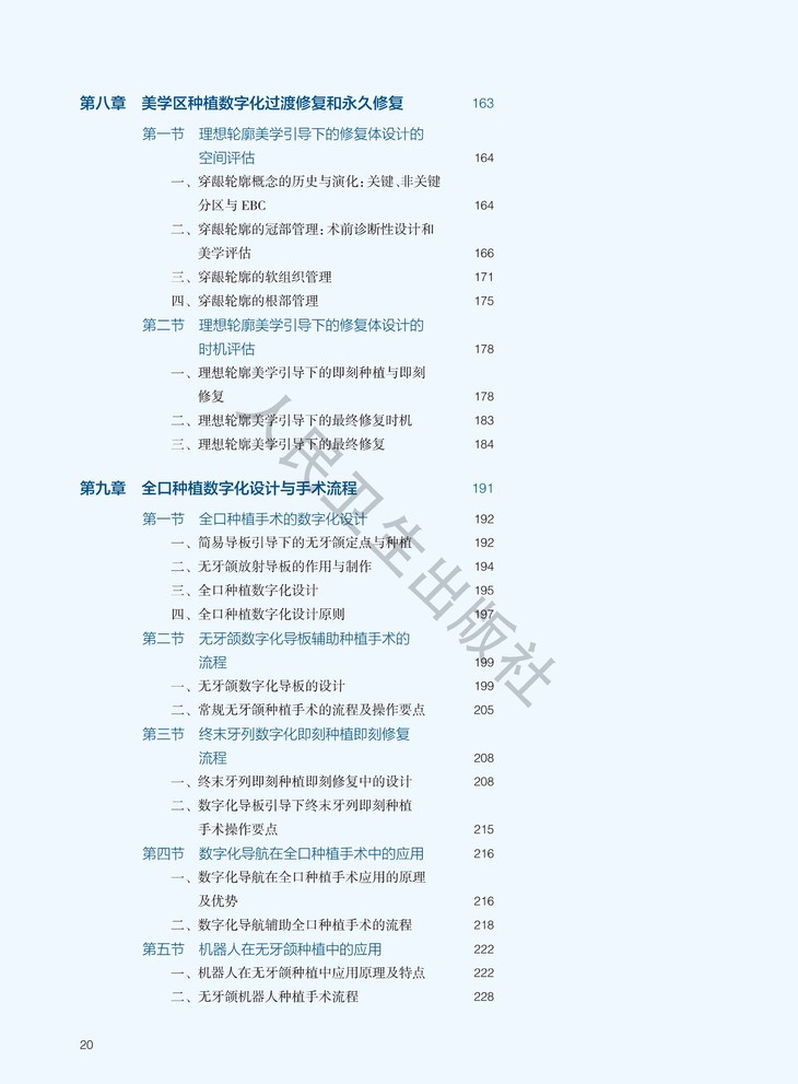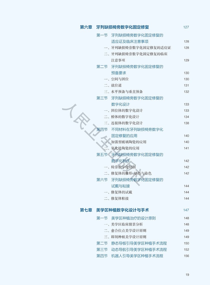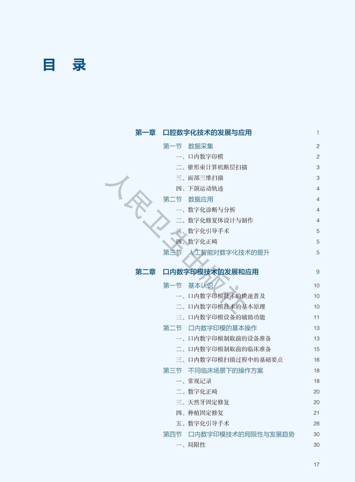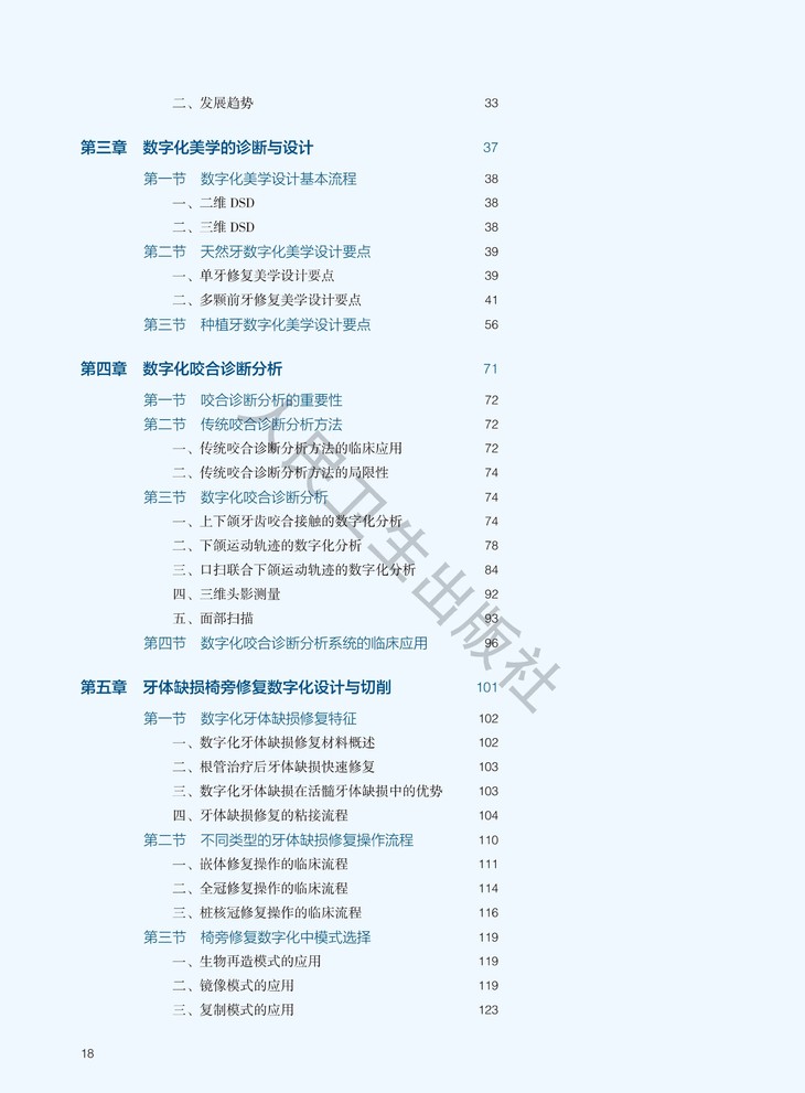 章节设置包括十大板块。口腔数字化技术的发展与应用,口内数字印模技术,数字化美学的诊断与设计,数字化咬合诊断分析,牙体缺损椅旁修复数字化设计与切削,牙列缺损椅旁数字化固定修复,美学区种植数字化设计与手术,美学区种植数字化过渡修复和永久修复,全口种植数字化设计与手术流程,种植体支持式全口固定修复的印模和颌位关系记录,数字化钛网在骨增量程序中的应用等。