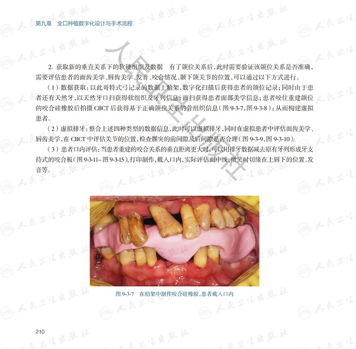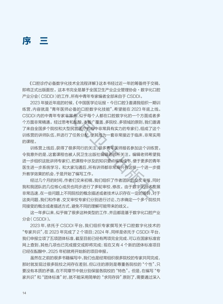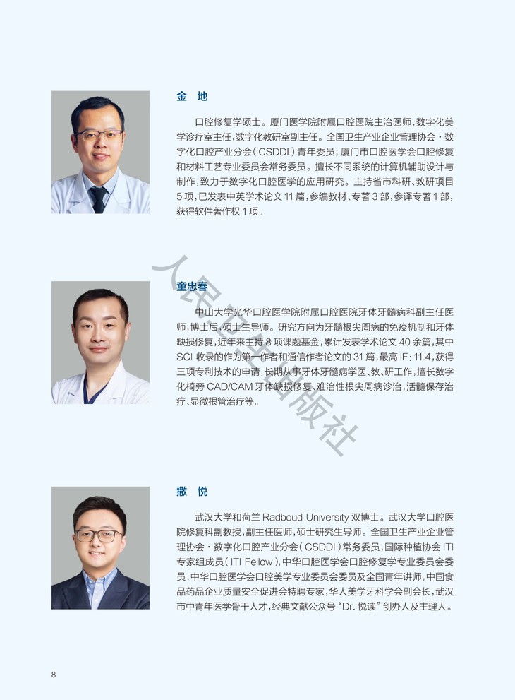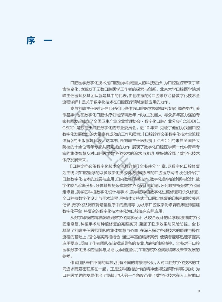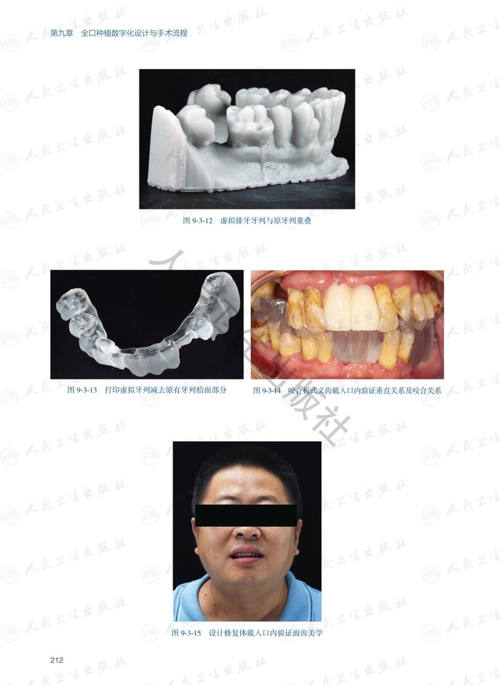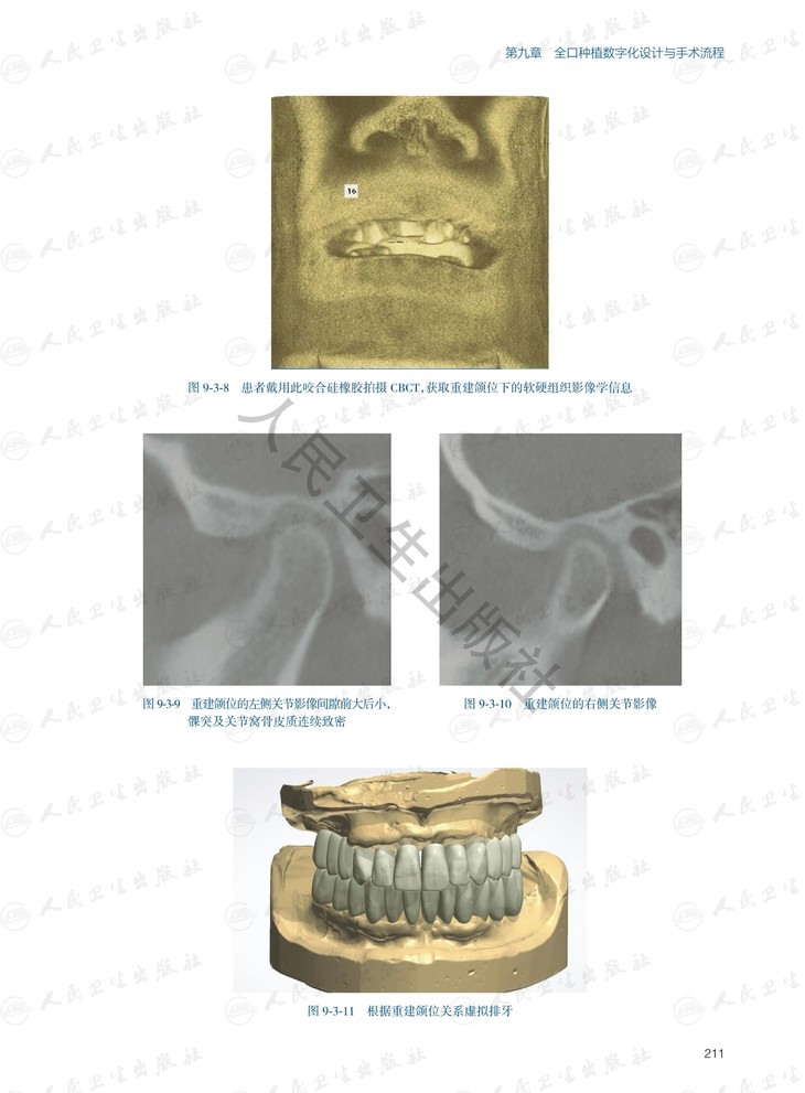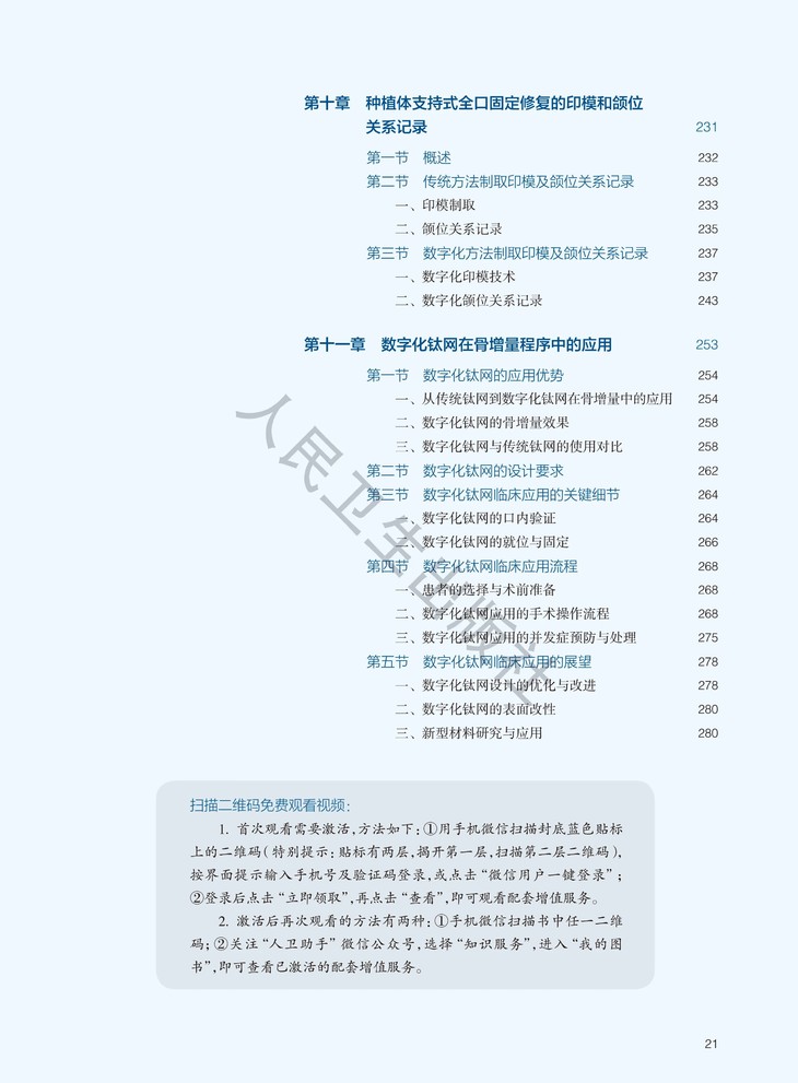 章节设置包括十大板块。口腔数字化技术的发展与应用,口内数字印模技术,数字化美学的诊断与设计,数字化咬合诊断分析,牙体缺损椅旁修复数字化设计与切削,牙列缺损椅旁数字化固定修复,美学区种植数字化设计与手术,美学区种植数字化过渡修复和永久修复,全口种植数字化设计与手术流程,种植体支持式全口固定修复的印模和颌位关系记录,数字化钛网在骨增量程序中的应用等。
