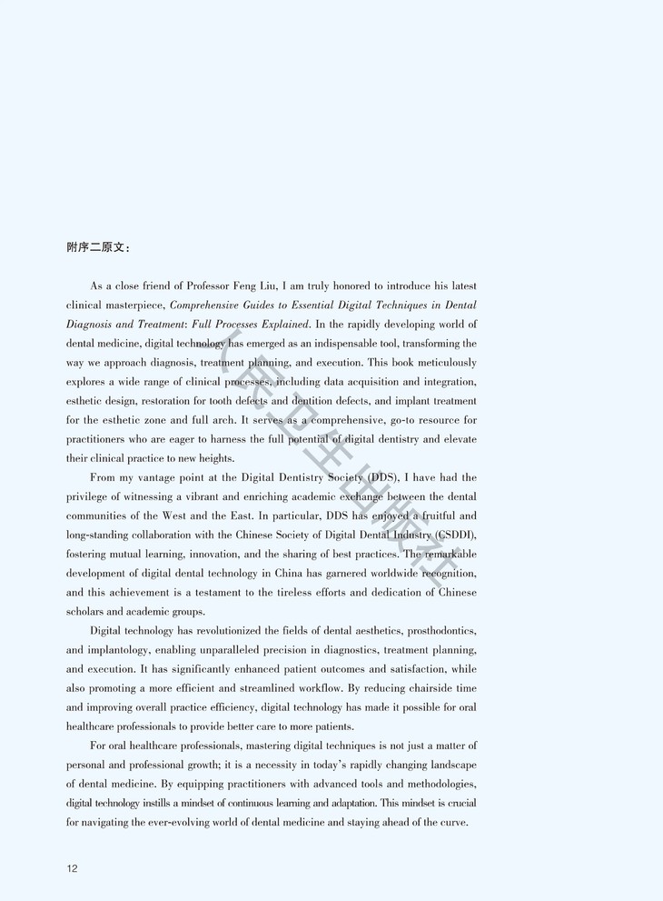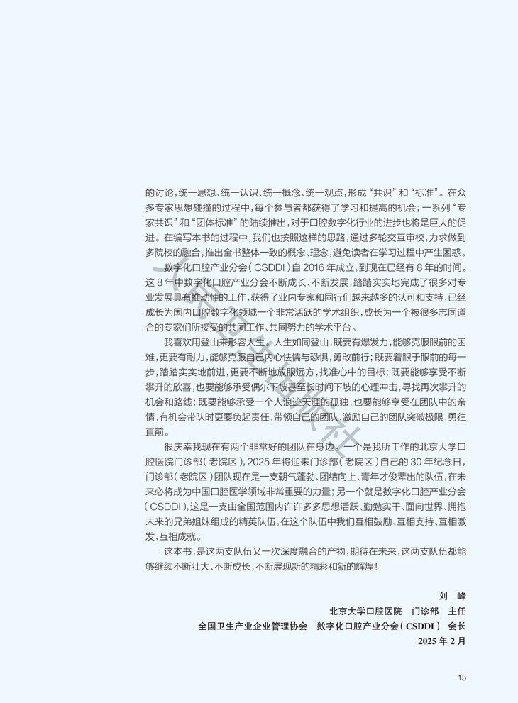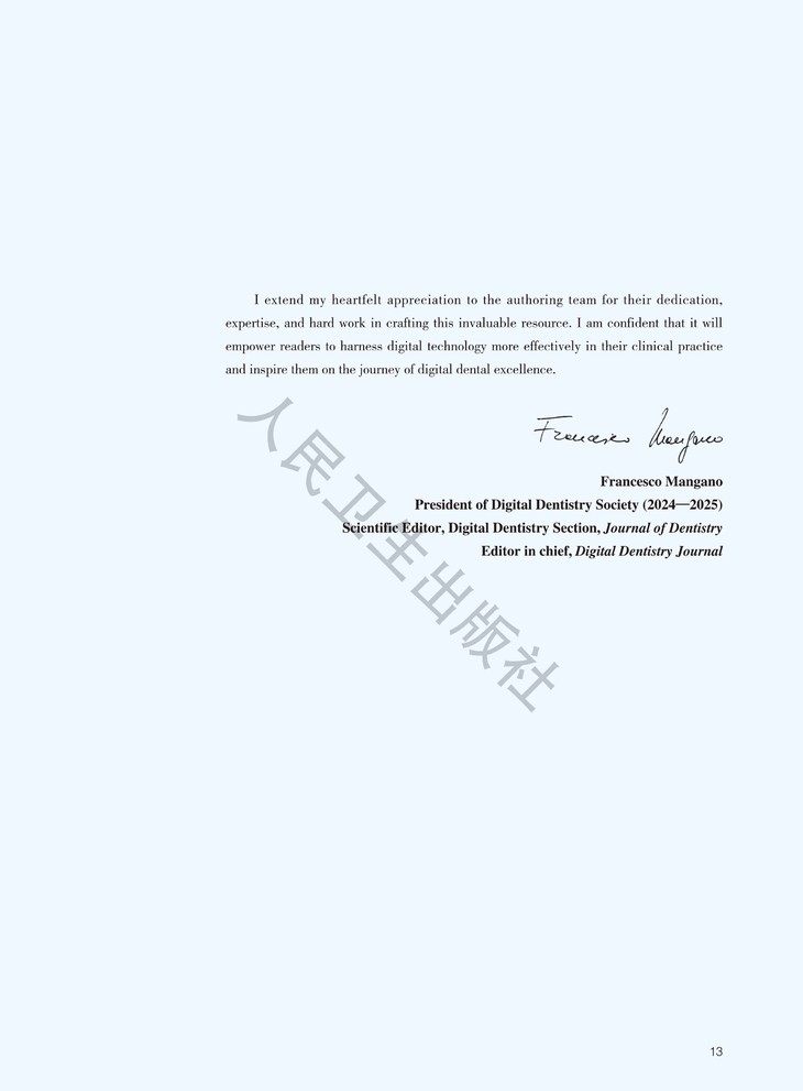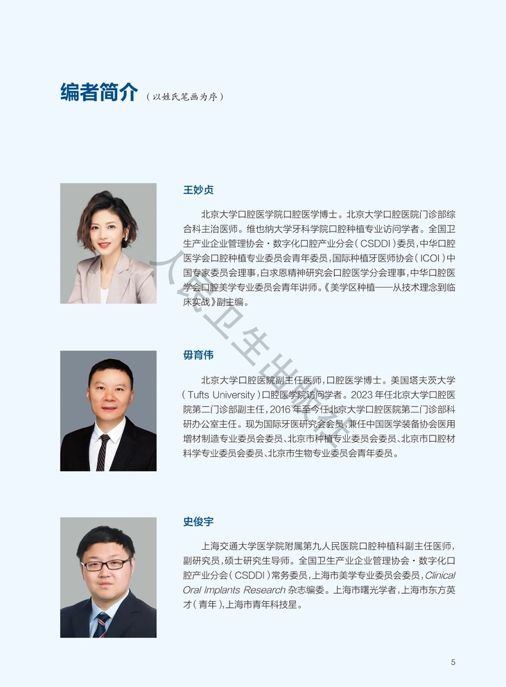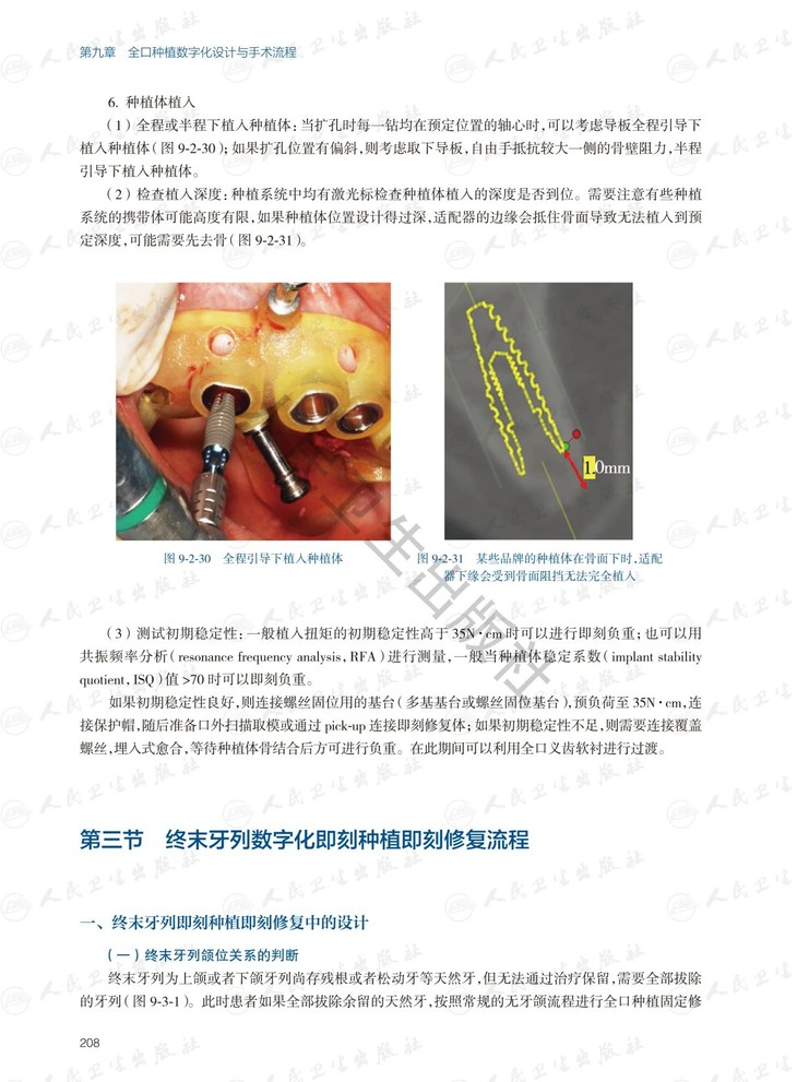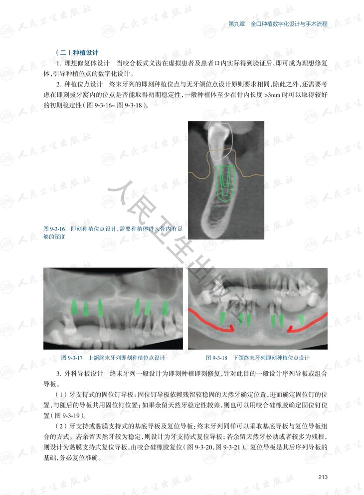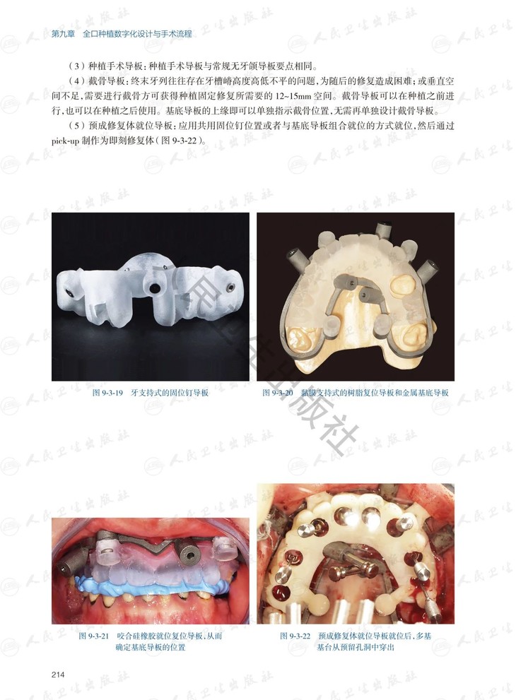 章节设置包括十大板块。口腔数字化技术的发展与应用,口内数字印模技术,数字化美学的诊断与设计,数字化咬合诊断分析,牙体缺损椅旁修复数字化设计与切削,牙列缺损椅旁数字化固定修复,美学区种植数字化设计与手术,美学区种植数字化过渡修复和永久修复,全口种植数字化设计与手术流程,种植体支持式全口固定修复的印模和颌位关系记录,数字化钛网在骨增量程序中的应用等。