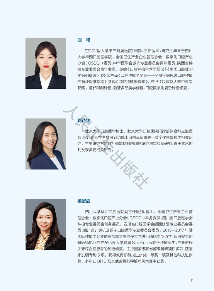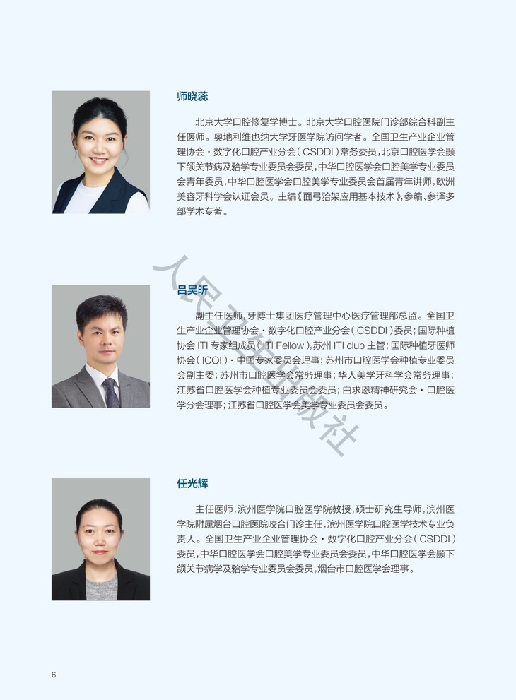 北京大学口腔医院门诊部主任,全国卫生产业企业管理协会数字化口腔分会(CSDDI)会长,中国整形美容协会口腔整形美容分会(CAPA)副会长,国际种植牙医师协会中国专家委员会(ICOI)副会长,国际数字化牙科学会(DDS)中国区主席,欧洲美容牙医学会(ESCD)顾问委员会委员兼中国区主席。发表中文核心期刊论文60篇,发表英文SCI论文20余篇,主编出版中文学术专著24部,主编出版英文学术专著1部。