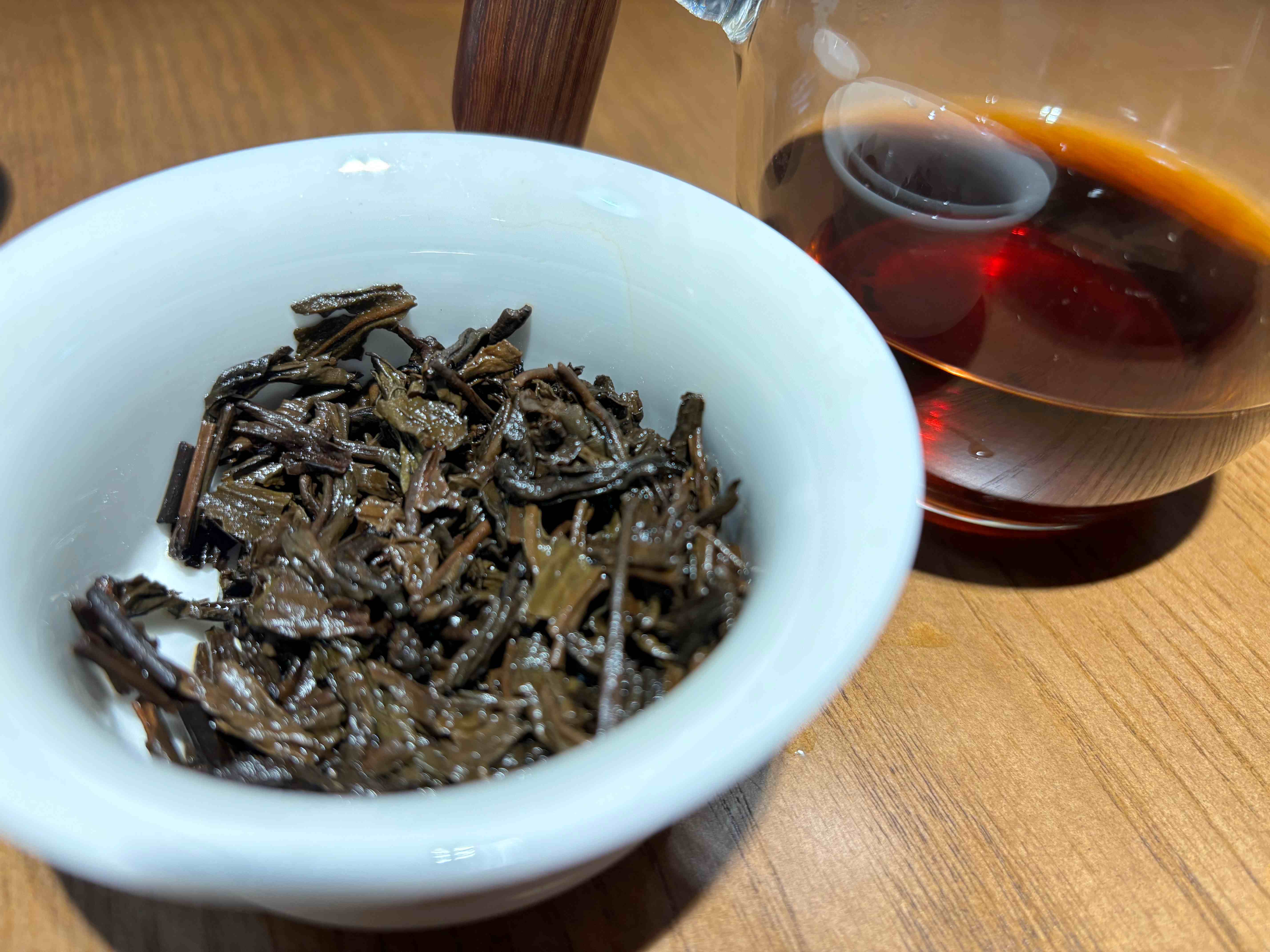 干茶匀整,有金芽,略带金花,一看就是好料做的。