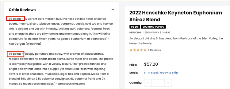 “深邃的香气,带有黑加仑、烤咖啡豆、雪松、桃肉、腌制烤肉和黑醋栗果香。口感天衣无缝地融合,丝滑的质地、细腻的单宁和明亮酸度,带来柔滑且有结构的余味,留下苦黑巧克力、黑李子、雪茄盒和红辣椒的余韵。由59%西拉、33%赤霞珠、6%品丽珠和2%梅洛混酿而成,如此精致和优雅。”