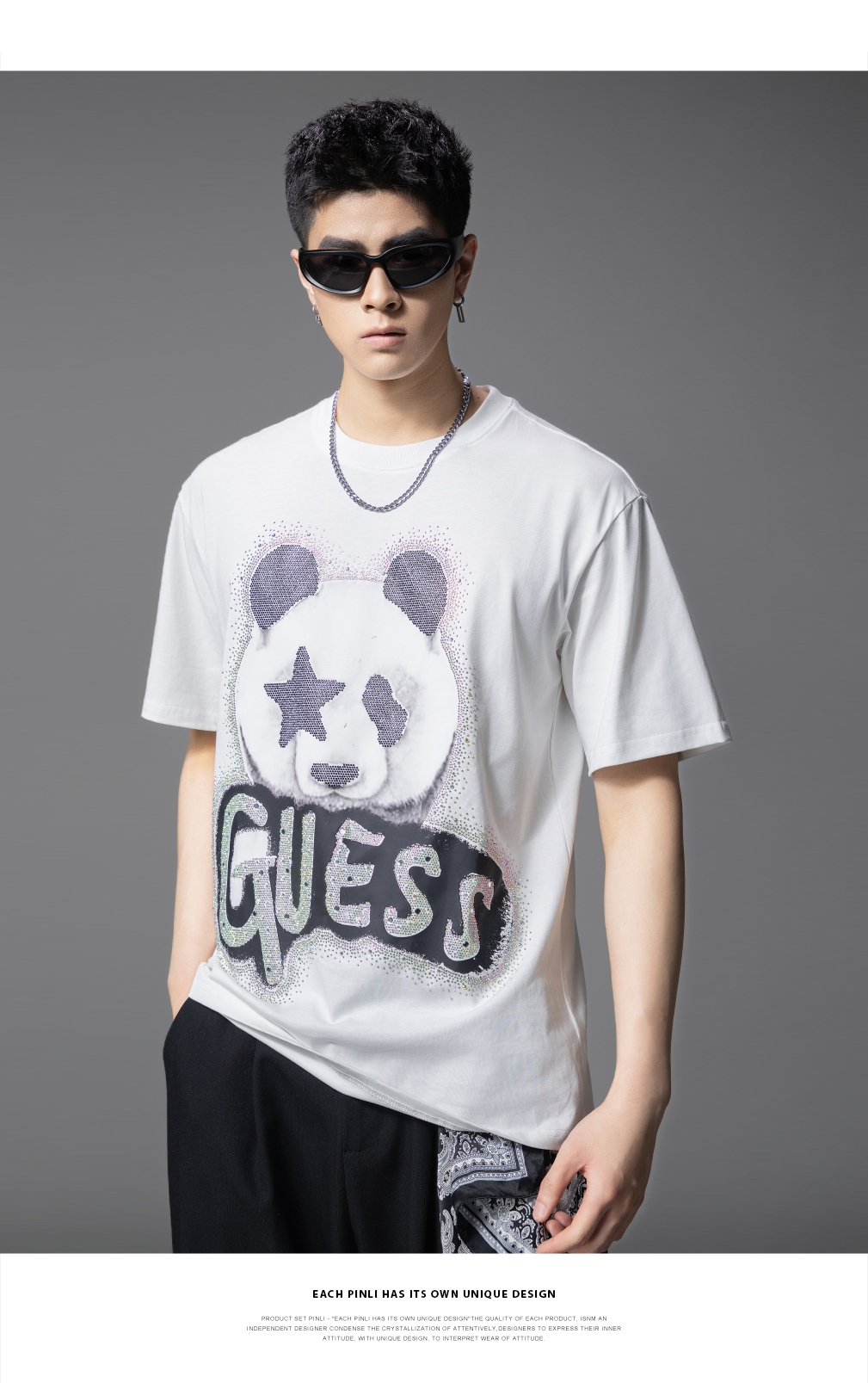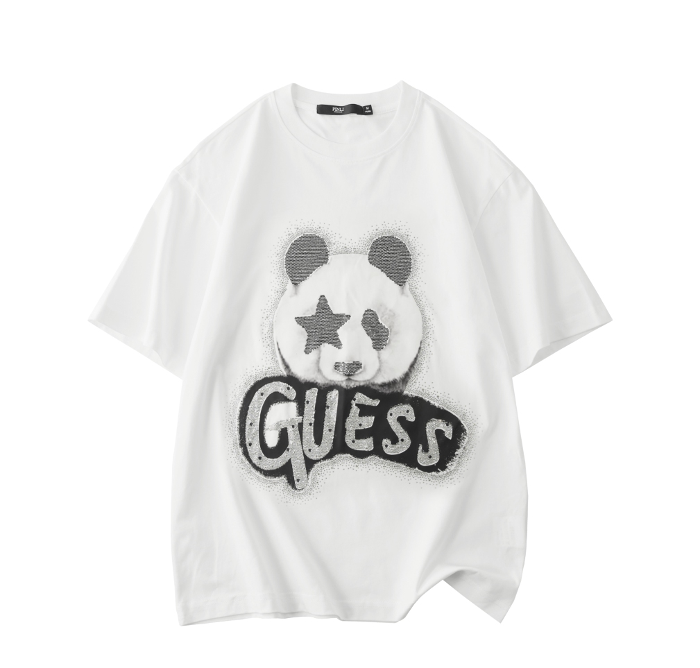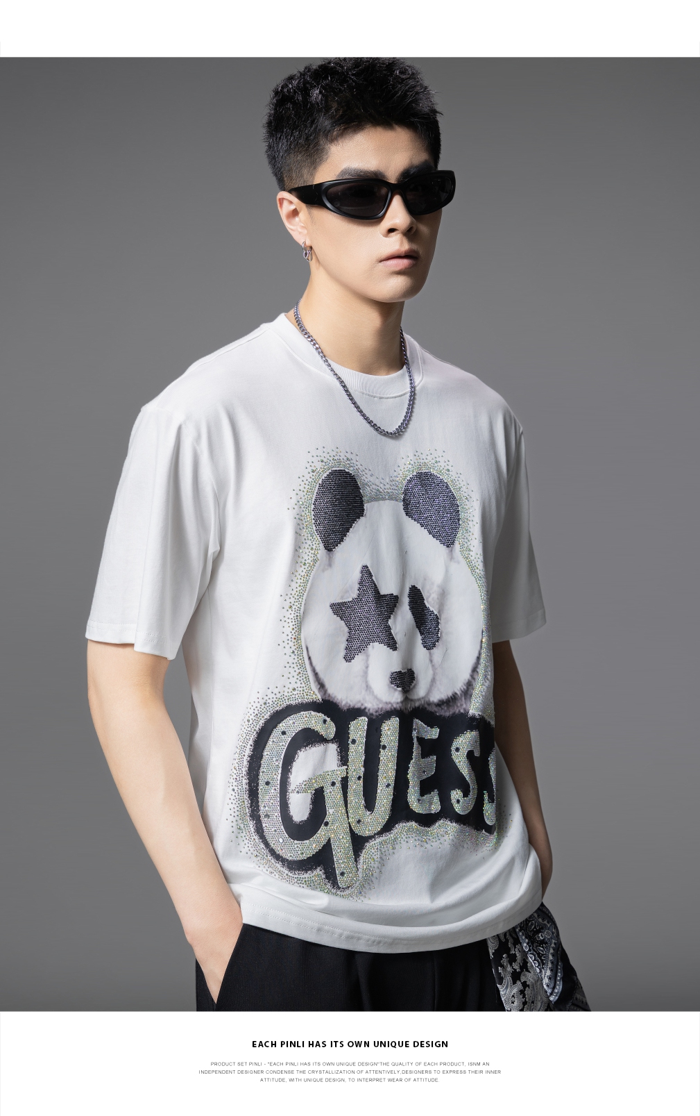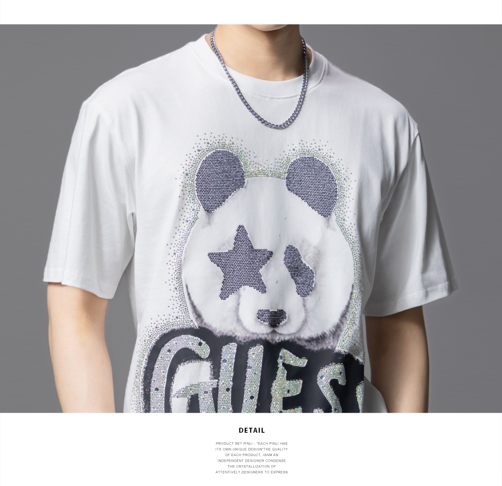 PINLI品立2025夏季新款男士圆领熊猫字母烫钻短袖T恤落肩潮牌上衣BG252111029