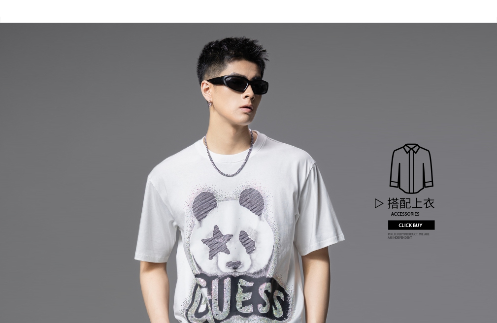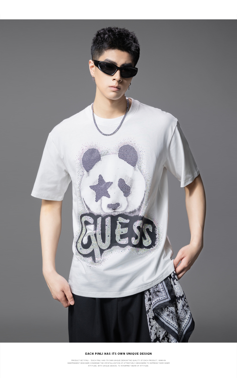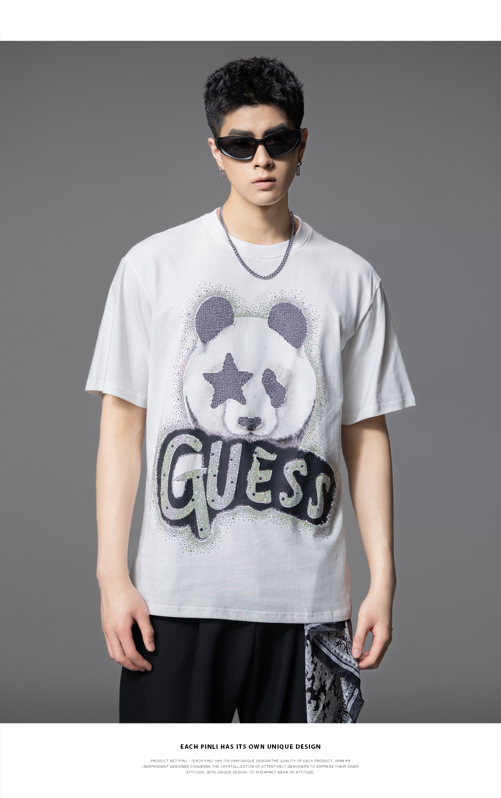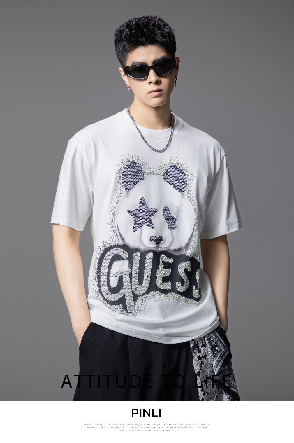 PINLI品立2025夏季新款男士圆领熊猫字母烫钻短袖T恤落肩潮牌上衣BG252111029