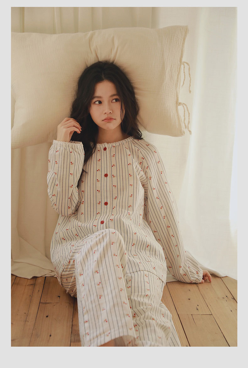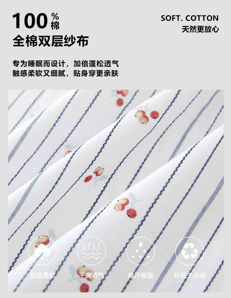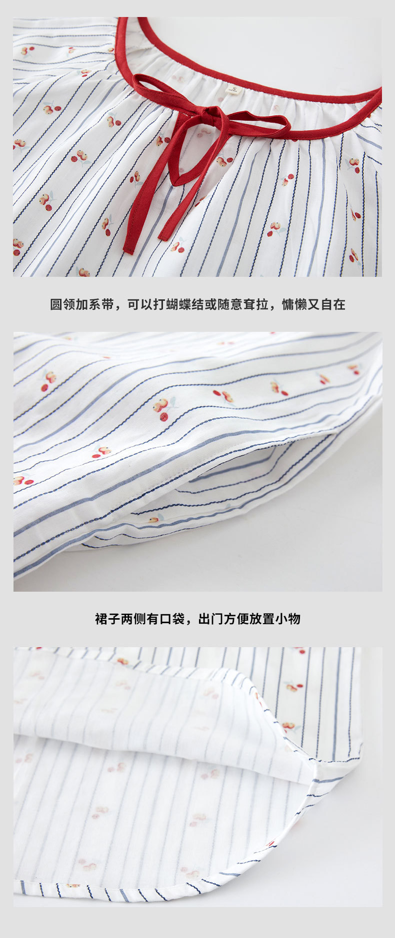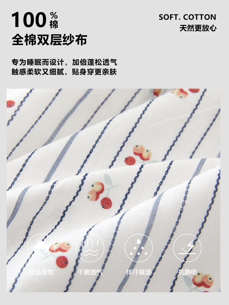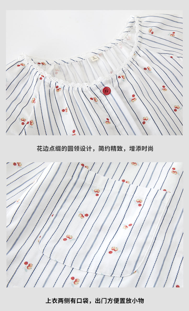 全棉双层纱~法式复古小樱桃纯棉睡裙/长袖套装春夏季女士睡衣女可外穿大码全棉家居服月子服