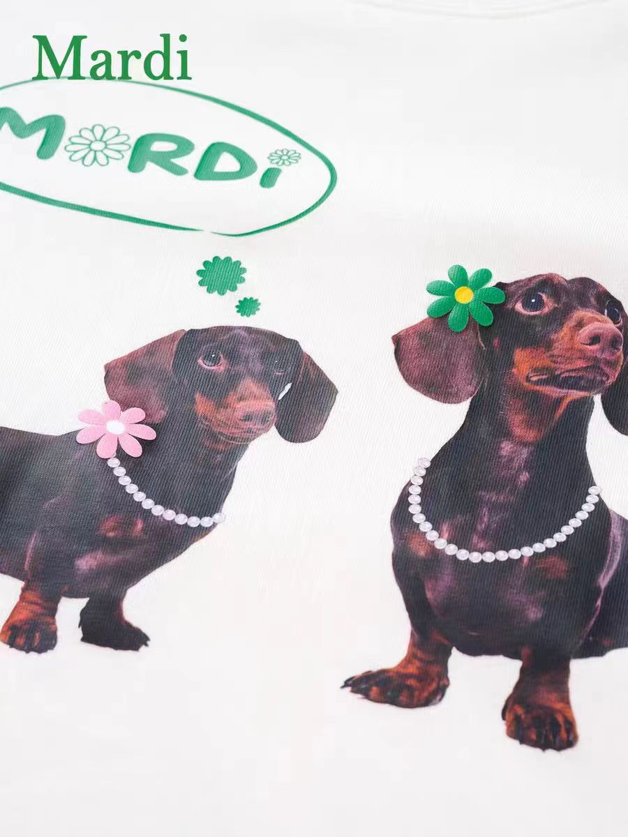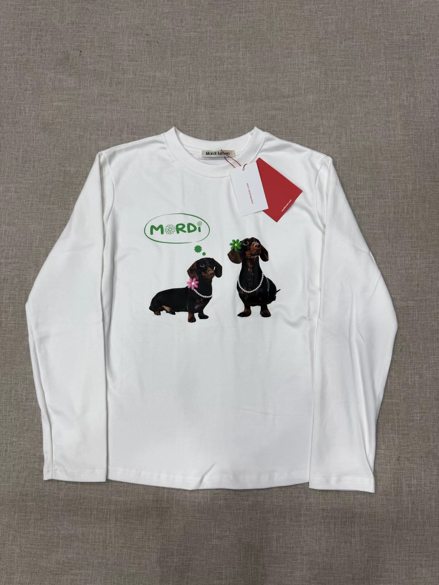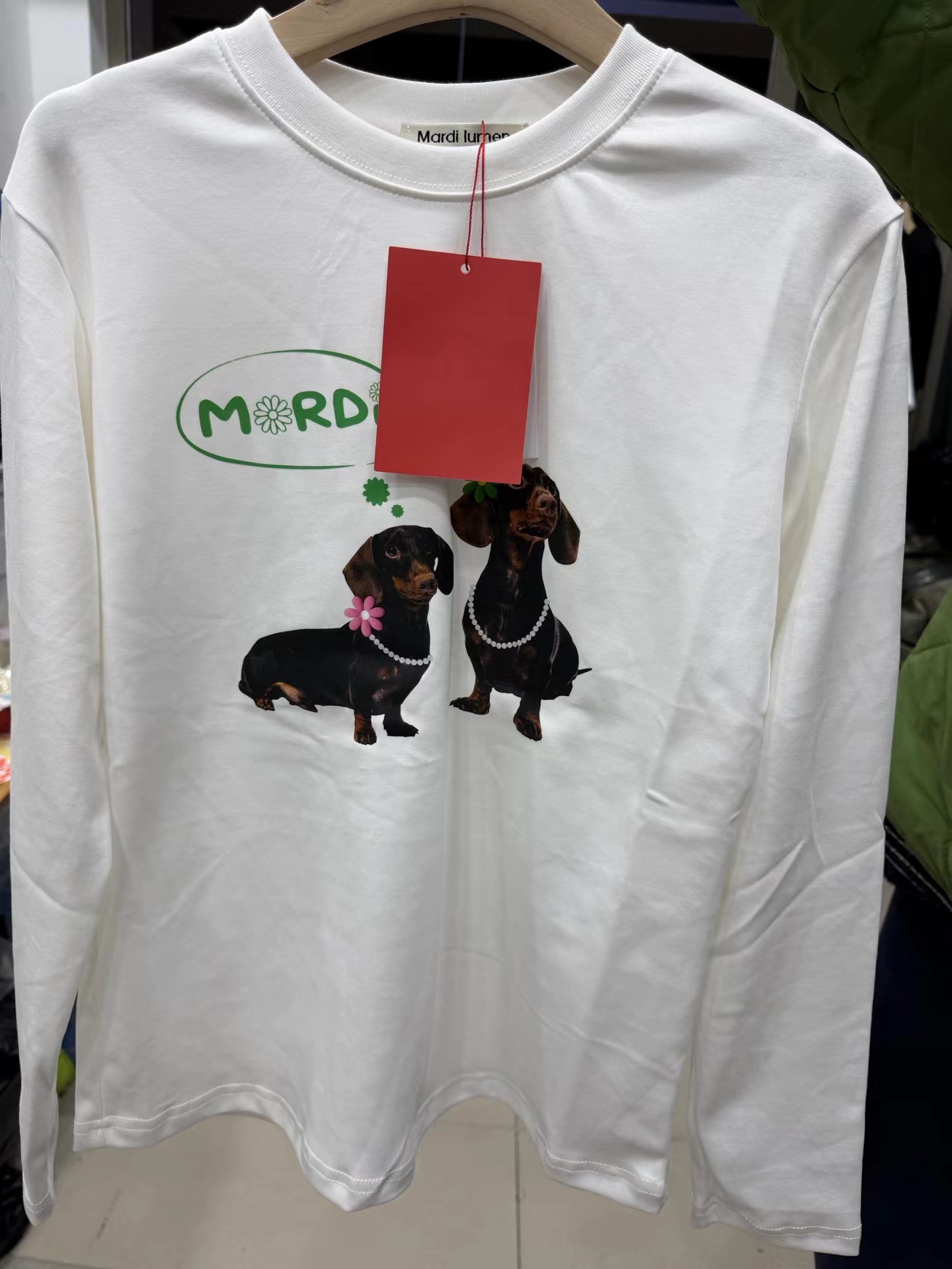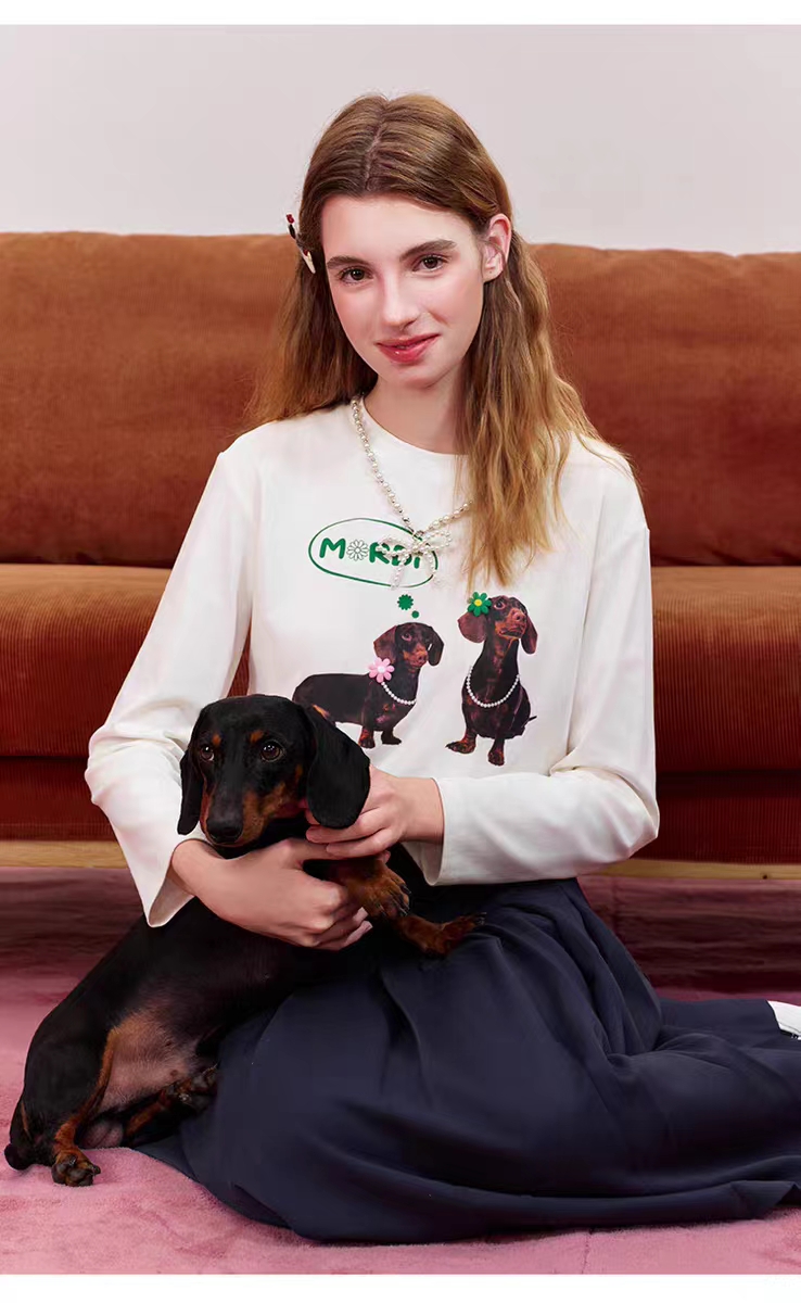 珍珠项链长袖腊肠小狗印花上衣薄款T恤