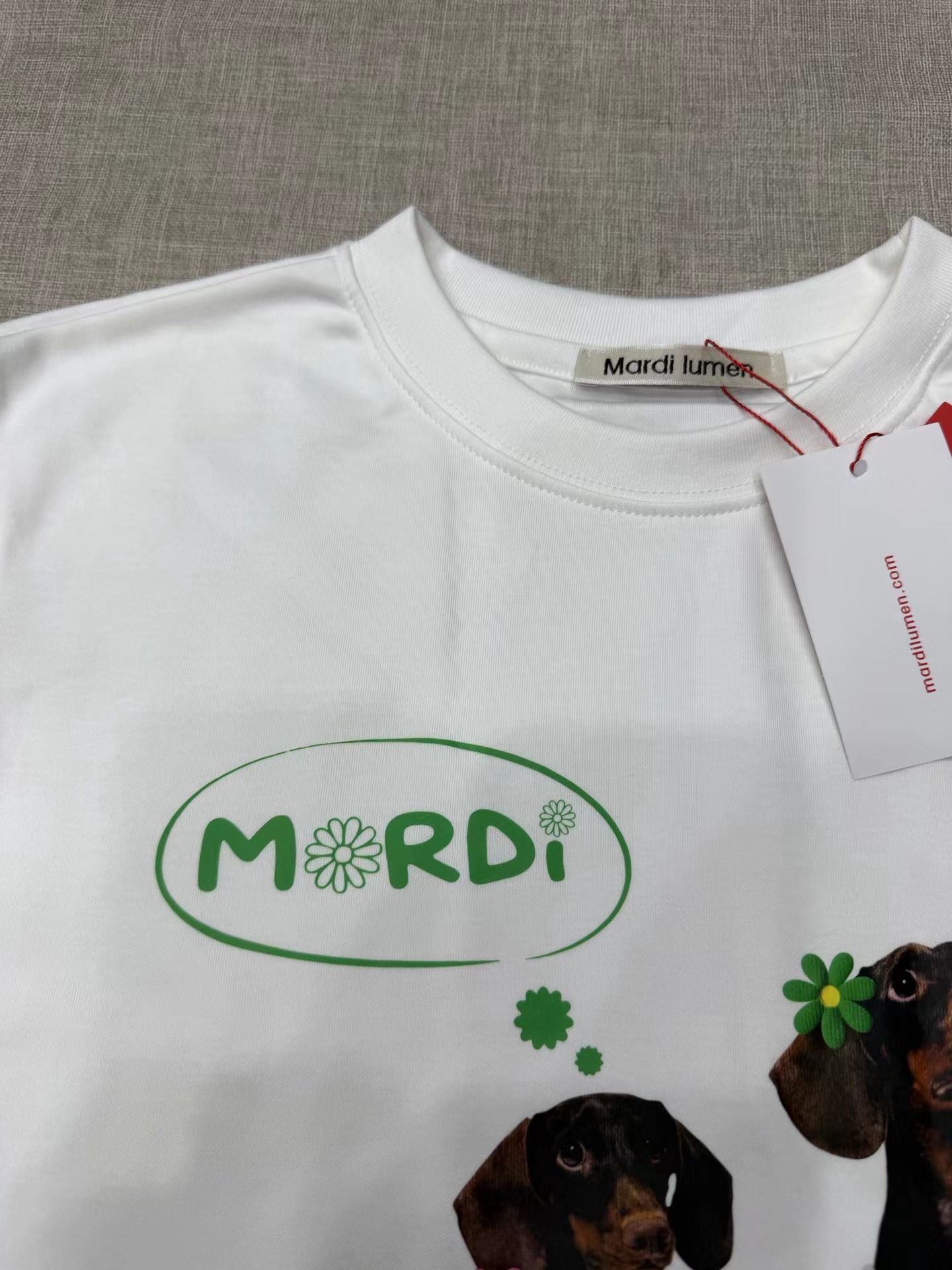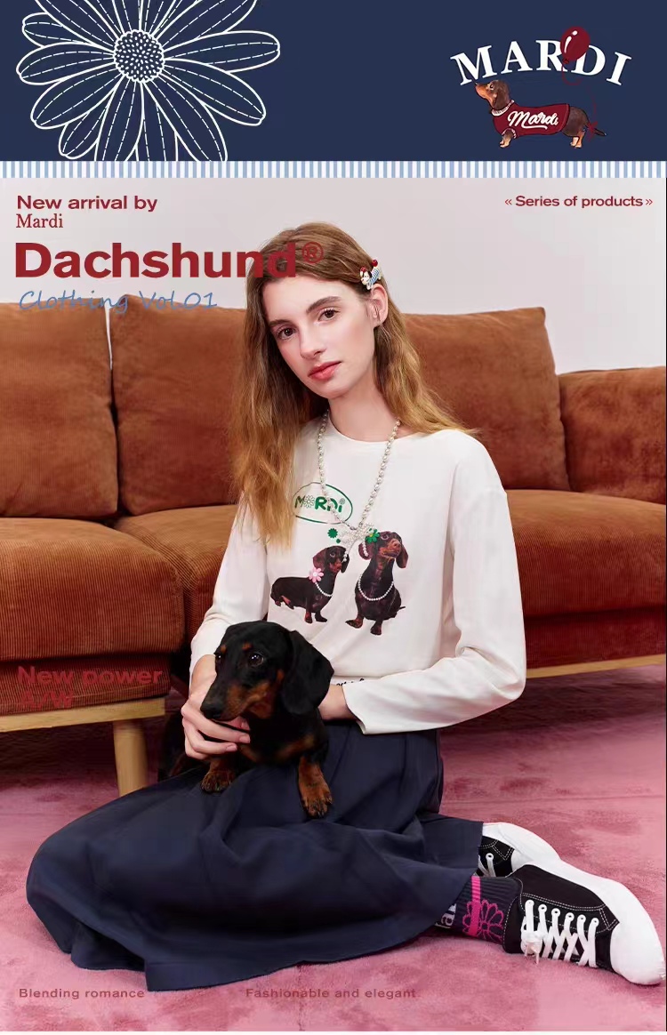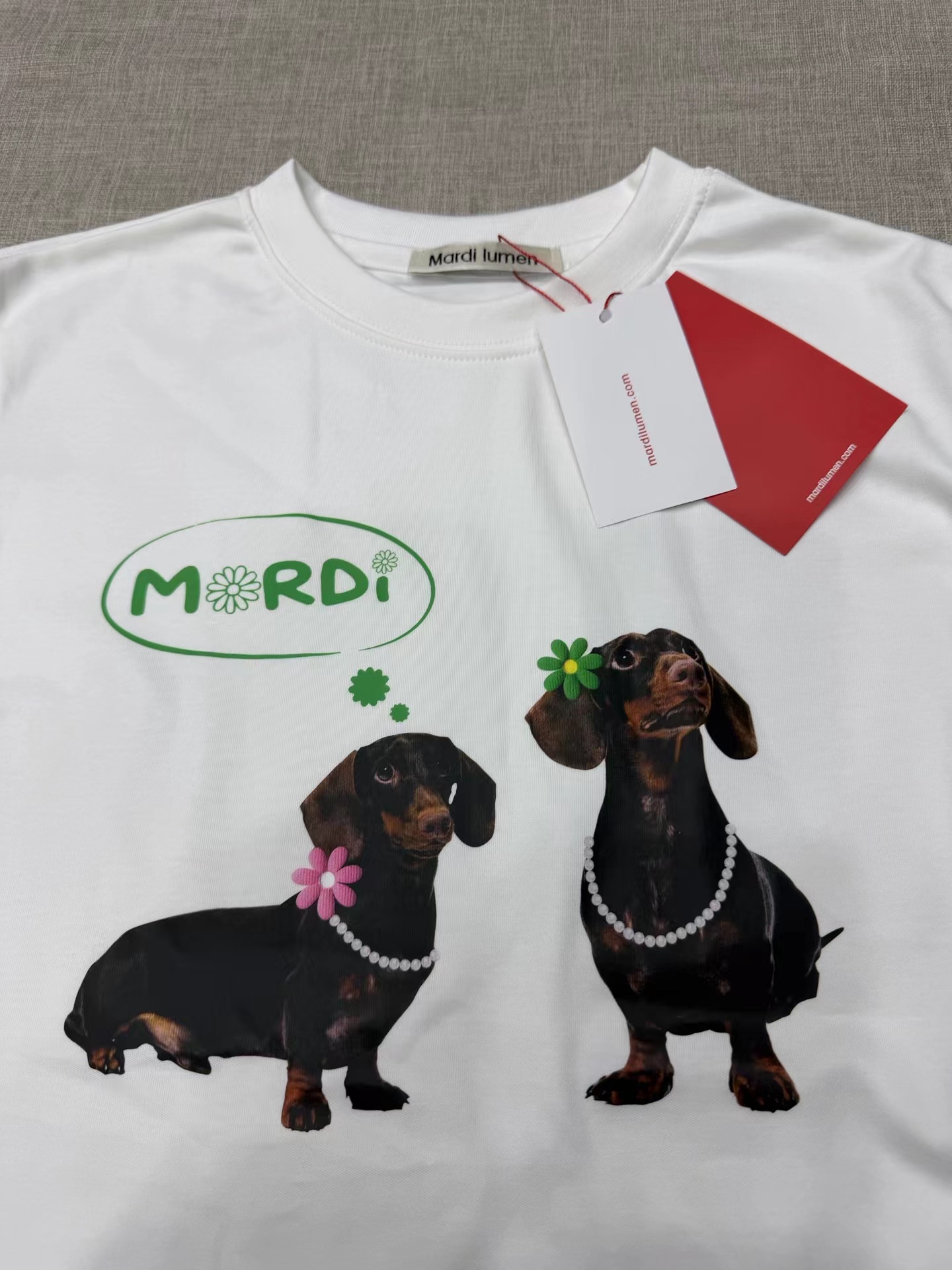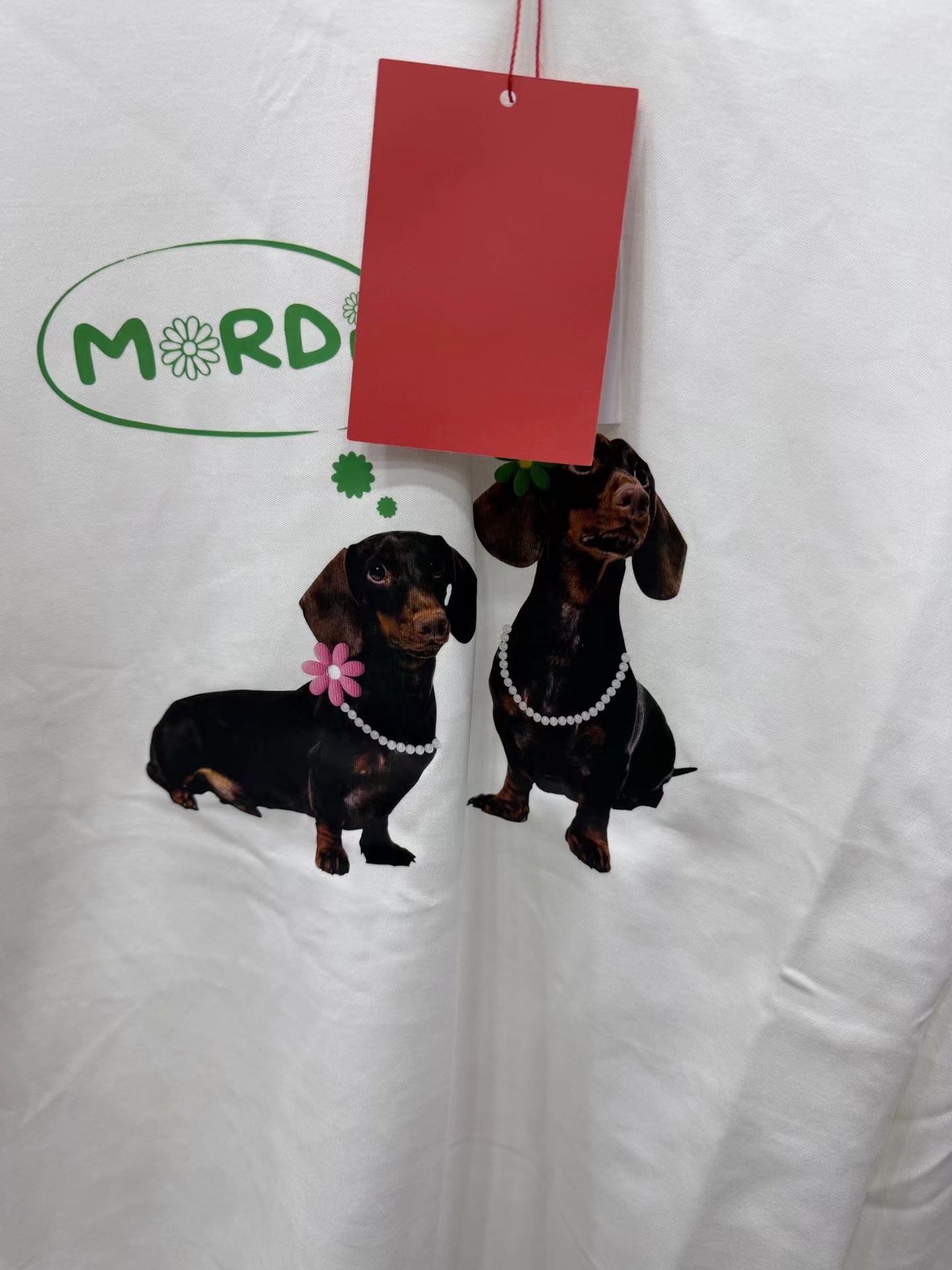珍珠项链长袖腊肠小狗印花上衣薄款T恤
