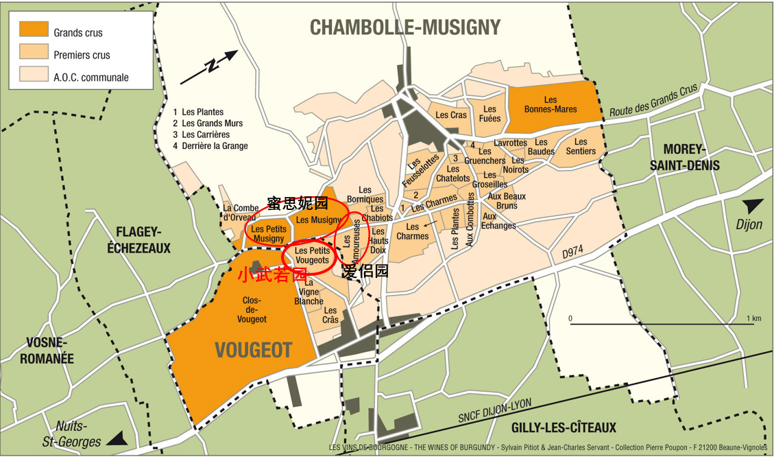 小武若一级园:0.46公顷。棕色石灰岩土壤。小武若园位于武若特级园北部,与香波-蜜思妮村的蜜思妮园和爱侣园相邻。风格柔和精致的红葡萄酒有时带有泥土气息。