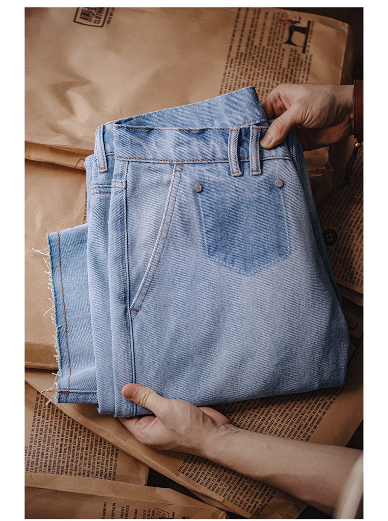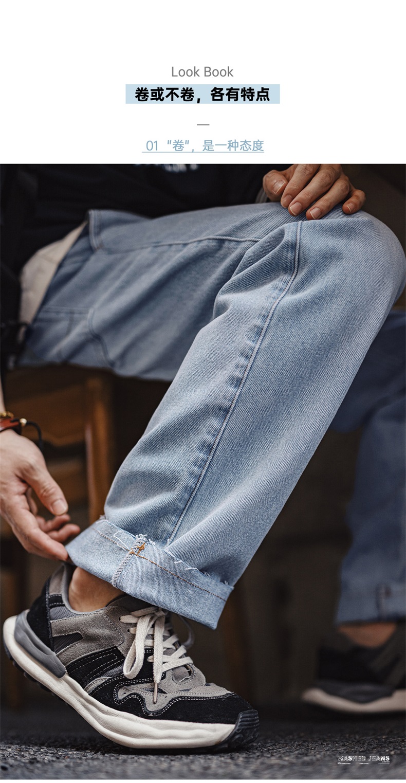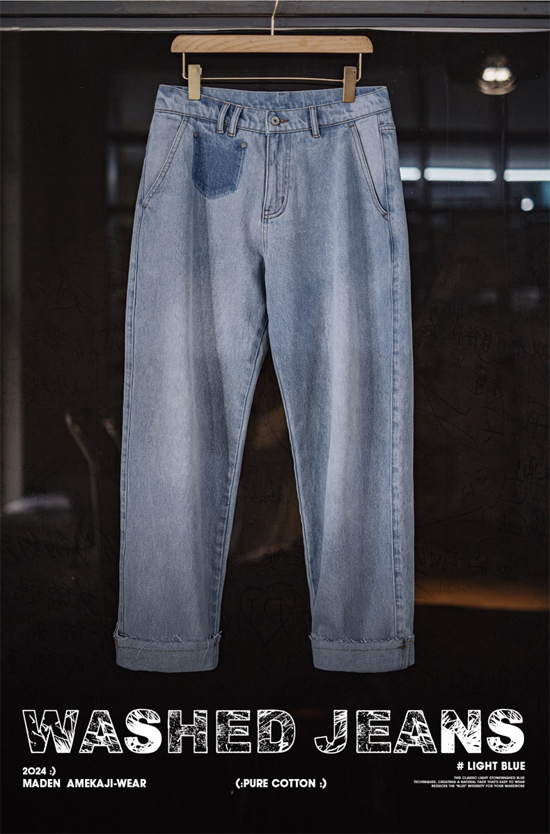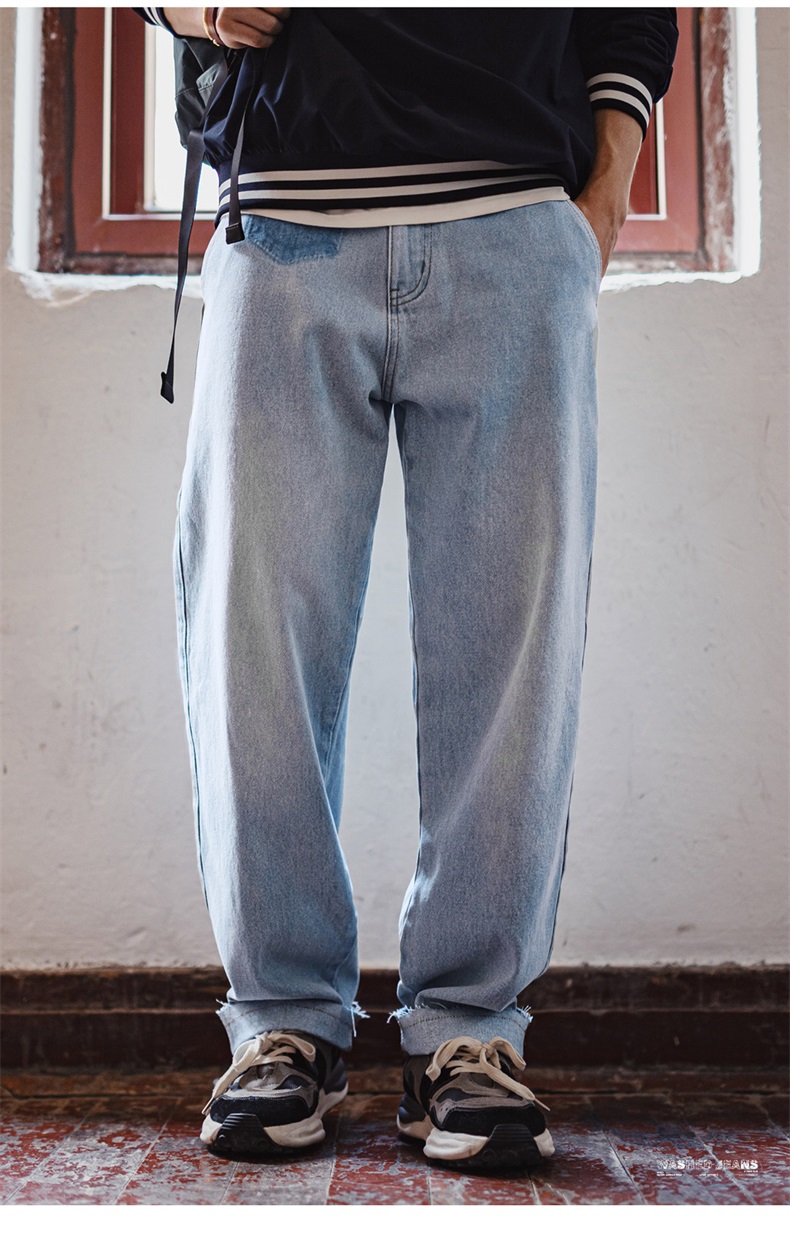 工装优选美式复古水洗蓝丹宁牛仔裤纯棉毛边直筒休闲老爹长裤男秋