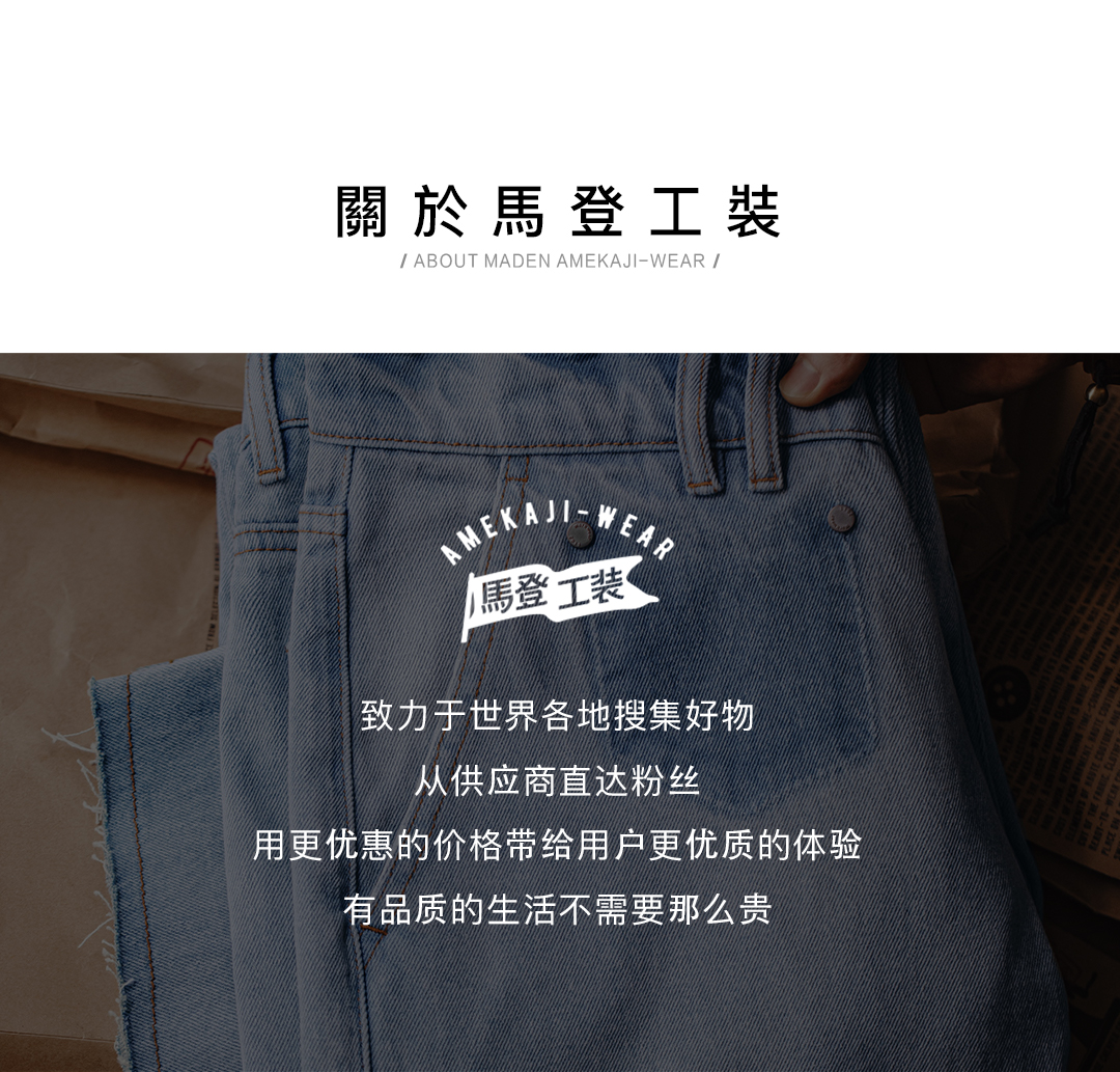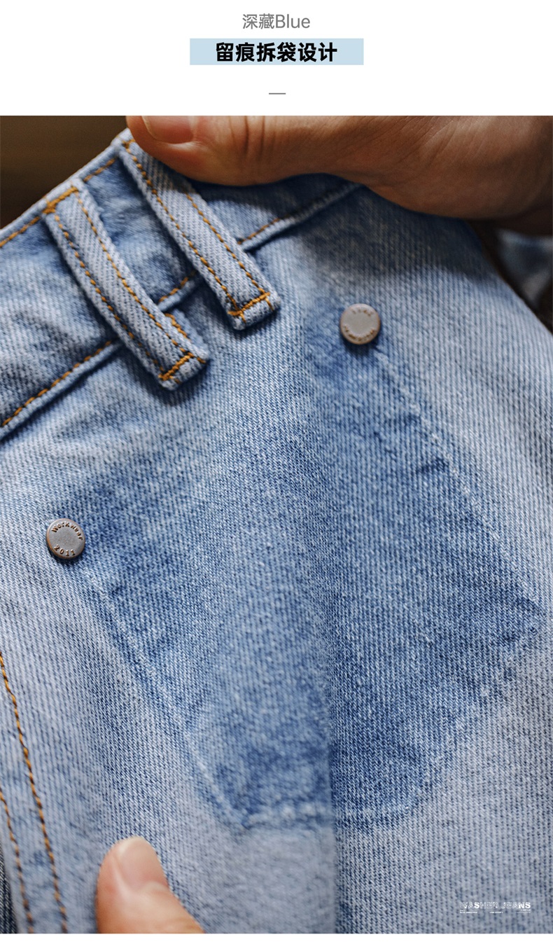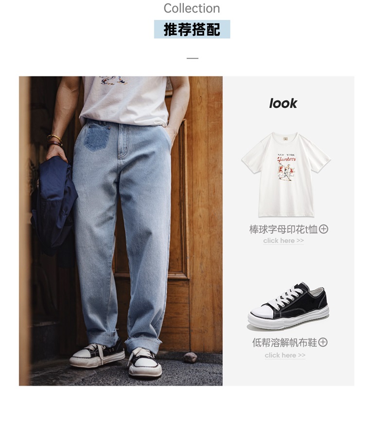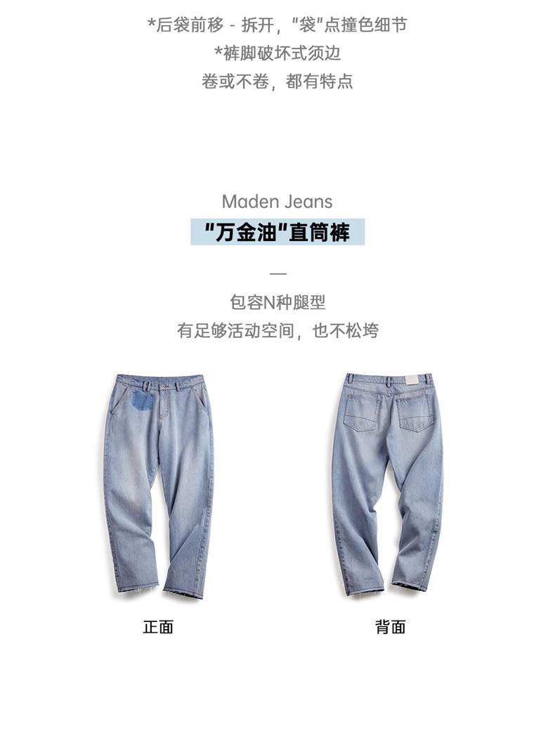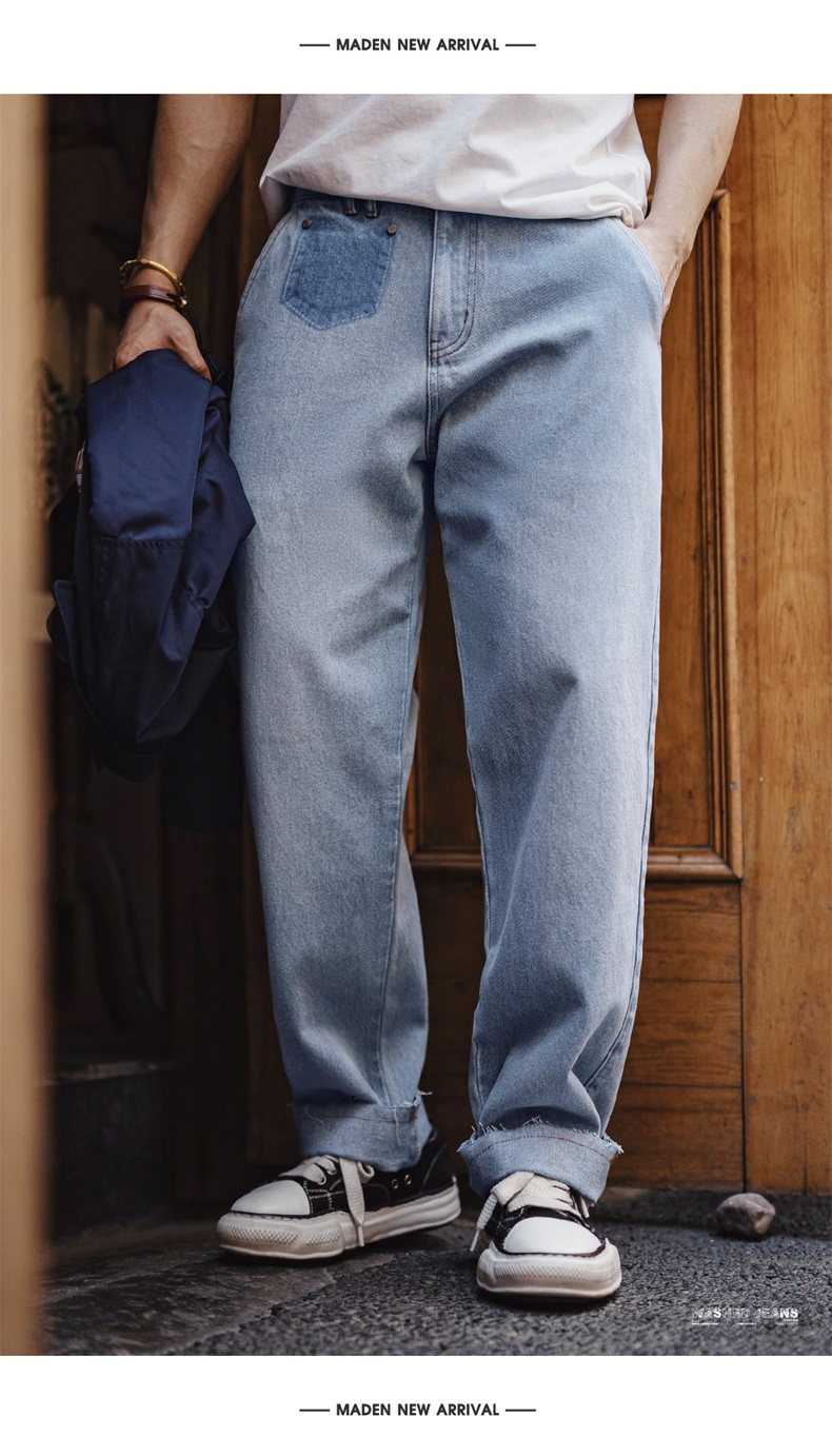 工装优选美式复古水洗蓝丹宁牛仔裤纯棉毛边直筒休闲老爹长裤男秋