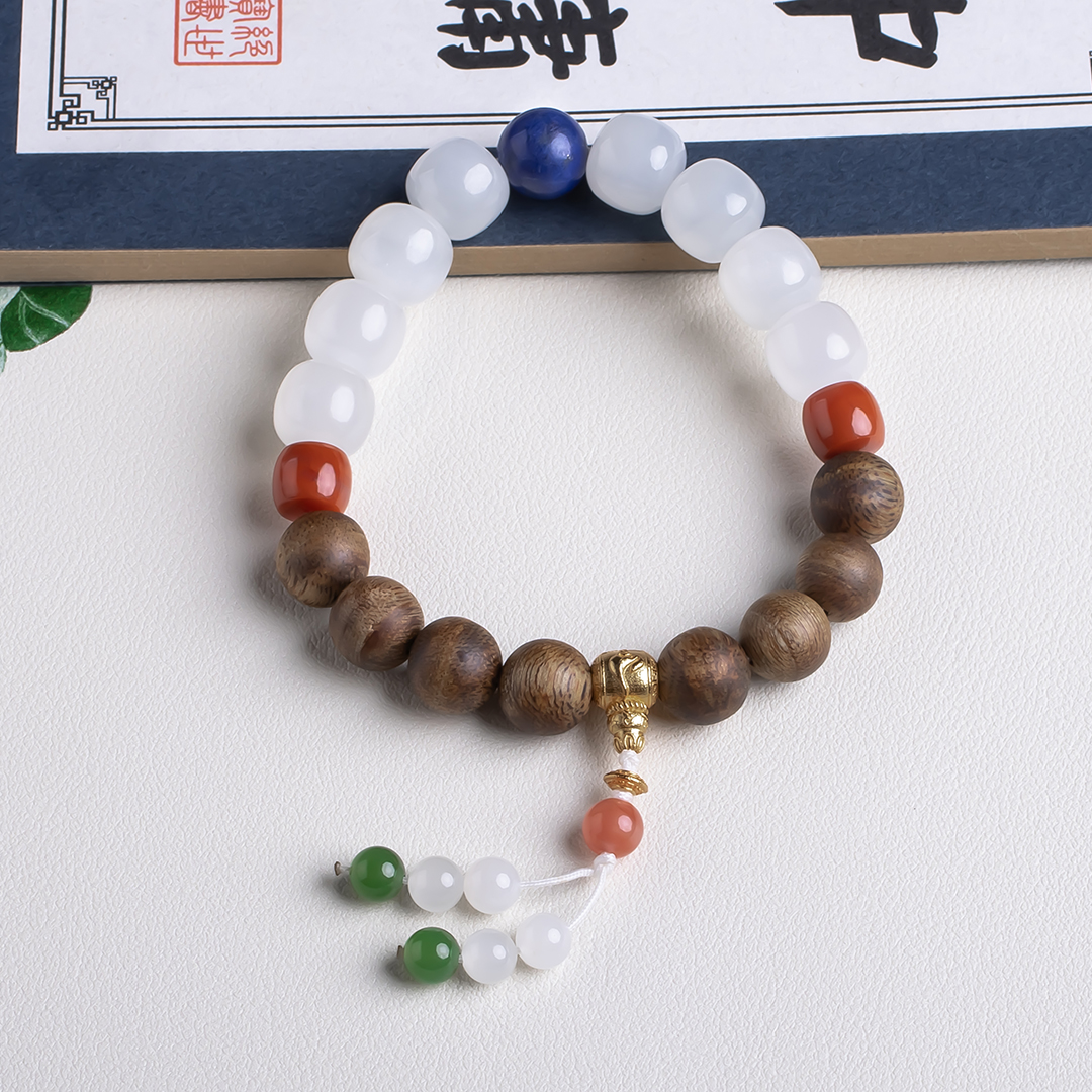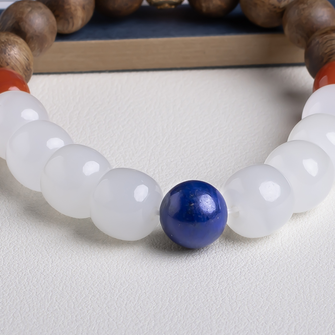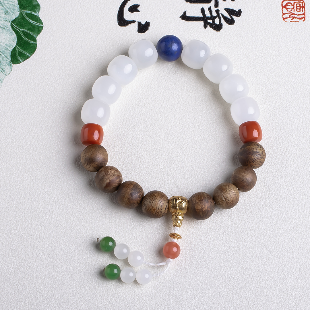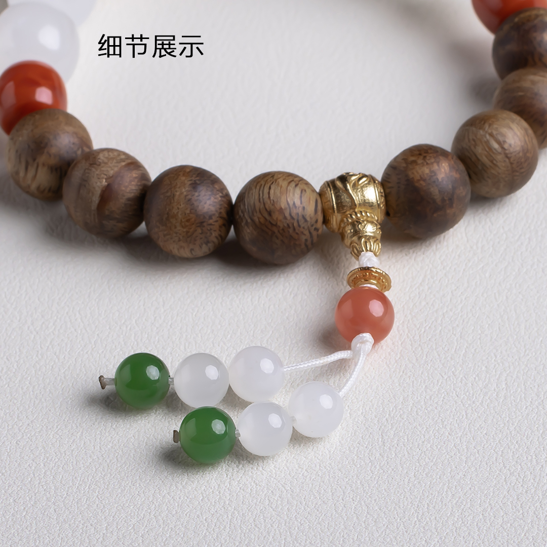 xy0432沉香+和田玉青金石手串,天然沉香约10.3mm,原色原味,香味自然清甜,羊脂白白和田玉再搭青金石、南红,经典三大国玉相搭,三色碰撞,东方神韵,一枚银镀金三层佛塔三通,吉祥纳福。