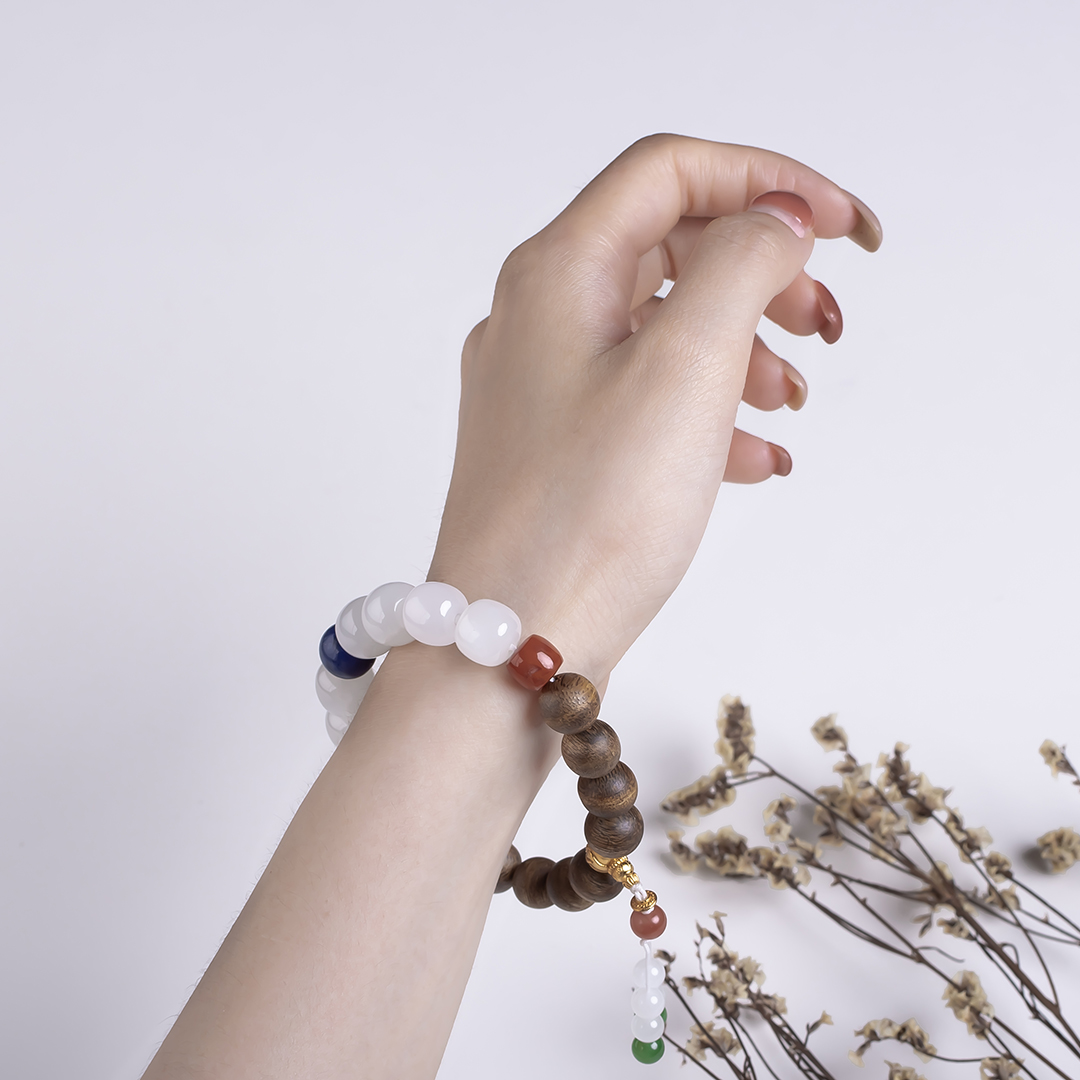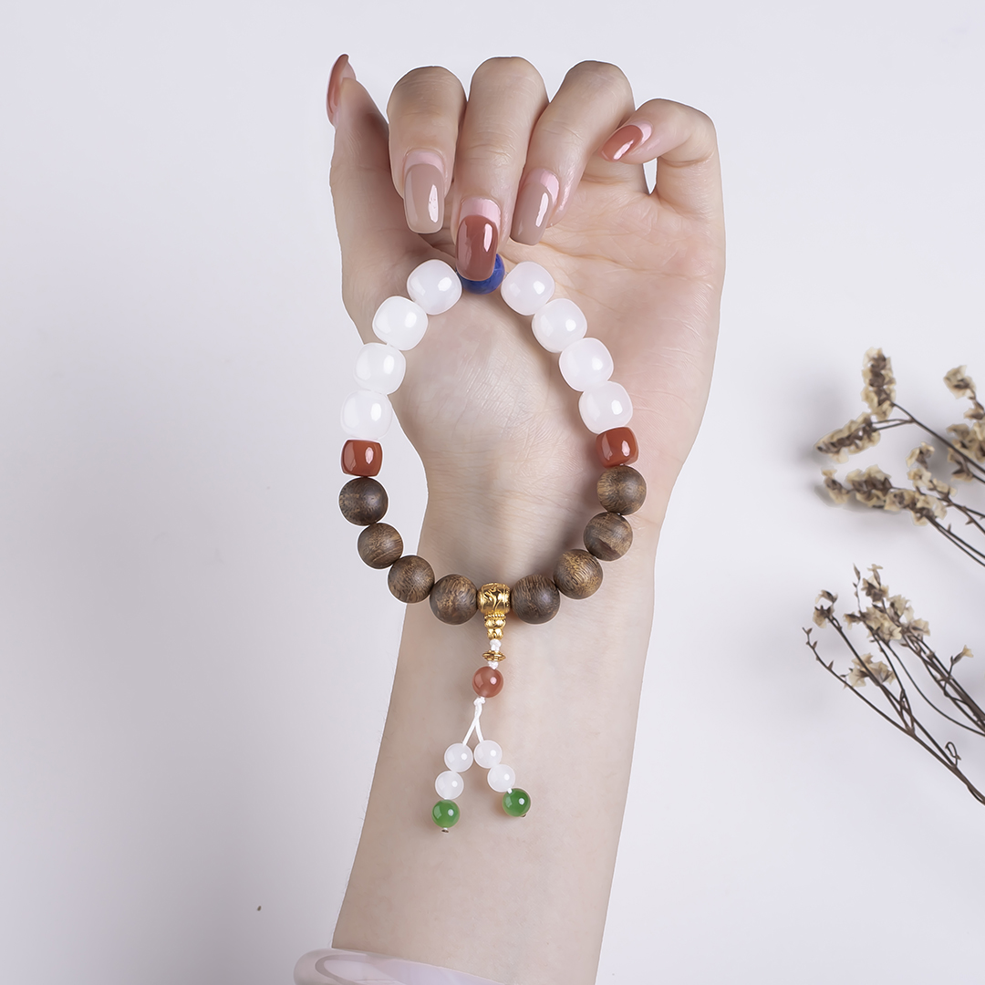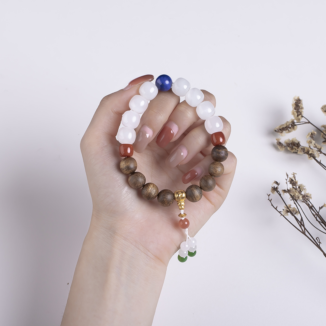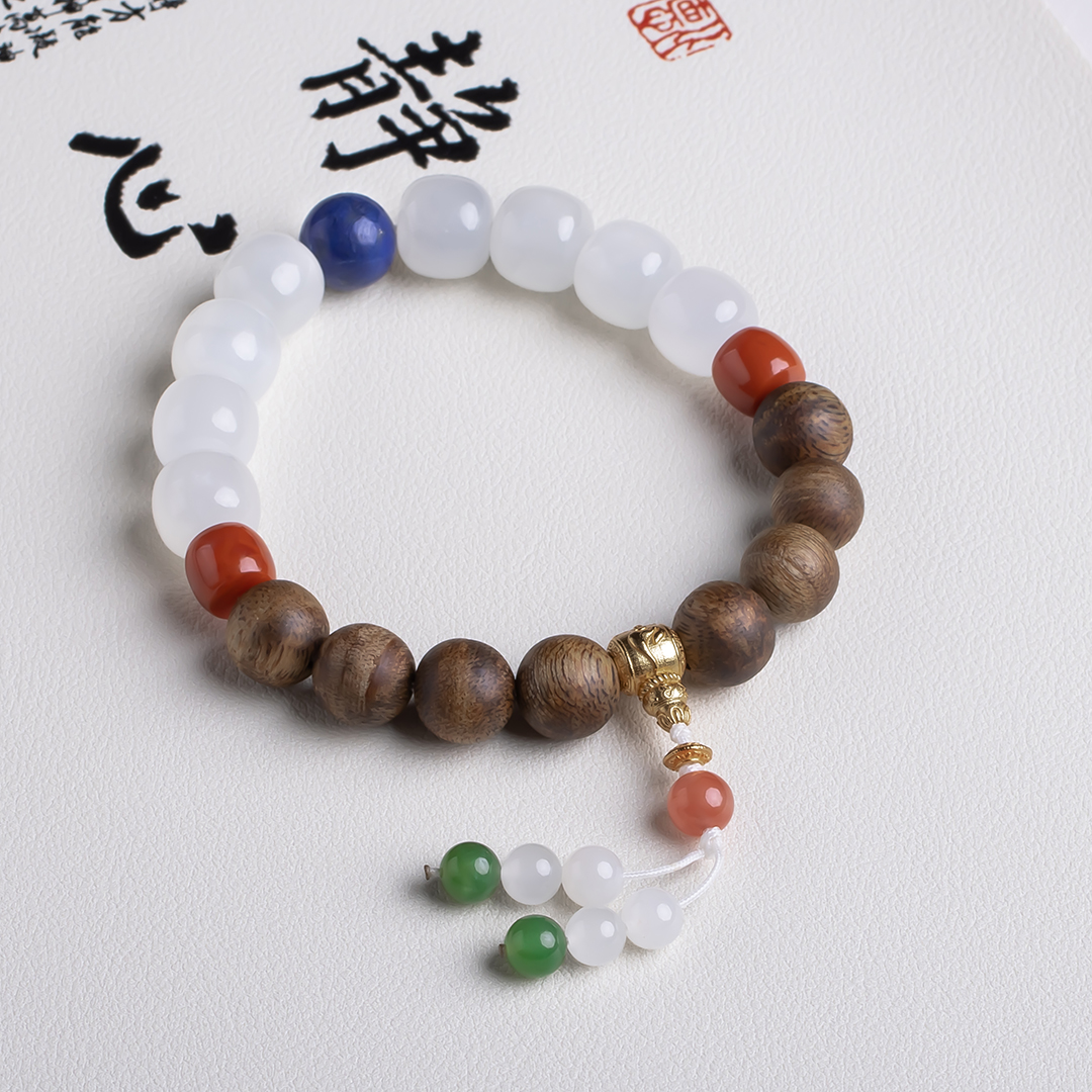 xy0432沉香+和田玉青金石手串,天然沉香约10.3mm,原色原味,香味自然清甜,羊脂白白和田玉再搭青金石、南红,经典三大国玉相搭,三色碰撞,东方神韵,一枚银镀金三层佛塔三通,吉祥纳福。