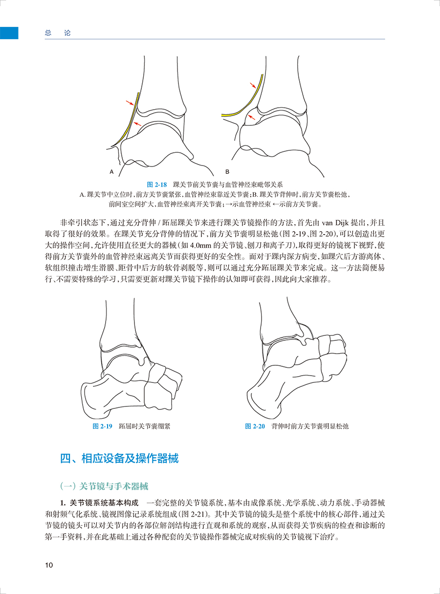 本书总论分3章,第一章对关节镜的历史、踝关节镜的发展脉络以及踝关节镜手术的基本技术特点和必要准备等给予阐述。第二章“踝关节镜常识和基本技术”对踝关节的手术开展如何准备给予详细的解读。第三章“后踝关节镜”则对后踝间室这一踝关节镜特有的操作部位如何开始手术展开阐述。各论共9章,包括了踝关节撞击、距骨软骨损伤、踝关节骨关节炎、踝关节类风湿关节炎、跖腱膜炎和跟骨骨刺、跟骨骨囊肿、跟腱腱病、距腓前韧带重建”等8种踝关节临床最常见的疾病的关节镜下治疗要点,最后一章则对踝关节镜下常见并发症及预防进行了总结。整部书的构架清晰,条例清楚,针对性强,全书每一章节都辅以大量的针对性图片,大大增加了全书的可读性。