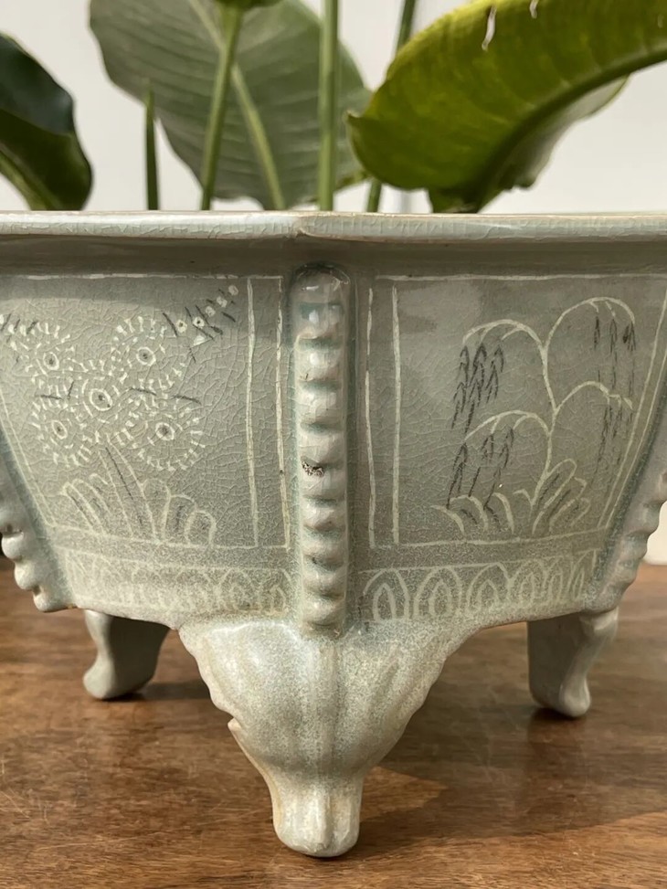 这是一件朝鲜半岛所烧制的青瓷大香盆,尺寸碩大,口沿达25厘米宽,重逾两公斤的折沿六方三足香炉,炉身六面外壁黑白象嵌花卉与垂柳紋饰,折沿白象嵌卷草纹,炉身下方仰莲纹边饰,下方弯曲蕉叶纹三足,除足低露胎外,全器覆盖细开片灰青釉,黑白象嵌技艺呈现出典雅流畅的画面,是典型朝鲜半岛高丽时代流传的象嵌青瓷器物风格,具备朝鲜半岛陶瓷特有的独创与自由奔放特质,纹饰风格洒脱豪迈,搭配碩大器身更显典雅独特。足底无釉,露胎处砖红色。