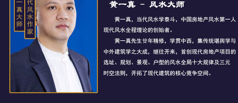 黄一真先生学贯中西,集传统堪舆学与中外建筑学之大成,继往开来,首创现代房地产项目的选址、规划、景观、户型的风水全局十大规律及三元时空法则,开拓了现代建筑的核心竞争空间。