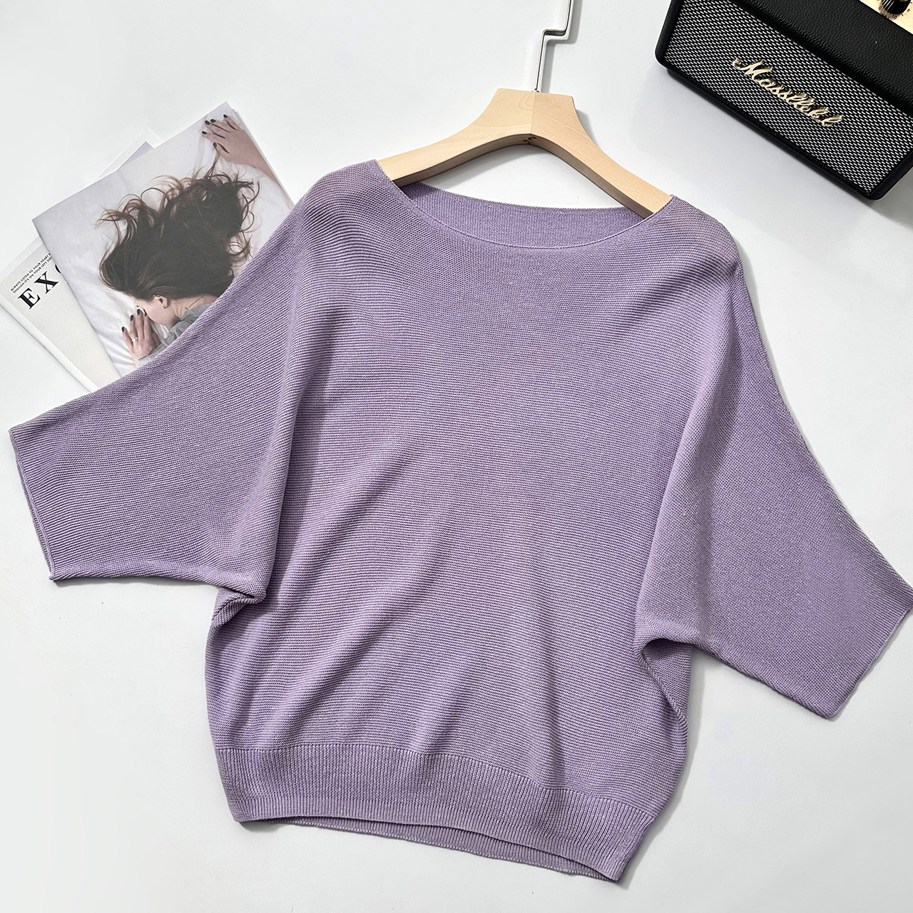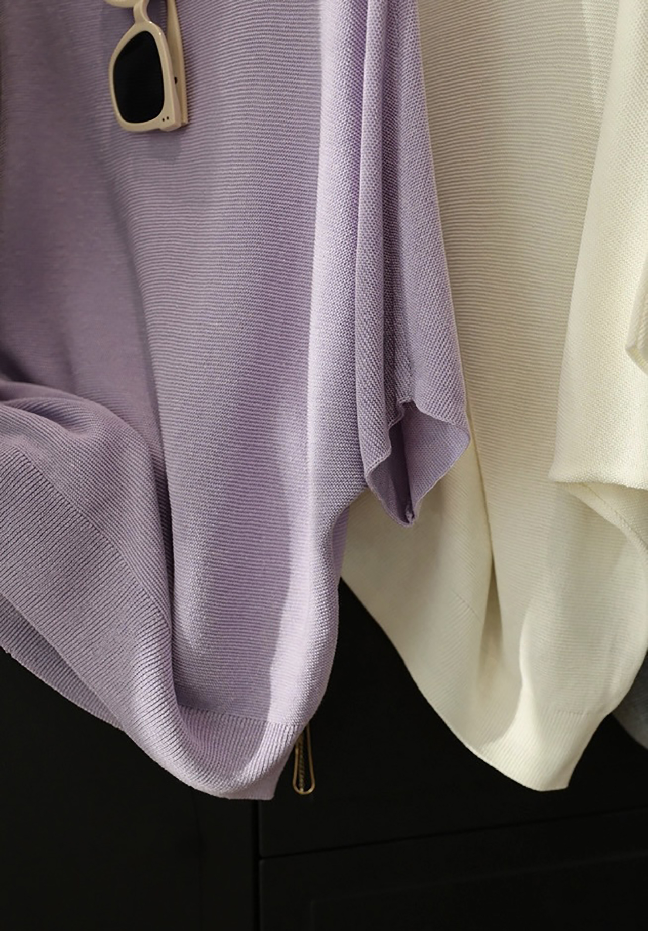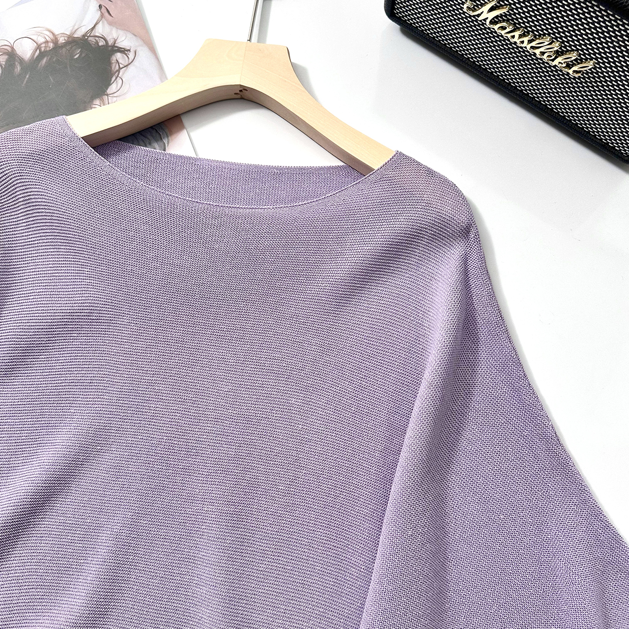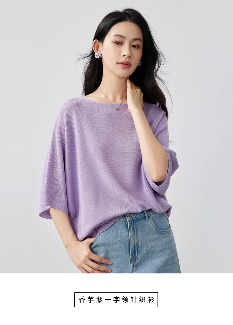 今天就给大家介绍一款,香芋紫一字领针织衫。