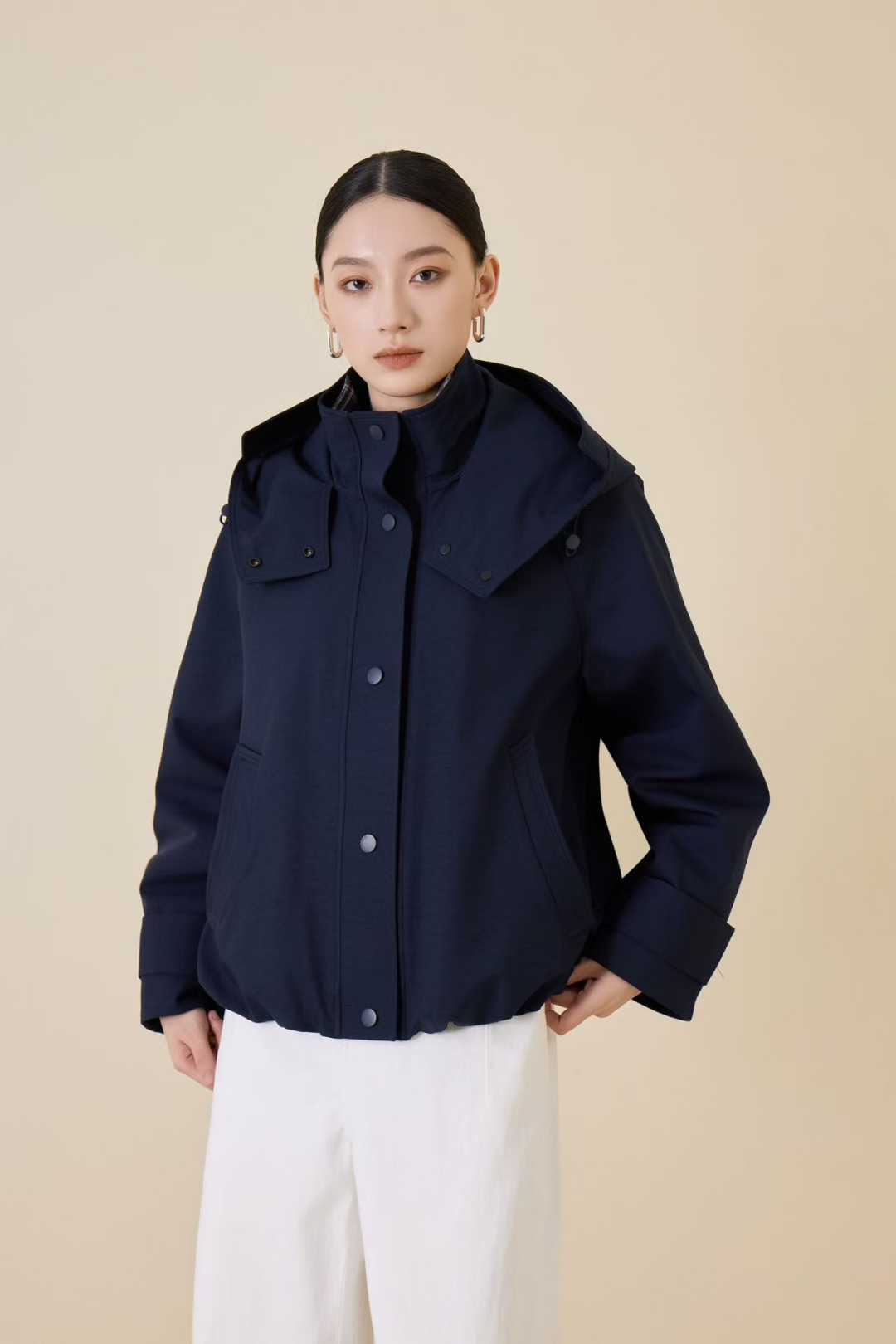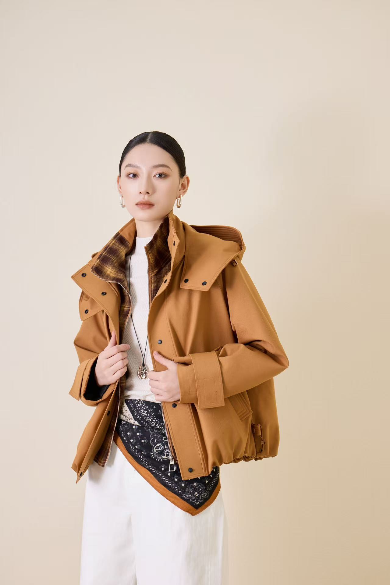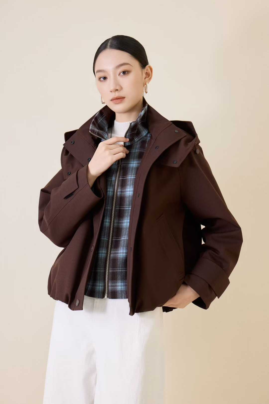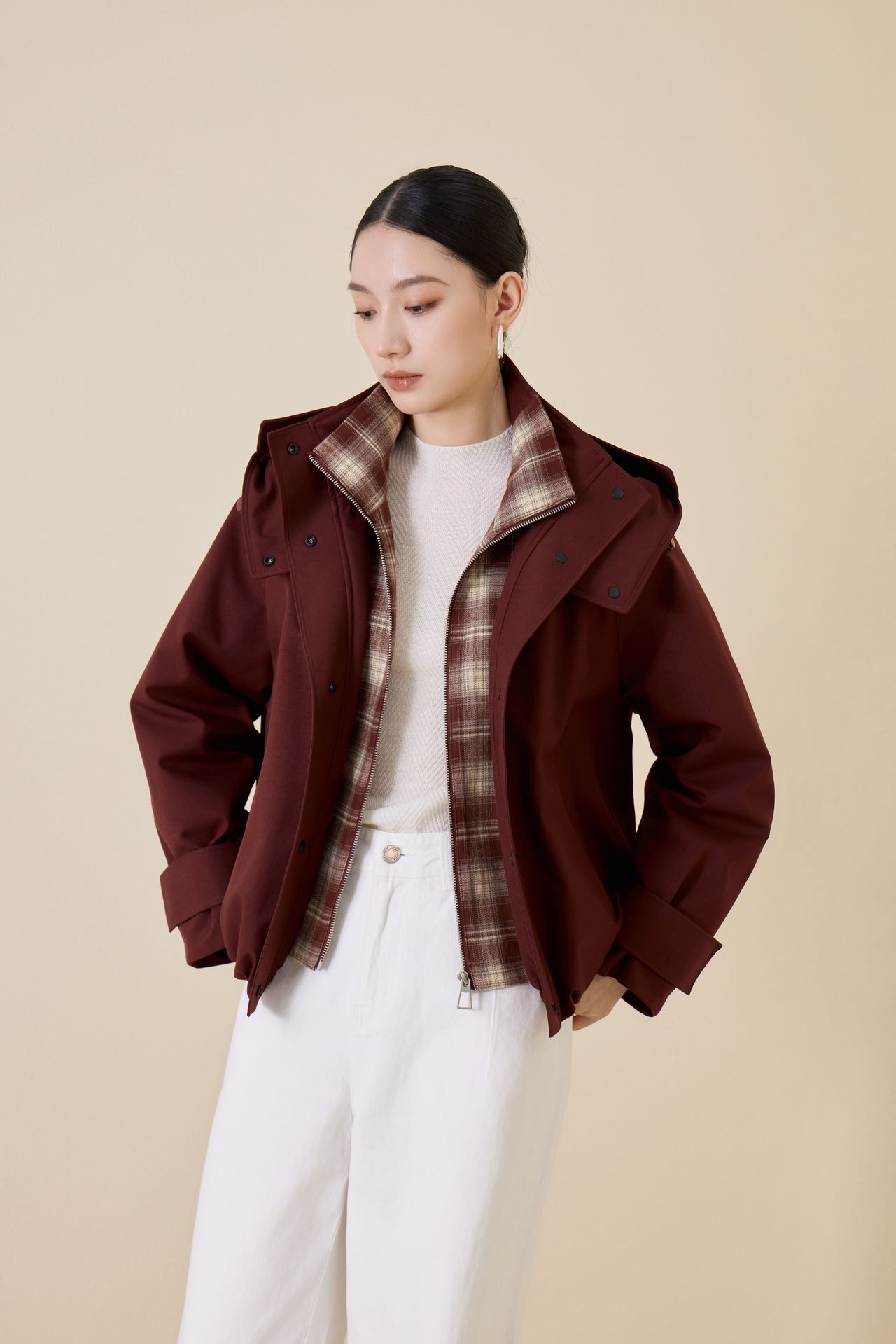 SZ6R19_顺圣色/朱樱色/帝释青色_羽绒服_冬季_连帽格纹撞色内衬短款宽松_高级女装_BERNIEELEN 伯妮斯茵