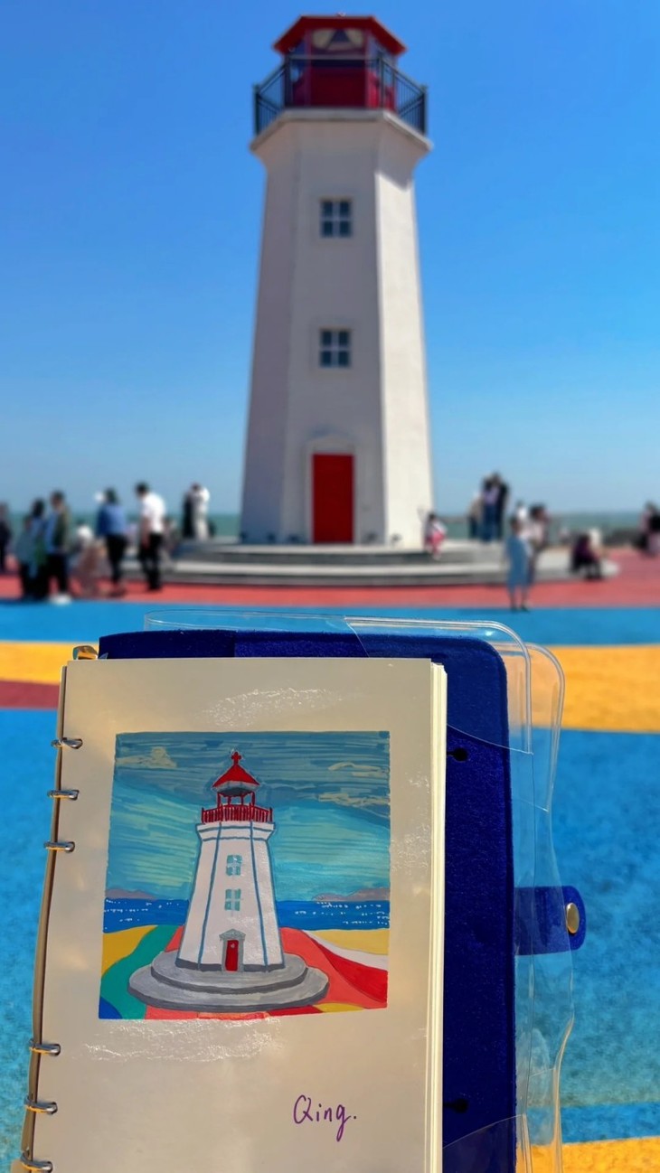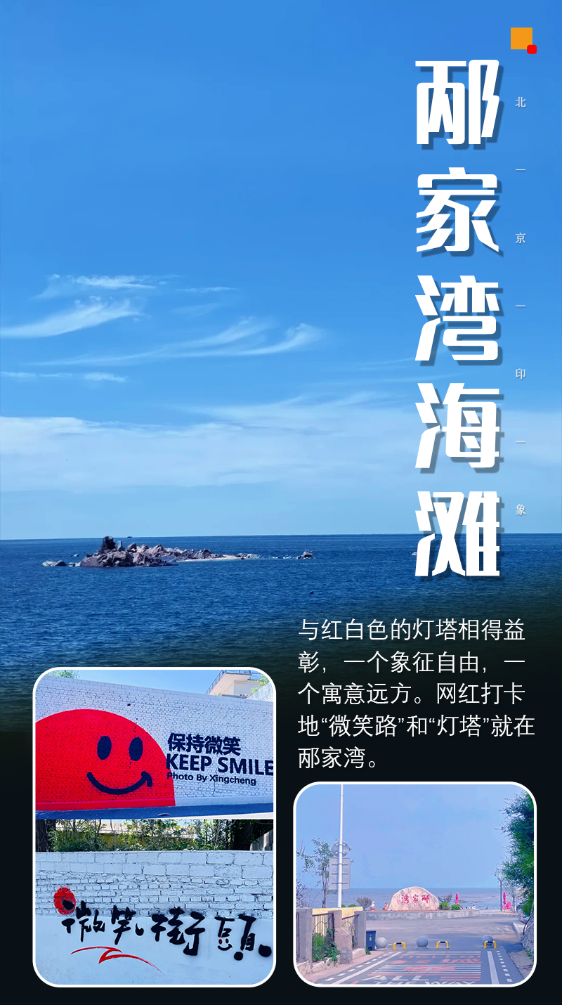 “向海风许愿,在山海相见”“风吹又日晒,自由又自在”……微笑路上的一道道橙白相间的标语,是看在眼里的诗意,是踩在脚下洒脱。与红白色的灯塔相得益彰,一个象征自由,一个寓意远方。网红打卡地“微笑路”和“灯塔”就在邴家湾。