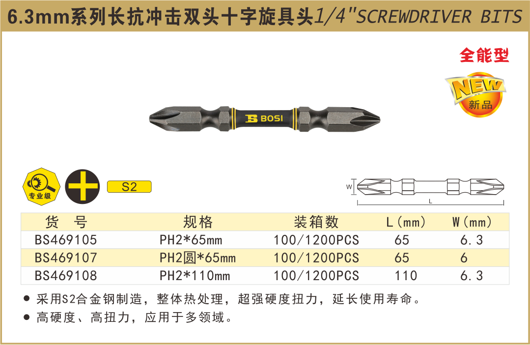 波斯 6.3mm系列长抗冲击双头十字旋具头 PH2*65mm--T BS469105