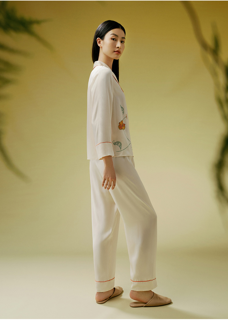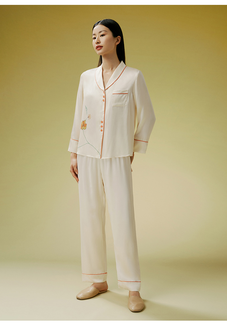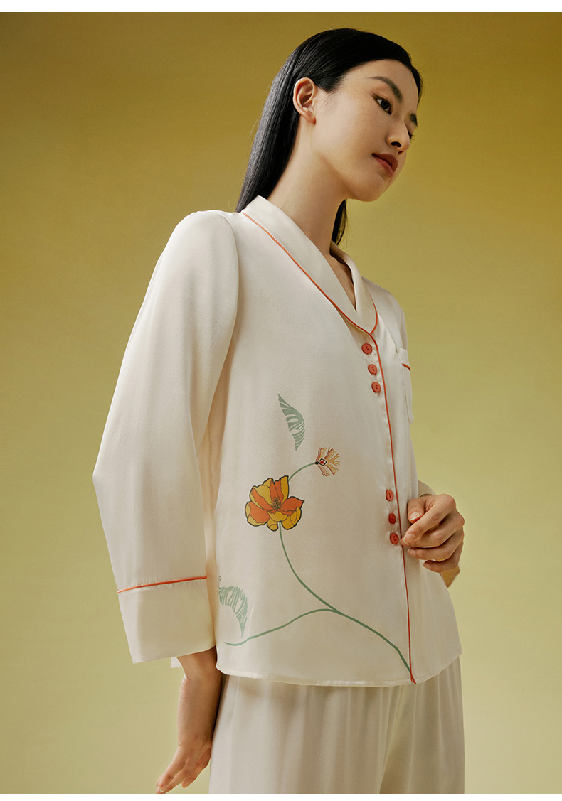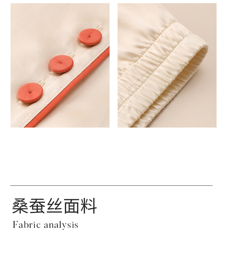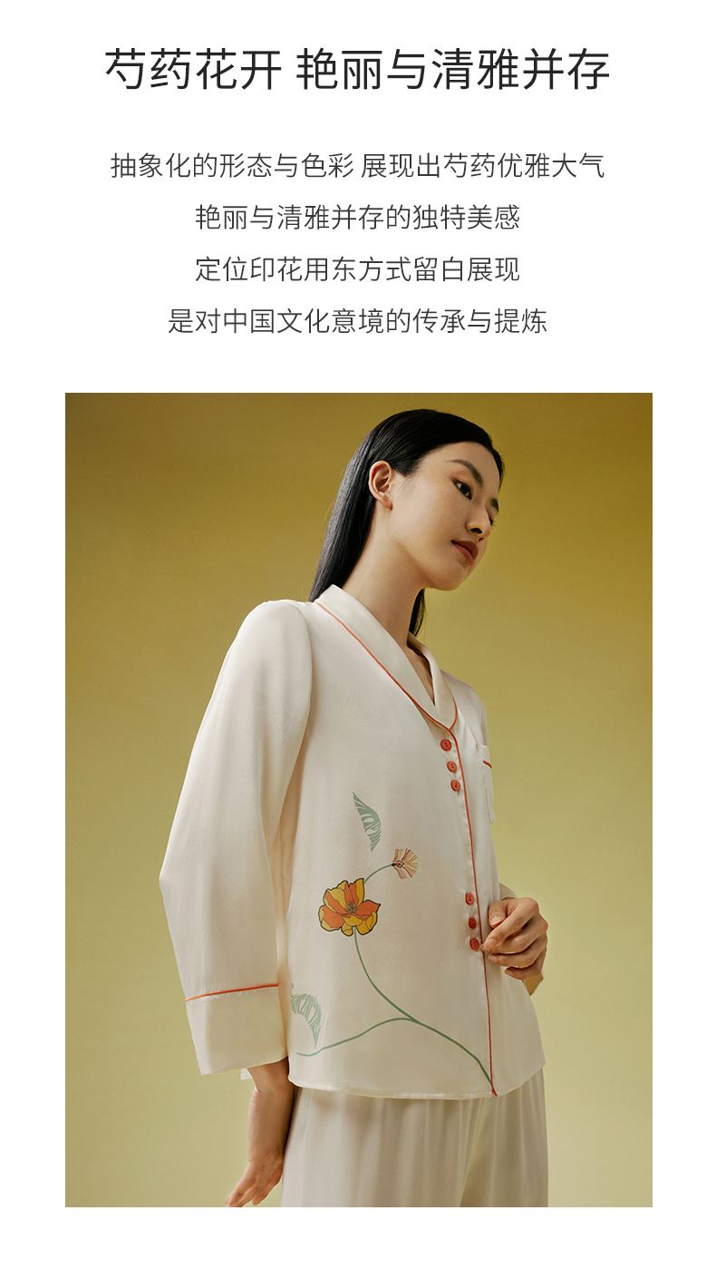 【一支芍药】100%桑蚕丝中式青果领长袖衣裤套宽松真丝睡衣家居服金三塔 YSFDC204