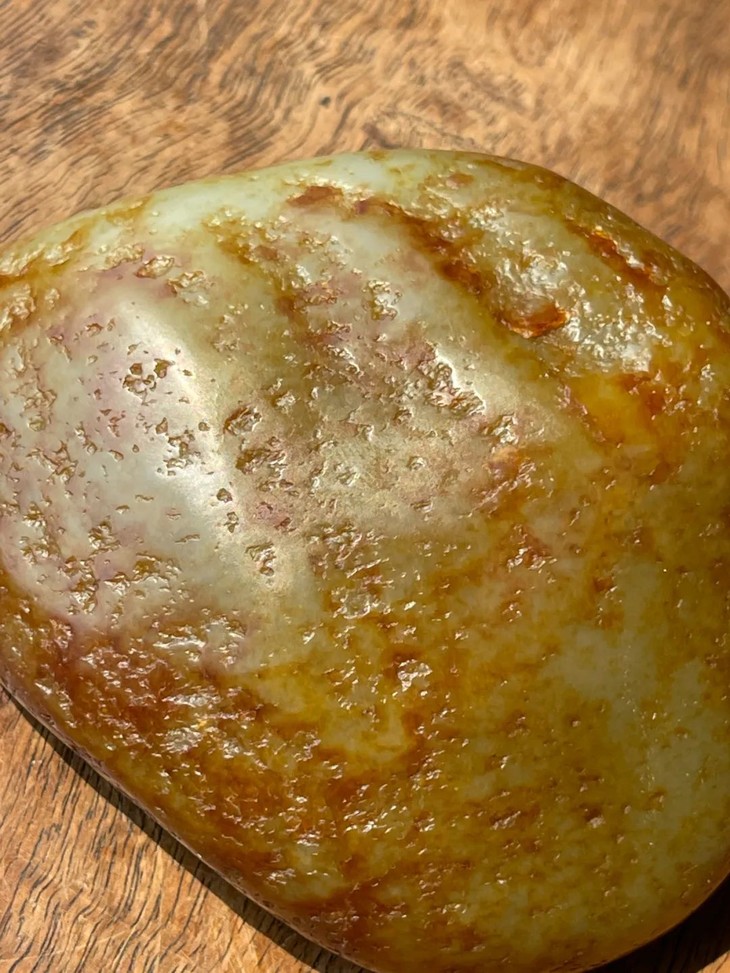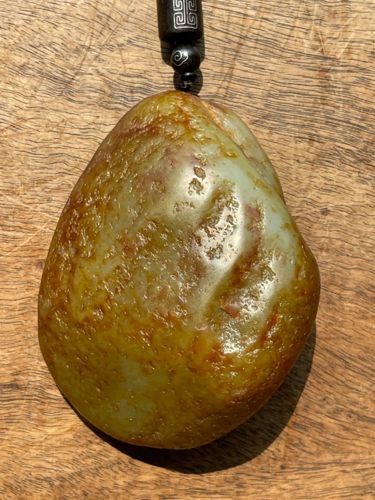 这是一件尺寸大、重逾三百三十公克的新疆和田秋梨皮籽料白玉原石籽儿随形雕琢龙纹而成的把玩原石,取材和田籽料带俗称秋梨皮的洒黄金沁皮的籽料白玉原石籽儿,玉质细腻油润,籽料白玉等级的质地,正面巧色深刻蟠龙纹,皮下籽料白玉洁白略青,背面保留洒金沁秋梨皮之籽儿原形,表面光泽如凝炼的油脂,籽儿原皮具天然凹沁点,包浆皮壳温润细腻,尺寸大、圆融饱满的原石籽儿,玉质细腻,洒金沁秋梨皮色自然流畅、艳丽迷人,掌中尺寸,随型手握舒适宜人,搭配绳结项链,入手即可佩戴与盘玩。