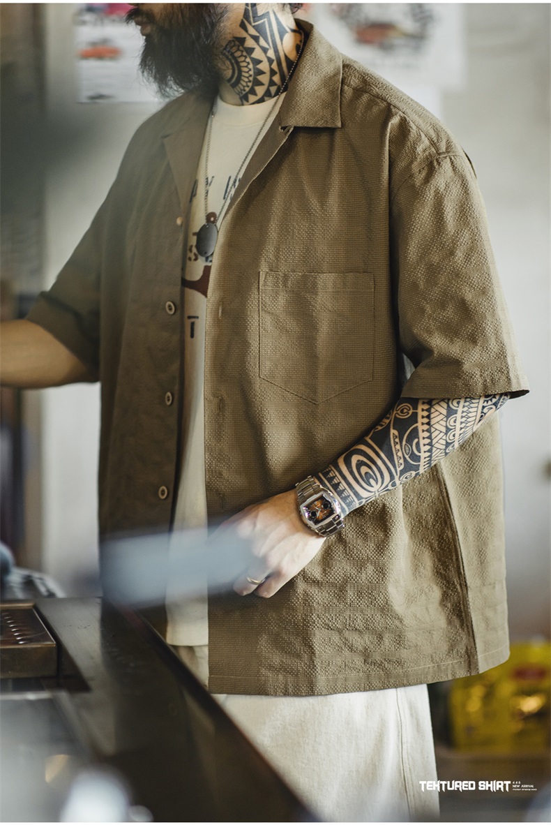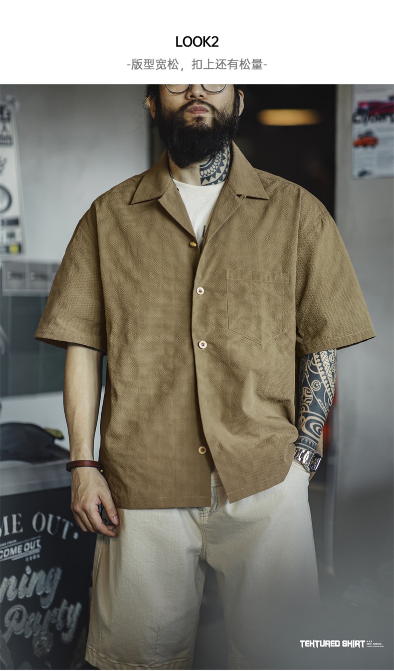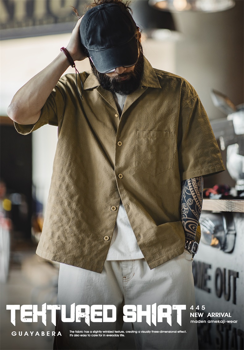 马登工装美式休闲褶皱肌理感短袖衬衫梭织提花宽松古巴领衬衣男夏