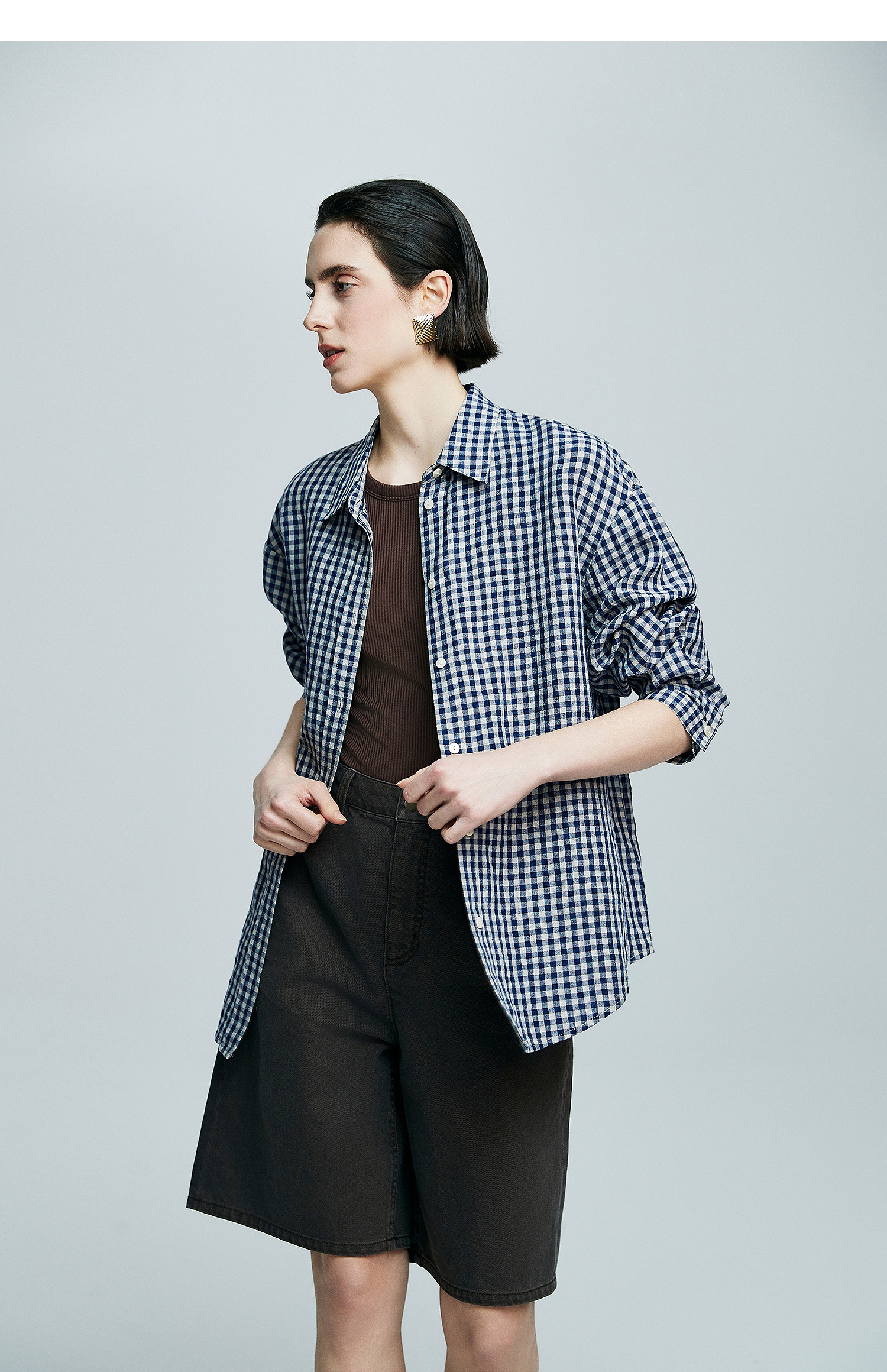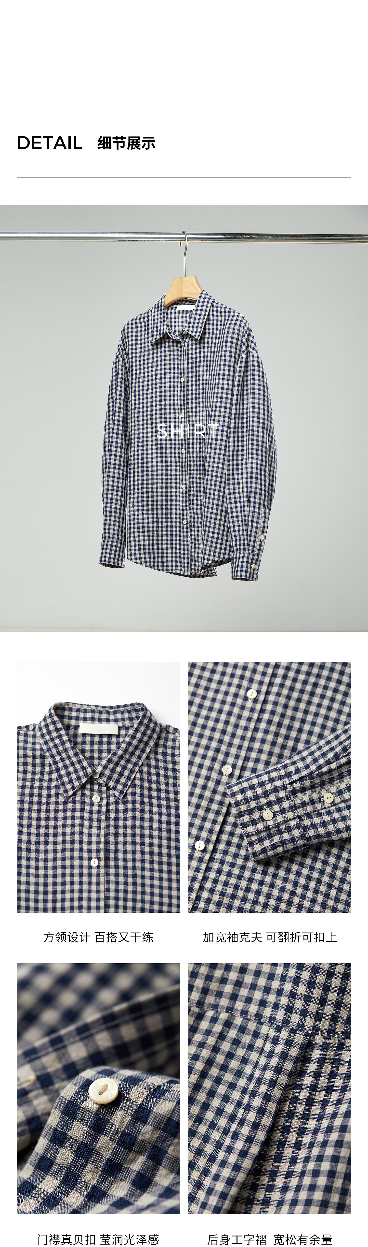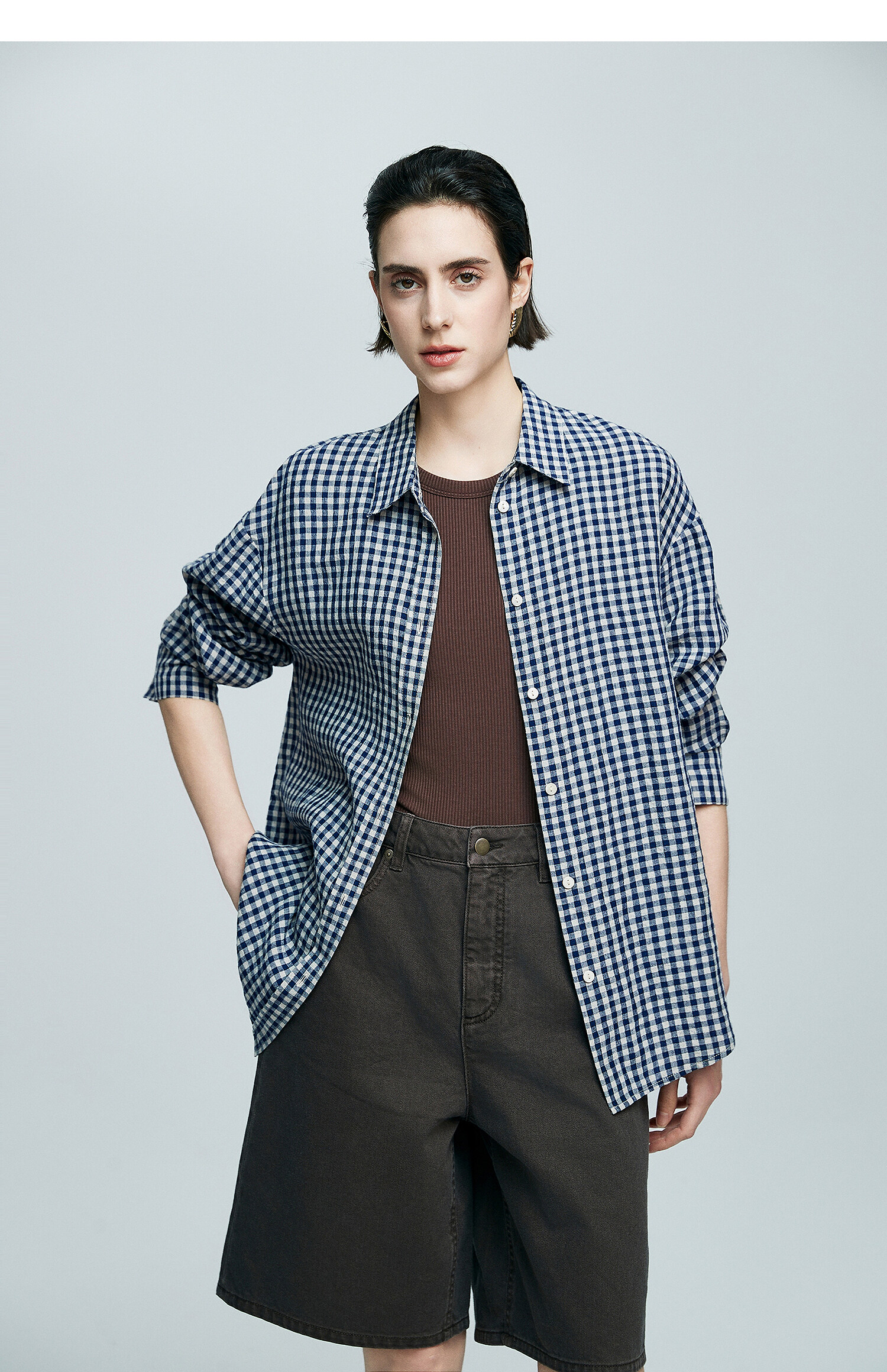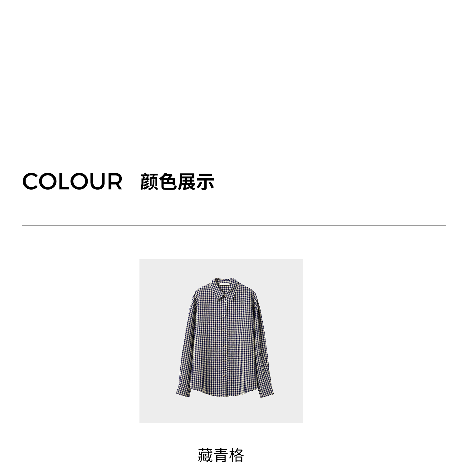 棉仓362604041-初棉亚麻色织格纹方领宽松藏青白格子衬衫